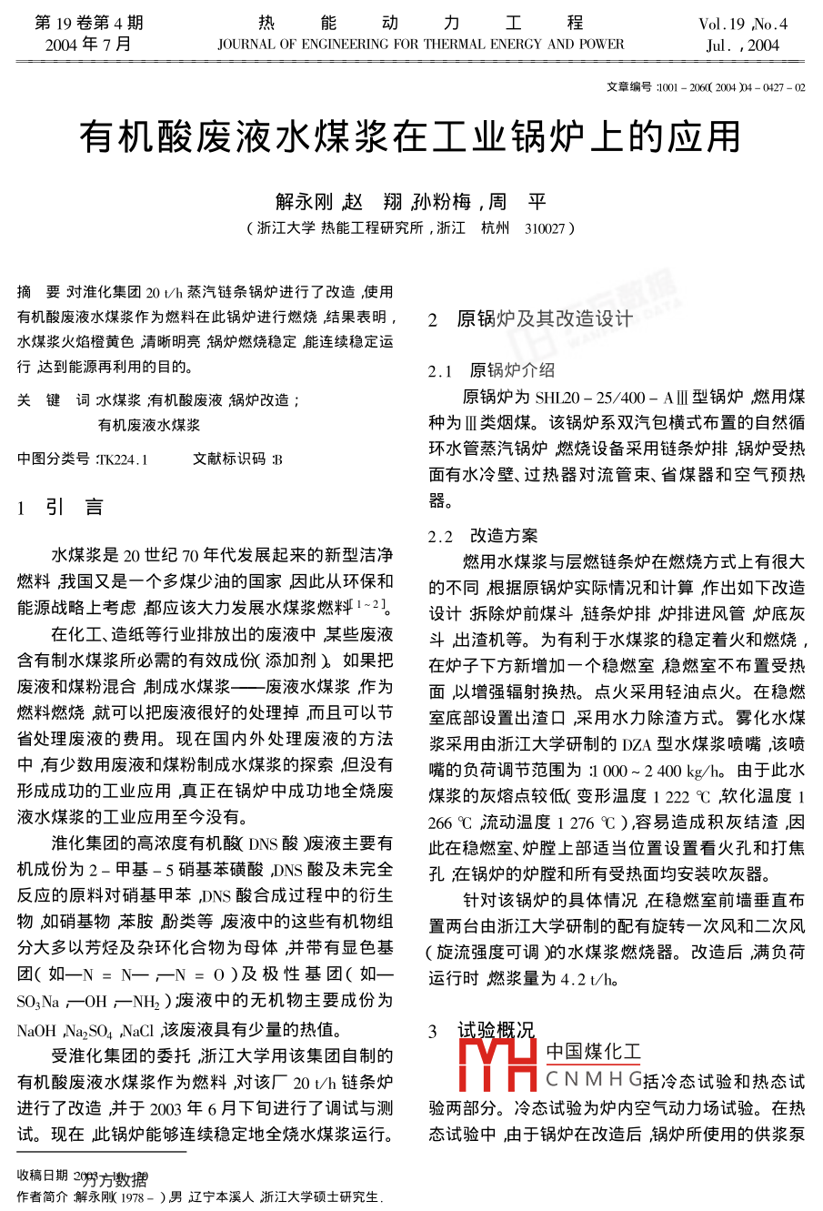 有機(jī)酸廢液水煤漿在工業(yè)鍋爐上的應(yīng)用