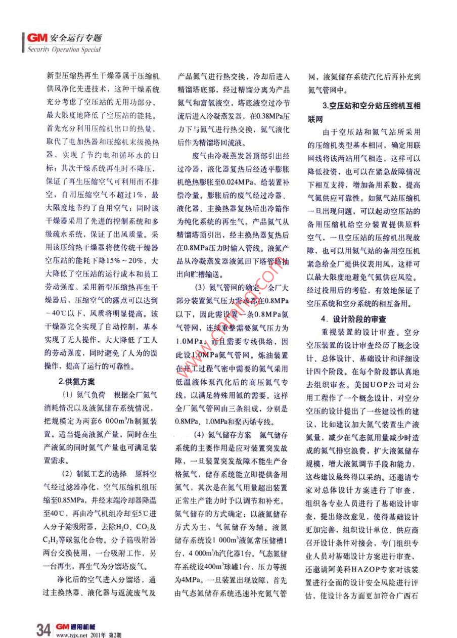 cM安全運行專題Security Operation Special新建煉廠空分空壓裝置設(shè)計安裝及安全開工問題的探中國石油廣西石化公司(欽州535008)王著曉【擴要】介紹了新建煉廠空分空壓裝置從整休設(shè)計優(yōu)化,機組配置、力是不大于1200a,是代替目前所安裝調(diào)試及開工階段的實踐過欄,重點論還了空分萇置建設(shè)中整體生產(chǎn)方案用板式過濾器最理想的設(shè)備。的確定和新技術(shù)的應(yīng)用。對其中存在問題進行了深入分析,提出了具體的建自潔式過濾器能實現(xiàn)自動控制、自動清潔、無人操作。大大降【關(guān)鍵詞】空分空壓設(shè)計開工探討低了員工的勞動強度,同時提高了機組吸入口空氣的質(zhì)量,延長了機廣西石化1000萬va爍油工程是高,國內(nèi)傳統(tǒng)的入口過濾器一般選組的運行平穩(wěn)率和運行周期。因此國家煉油工業(yè)“十一五”發(fā)展規(guī)劃用板式過濾器,該過濾器在日常運在本次選型中將此項技術(shù)全面地運中的重要項目,工程總投資152億行中必須按操作規(guī)范更換過濾網(wǎng),用到整個空壓站系統(tǒng)中,大大降低元??辗挚諌貉b置是為該煉油項目過濾網(wǎng)更換周期較短且過濾網(wǎng)造價了系統(tǒng)的運行成本,是一個非常好配套的公用工程之一,目前該裝置較高,每次更換數(shù)量多,而且勞動的節(jié)能降耗項目。已經(jīng)投入使用,本文綜述了空分空強度較大,在更換過濾網(wǎng)期間發(fā)生(2)全廠壓縮鳳統(tǒng)一為凈化壓裝置從設(shè)計階段、安裝階段,開壓縮機運行波動,造成機組運行成風煉廠供風系統(tǒng)一般采用凈化風工階段的工作,可作為今后新建煉本上升。和非凈化風。凈化風就是通過干燥廠空分空壓裝置在設(shè)計、安裝、開自潔式空氣過濾器是機電體系統(tǒng)去除空氣中的雜質(zhì)和水。非凈工過程中的參考化的設(shè)備,能在微型計算機的控制化風是經(jīng)過壓縮機后沒有經(jīng)過干燥下實現(xiàn)空氣的過濾和過速元件的自的氣體,含水量較多。廣西欽州常設(shè)計階段動清潔。該過濾器的阻力損失小,年高溫高濕,空氣濕度常達到80%1供風方案確定適應(yīng)空氣濕度范圍廣,自耗空氣量以上,由于臨海,腐蝕非常嚴重。(1)壓縮機入口過濾器采用脈極小,僅為0.3m/mim,過濾粒度不全廠統(tǒng)一凈化風后首先可以提高全沖反吹自潔式過濾器離心空壓機大于2μm,在技術(shù)參數(shù)中它設(shè)計初廠供風水平,避免凈化風負荷突然在運行中對吸入的空氣質(zhì)量要求很阻力為不大于150Pa,而設(shè)計終阻增大而無法滿足的狀態(tài),可以迅速cM園用堿安全運行專題cMSecurity Operation Special地滿足凈化風的用量;其次可以減空壓機制造廠商工作周期短的缺點少帶水工業(yè)風對管網(wǎng)的腐蝕,有利(4)選擇壓縮熱干燥器現(xiàn)有微熱再生空氣干燥器是在無熱于今后的管理工作,減少管道的漏的干燥技術(shù)主要有3種:無熱式再生再生方式的基礎(chǔ)上設(shè)計的一種新穎損;第三可以提高環(huán)境質(zhì)量,工業(yè)干燥技術(shù)、微熱式再生干燥技術(shù)和工藝,它避免了無熱再生干燥器切用風在放空時會產(chǎn)生大量的銹蝕氣壓縮熱再生干燥技術(shù)。這3種干燥技換時間短,干燥空氣損耗量較大的體,污染環(huán)境,采用凈化風后可以術(shù)的主要技術(shù)指標見下表。缺點,使切換周期達60min,損耗量避免對大氣造成的污染。開工后證無熱式壓縮空氣干燥裝置是根由5%減少為4%左右,但是它仍存明,在沿海地區(qū)非凈化風改為凈化據(jù)變壓吸附的原理,對壓縮空氣進在入口壓縮空氣需冷卻、電耗較高風后,是降低投入、減緩腐蝕的有行干燥的一種設(shè)備,在一定的壓力的問題效措施。下,壓縮空氣自下而上流經(jīng)吸附劑壓縮熱再生式干燥是利用空(3)機組配置鑒于全廠層(干燥床),在常溫高壓下,吸壓機壓縮空氣時產(chǎn)生的熱量使干燥壓縮空氣負荷情況,選用了三臺附劑吸收空氣中的水分,使壓縮空筒內(nèi)的干燥劑升溫,耗水量、耗電300m/min進口離心式空氣壓縮機,氣得到干燥。用少量的干燥空氣與量.耗氣量都非常少,是三種干燥其中兩臺運行,一臺備用??諝鈮何絼┙佑|,從而除去被干燥劑吸技術(shù)中最為先進的技術(shù)。所以此次縮機出口壓力為08MPa,這樣既可附的水分,并排出機外,使吸附劑千燥系統(tǒng)選型,選用了最為先進的以滿足全廠的用風需求,也可以為得到再生。從無熱式再生干燥的技壓縮熱干燥技術(shù)今后擴建用風量留有余地。術(shù)特性可以看出:無熱式再生干燥根據(jù)全廠凈化壓縮空氣負荷的選用進口壓縮機主要考慮到降的電耗很小,但是它同時存在入口情況,選用三套300m/min壓縮熱再低能耗,延長運行周期,降低維修壓縮空氣仍需冷卻,再生氣量高,生干燥器,兩套運行,一套備用。費用,提高供風的可靠性,由于供幾種干燥技術(shù)主要指標對比表風系統(tǒng)擔任著主要煉油裝置的儀表項目無熱式再生干燥微熱式再生干燥宿熱再生干燥風供應(yīng),一旦供風出現(xiàn)故障必將對露點℃≤-40裝置的運行帶來很大影響,輕者會入口溫度/C≥120打亂裝置操作,重者造成裝置停工再生耗氣量(%)甚至會造成次生災(zāi)害,因此壓縮機耗電/(kWh)≤020.5-10的選型考慮了國外先進制造水平的201年第用33cM安全運行專題Securin Operation Special新型壓縮熱再生干燥器屬于壓縮機