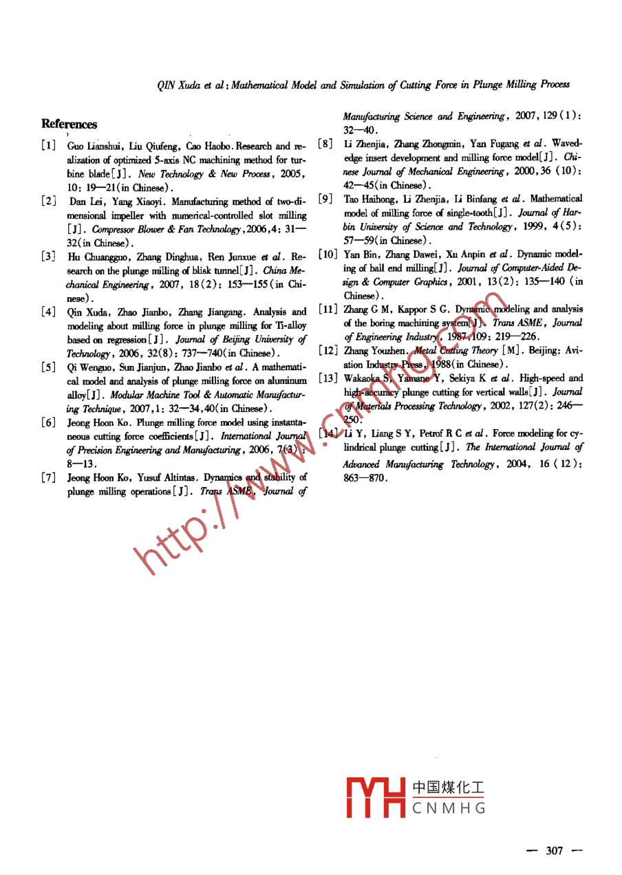 Transactions of Tianjin UniversityISSN1006-4982pp303-307Vol.13 No.4Aug.2007Mathematical Model and Simulation of Cutting Force inPlunge Milling ProcessQIN Xuda(秦旭達) , ZHAO Jianbo(趙劍波)',LIU Huanling(劉煥領(lǐng))' , ZHANC Jiangang(張劍剛)' ,ZHAO Wei(趙偉) , TIAN Ying(田穎)', TOM 0 Mulle2,NI Wangyang' , IU Yixiong2(1. School of Mechanical Engineering, Tanjin University, Tanjin 300072, China;2. Kennanelal lnc. Latrobe, PA 15650, USA)Abstract: Plunge milling is a high-speed machining way and the cutter is fed in the direction of the Zaxis, which is used to remove excess material rapidly in roughing operations. In this paper, the or-thogonal cutting theory was used to study the plunge milling of LY12 alloy. A mathematic model forcutting force in plunge milling was established, and the milling process was simulated by using Mat-lab. It is found that the single tooth cutting experimental result is unstable because of unsymmetricalsingle tooth in the milling process, which leads to the difference between the simulation and experi-mental results. The trend of multiple teeth cutting experimental result is similar to that of the simula-tion result; however, the peak values in the experimental result are different, which is caused by theerror of cuttr's position, and the error of peak value is less than 10%.Keywords: plunge milling; cutting force; aluminium alloys; simulationPlunge milling, also called Z-axis milling, is one ofthe most efective machining methods in high speed metal4removal machining. As for curved surface of difcult-to-ma-chine material, slot-cut working and machining with longercutter of suspending length, the machining eficiency is bet-ter than that of the end milling method. As shown in Fig.1,the major diference between plunge milling and traditionalmilling is that the former can reduce the machining time byhalf. Furthemmore, it can also minimize distortion of work-Fg.1 Milling fore sketchpiece, reduce the radial cutting force acting on the millingmachine, prolong the overhang length, and slot-cut in thehigh temperature alloy material. When a high metal removal and quality of turbine blade millingl, And it was used inrate is desired or when machining aviation part with complex machining major diameter deep flow channel of two dimen-geometry, plunge milling will be considered first. Com- sional impeller'2J. Plunge milling was also used in roughpared with the end milling, plunge milling has the advan- machining blisk, and the machining ficiency and the vi-tages of high machining fficiency, short machining time,bration phenomenon could be improved obviouslyl31. Theand a good applicabilty in various machining circumstanc- model of milling fore in plunge milling was completedl4s1.es. It is suitable for the machining of prototype parts of The instantaneous cutting force cofficients to build plungesmall batch and the manufacturing of mass batch parts.milling force model6l, and the dynamics and stability ofIn China, plunge milling was used in turbine blade plunge milling operations were also raisedl7J .numerical control (NC) milling to improve the efficiencyTheoretical research on LY12 alloy, especially on theAcepted date:2007-03-16.QIN Xuda, born in 1973, male, Dr, asociate Prof.中國煤化工Tanjin UnivesityKen-# Supported by Advanced Manufacturing Technology-Kcy Laborntory of Beijingmetal Joint Project, Young 'Teacher Foundation of Tanjin Uaiversity, Appara:MYHCNMHGCorrespondence to ZHAO Jianbo, E mail:joetju@ 126. com.Transactions of Tianjin UniersityVol.13 No.4 2007simulation of cuting force, is limited. This paper focuses itmay be found that compared with the wear of the mainon modeling of ctting forces and compares the modeling re- cuting edge, the wear of the axiliay cuting edge is verysults with cuting experimental resuls. It is concluded that small, therefore, may be ignored. As a reault, the cttingorthogonal cuting theory can be uwsed in plunge milling.force of the main cutting edge is considered mostly[8].1 ExperimentThe experiment platform is showm in Fig. 2, whichconsists of NC CENTER ( BJNC7150),milling cutter,workpiece Al alloy (Type LY12), KISTLER measurementinstrument (TYPE 9257A), KISTLER signal ampliferFig.3 Insert geometry mep(TYPE 5006), data acquisition instument (NI PCI-6221MCard) and a computer. The data acquisition and analysissystem is based on LABVIEW software.Tab.1 Insert perametersL, W/mm .R/mm7/()Cuttec12.71.2151:AmplierKISTLER. SumpleAs shown in Fig.4, the width of cutting varies withthe tuming ang]e of the main axis of the machine , and there(a) Manufacturing tesing platdom(b) Data acquitin ytenis an angle between the undefomned chip thickness and thefeeding diretion in Fig. 4, therefore, the crose sectional"g.2 Cutting force espertnentarea of the undefomed chip can be obtained by multiplyingthe widh of cutting by the undeformned chip thicknesel9],The cutting condition is as fllws:i.e.Cutting speed- 250 m/min;Cutting feed- -0. 25 mn/tooth;Cutting width- -8 mm;Cutting depb- 30 mm.2Mathematical model of cutting forcebased on orthogonal cutting theoryFirstly, we 8sumne that there is no temperaturechange, no machine vibration, or cooling factor. VibrationFg.4 Catting wildthand surface roughness experiments were done. R。 is only0.264 pum with cuting speed 45 m/min, cuting feed 0.04mn/tooth and cutting widh 8 mm. The results show thatwg=R-_R-ar .the stability of plunge miling is good. According to the pe-∞s(a-φ)rameters and geometric dimension of cutter, and with the(1)direction of cutter edge and cutting velocity vertical, thehs=f:"cos k,cutting manner is approximated as right- angle cutting, whichis based on the theary of two-dimensional cuting. As shownA= waghsin Fig. 3, the main and auxiliary cuting edges are both(3)working in the milling proce8s. In Fig.3, L is the length ofarsin[ R-(R- a2Pφ