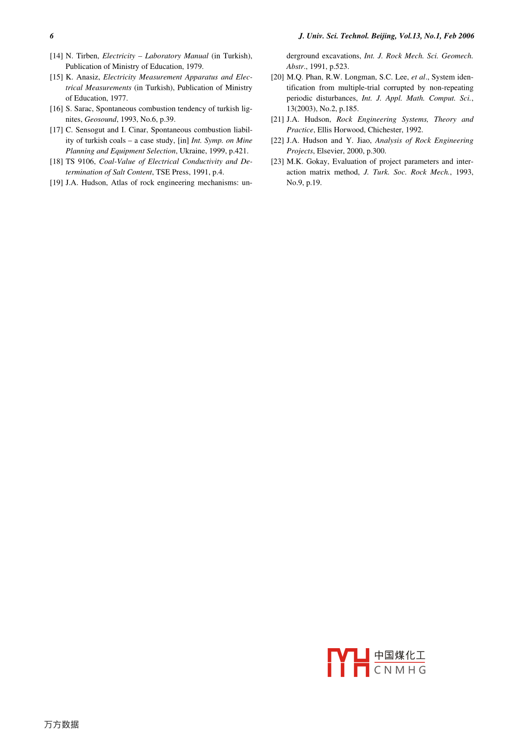Journal of University of Science and Technology BeijingVolume 13, Number 1, February 2006, Page IMineralEffects of electrical resistance on the spontaneous combustion tendencyof coal and the interaction matrix conceptO.S. Yildirim", C. Sensogut, and M.K. Gokay1)Ministry of Energy, Ankara, Turkey2)Mining Engineering Department, Dumlupinar University, Kutahya, Turkey3)Mining Engineering Department, Selcuk University, Konya, Turkey( Received 2005-02Abstract: There have been several developments in determining the spontaneous combustion liability of coal. Most of the methodsof concern have purely been based on the internal properties of the coal itself. The relation between the crossing-point method andthe electrical resistance of coal was examined here to outline the spontaneous combustion tendency of coal. The electrical resistanceproperty of coal was looked into as a decision-making parameter of the interaction matrix concept for the final decision on the spon-taneous combustion tendencyKey words: spontaneous combustion; electrical resistance; interaction matrix1. Introductioneasily absorb water to their mineral composition. Thisaffects the specific resistance of coal significantly [1]Coal itself as a material is a semiconductor and its Specific resistance changes with temperature as wellelectrical conductivity is changed in the range of and it decreases with increasing temperature. The rate1x10-2-1x102Q2m. The electrical conductivity of of decrease in specific resistance is significant for thecoal differs with respect to its direction of stratificatemperature range of 0-80%C [2]tion of meaning that changes with the anisotropicproperties of coal. Consequently, the specific resis-pic lithotopes, which are the petrographictance of coal to electricity is found to be dependent onelements of the texture of coal. are named as vitrainmany factors such as rank, temperature, voltage, waterclarain, durain, and fusain [11]. Researchers reportedcontent, petrography, carbon content and the friabilitythat fusain has low specific resistance (1.0-1x10behavior of coal [1-10. The specific resistance of coalQ m)while vitrain, clarain, and durain have higherdecreases when the voltage changes in the range of 0- values of specific resistance to electricity. It is also300 V. The increase in the water content of coal shown that the specific resistance of coal increasescauses a decrease in its specific resistance. It is pre- when vitrain content increases and fusain content de-sented that the specific resistance to electricity decreases for the temperature range of 20-400C [1]. Increases sharply when the moisture content of coal in-addition to these factors, the inorganic content of coalcreases. This can be explained by the alkaline mineral consists of minerals and trace elements; they havecontent of coal. Alkaline mineral ions are not active inthree kinds of source in general [12],(1)original min-dry coal samples. When the moisture content of coal erals(originated from vegetation ),( 2)primary miner-increases, ionic activities in coal increase causing anals(crystallized during coalification), and (3)seconncrease in electrical conductivity. Laboratory testsdary minerals(exterior or re-crystallized minerals inperformed to measure the electrical conductivity of acoal seam)coal sample showed significant differences accordinMinerals, carbonates, sulphates, chlorites, silicates,to conductivity measuring direction. This is possible salts, oxides, and hydroxides can be the main inor-due to coal stratification direction influencing the ganic content of any coal seaminorganic mineral content of coal [2]2. Experime中國(guó)煤化工In general, clay minerals constitute the main parts 2.1. ElectricalCNMHGof the coal seams' inert mineral content. Clay mineralsIt is a welllat uc resistance to elec-Corresponding author: C, Sensogut, E-mail: sensogut@ mail dumlupinar.edu, tr2J. Univ. Sci. Technol. Beijing, VoL 13, No 1, Feb 2006tricity is directly related to the length of the wire or sistance and the spontaneous combustion tendency ofconductor. However, it is also indirectly related to the coal, several laboratory tests were performed. The reconductor's cross-sectional area. In addition to these sults of the electrical resistance measurements chemipends also on the material cal analyses, and spontaneous combustion index val-properties of the metal that the conductor is made up ues of coal are given in Table 1. The spontaneousof [13-14]. The electrical resistance value of solid combustion tendency indices in Table I were determaterials can be sorted into three main groups [15], (1) mined by using ignitability techniques and crossing-low-level resistance, 0-1 Q2,(2)mid-level resistance, point approach [16-17]. Test samples were first taken,1-1x10Q2, and (3)high-level resistance, >1x10Q2from the coal mine, in hermetic boxes, and transportedThe"high-level"resistance is quite high, therefore, safely to the laboratory. They were, then, cut intothe materials that have high electrical resistance are prismatic blocks(1.5 cmx1 cm, 5 cmx2.0 cm) by aalso called"electrical isolators'151diamond saw. The electrical resistance of the samples2.2. Measurement of electrical resistivitywas then measured by using an ohmmeter connectedTo determine the relation between the electrical reto the prepared test set as seen in Fig. ITable 1. Laboratory test results of the coal samples taken from different collieries of Turkish Coal boardVolatileFixed Totallatter/ carhElectrical Electricalresistance resistanceMineSamplesture/% wt%bon/ phuof coal/ of solution/wto wt%oMedium-0.734.7145.3419454.949.231.638LignitesAegeanMerkez17.8179543.0439011.999.714.3311250ParkCayirhan28.318.8464935.435848.8 Medium1.779454WesternTuncbilek-A9329.6328628.181.12122HiLiesternTuncbilek-B 12.35.5233.5838.601.0211.6High36.398555Lignites Tuncbilek-C 10.3 30.5 30.79 28.87 1.49 14.0 High47.275Omerler-A14.8180135.7431.401.2215.221,99416398 Lignites Omerler-B16.216.76283638.684.278.5 