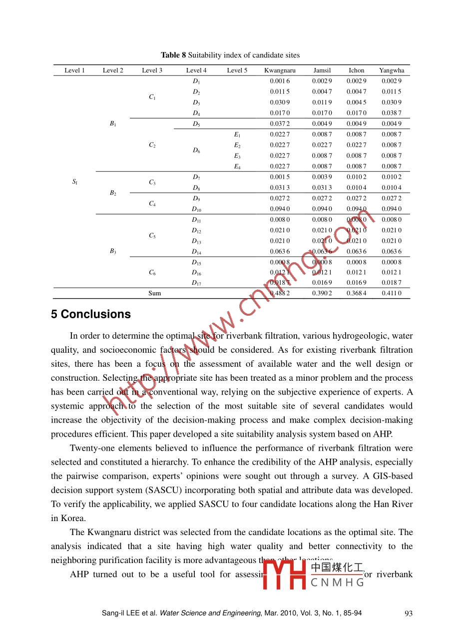 SEWater Science and Engineering, 2010, 3(1): 85-94doi:10.382/.issn.1674-2370.2010.01.009htp://ww.waterjournal.cne-mail: wse2008@vip.1 63.comDevelopment of site suitability analysis system forriverbank filtrationSang-il LEE, Sang-sin LEE*Department of Civil and Environmental Engineering, Dongguk University, Seoul100-715, KoreaAbstract: Site selection plays a crucial role in riverbank filtration for sustainable wateravailability and quality. Choosing the most appropriate from among multiple candidate sitesrequires a complex procedure, involving many tangibles and intangibles. In this study, the AnalyticHierarchy Process (AHP), which selects the optimal alternative by hierarchically classifyingvarious attributes and then quantifying the importance of each atribute, was used to prioritizecandidate locations for riverbank filtration. A GIS-based computer program was developed toautomate the assessment process. The developed software was applied to the Han River in Korea.Analysis of four candidate sites reveals that a site that has better water quality and conectivity tothe neighboring purification facility is more suitable than other locations.Key words: riverbank filtration; AHP; site suitabilir; Han River1 IntroductionIn European countries such as Germany and the Netherlands, riverbank filtration (RBF)has been successfully practiced as a way of enhancing the quality of the water supply for over150 years (Grischek et al. 2002; Tufenkji et al. 2002; Eckert and Irmscher 2006). In Germany,RBF is used for 15%-16% of the total drinking water. RBF has also been used for drinkingwater in many cities in the United States. RBF relies on the streambed and aquifer matrixes toimprove source water quality and to reduce pathogens through induced infiltration. Theremoval or degradation of contaminants is achieved through a combination of physicochemicaland biological processes.Tap water in Korea mainly comes from surface water. A more advanced water treatmentprocess is needed due to the risk of accidental spills and the deterioration of surface waterquality. Because of the high cost of water treatment and public concerns, decision makers areturning to RBF as an alternative to the conventional abstraction of surface water. ChangwonCity started supplying domestic water treated through RBF in 2001, the first time in Korea(Office of Waterworks Changwon City 2009). The city continues to expand the facility, and the中國(guó)煤化工This work was supported by a grant (3-4-3) from the SustainableMYHCNMHGnterofthe21stCentury Frontier Research Program.*Corresponding author (e-mail: sinslee @ nate.com)Received Sep.28, 2009; accepted Nov. 25, 2009water supply is now 70000 mi /d. A neighboring city, Chil-seo Myeon in Ham-an Gun, has alsobeen supplying riverbank- filtered water (20000 m'/d) since 2003. Seoul, the capital of Korea,is pursuing the introduction of RBF to enhance public trust in tap water. Table 1 shows someexamples of riverbank filtration throughout the world.Table 1 Major examples of riverbank filtrationRiverWell fieldNumber of wellWater production (m/d)Rhine River in GermanyDisseldorf70 vertical wells, 18 clltor wells357 600Llobregat River in SpainCorella26 extraction wells, 7 recharge wells62000Limmat River in SwitzerlandHardhof9 vertical wells, 4 cllctor wells15 000Donau River in AustriaLobau8 clletor wells136000Donau River in HungaryCsepel256 vertical wells, 30 clletor wells150000Missouri River in USAJefferson County5 lateral wells18 900Nearman1 collector well120000Kansas River in USAKansas City1 cllctor well151 200 .Ohio River in USALouisville, Kentucky2 cllector wells75 600Nakdong River in KoreaChangwon50 vertial wells, 1 collector well80000The Analytic Hierarchy Process (AHP), which allows for the selection of the optimalaltermnative by hierarchically classifying the various attributes and then measuring theimportance of each attribute, was developed by Saaty (1980). The novelty of AHP lies in thestratification of a decision- making problem with many objectives, evaluation criteria, anddecision-making variables. Due to its simplicity and versatility, AHP has been used in varioussettings to make decisions (Saaty 2008). AHP involves dividing a sophisticated problem intosub-elements, organizing them, forming an orderly hierarchical structure, determining threlative importance of the elements through pairwise comparison, and finally synthesizinghuman judgments to provide a total order (Zhang 2009). There have been some studies relatedto site suitability analysis using AHP. Wu (1998) developed a prototype of a simulation modelbased on cellular automata (CA) and multi- criteria evaluation (MCE) and integrated withgeographic information system (GIS) using the AHP method. Reza (2005) studied the ways inwhich AHP frames the site evaluation problem and can aid in making decisions involvingmultiple criteria, factor diversity, and conditions of uncertainty.2 Suitability analysis using AHPApplying the AHP procedure involves four basic steps (Fig. 1): (1) definition of theproblem; (2) construction of the decision hierarchy; (3) comparative judgment, or datacollection and execution of pairwise comparison for elements in the hierarchical structure; and(4) synthesis of priorities, or evaluation of the overall priority rating.The decision hierarchy is structured from the top, with the goal of the decision, throughthe intermediate levels to the lowest level. Once a hierarchy is established, pairwisecomparison is made. The pairwise comparison makes. the complicated comparison of entireelements easy. The degree of relative importance of ele中國(guó)煤化工ccording toa1-9 scale, as shown in Table 2.fYHCNMHG.86Sang-il LEE et al. Water Science and Engineering, Mar. 2010, Vol. 3, No. 1, 85-94J EvaluationDefinitionobjective↓l Hierarchy| Evaluation Evaluation | | Evaluation || Evaluation(1I)2)(3)(4)PairwisecomparisonFinal+[ Ateative1]- -[ Altemative2]synthesisFig. 1 Organized decision-making in AHPTable 2 Fundamen