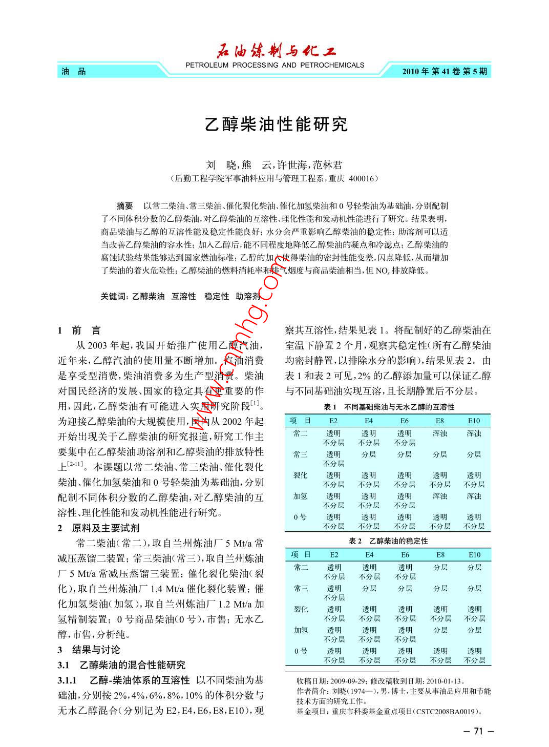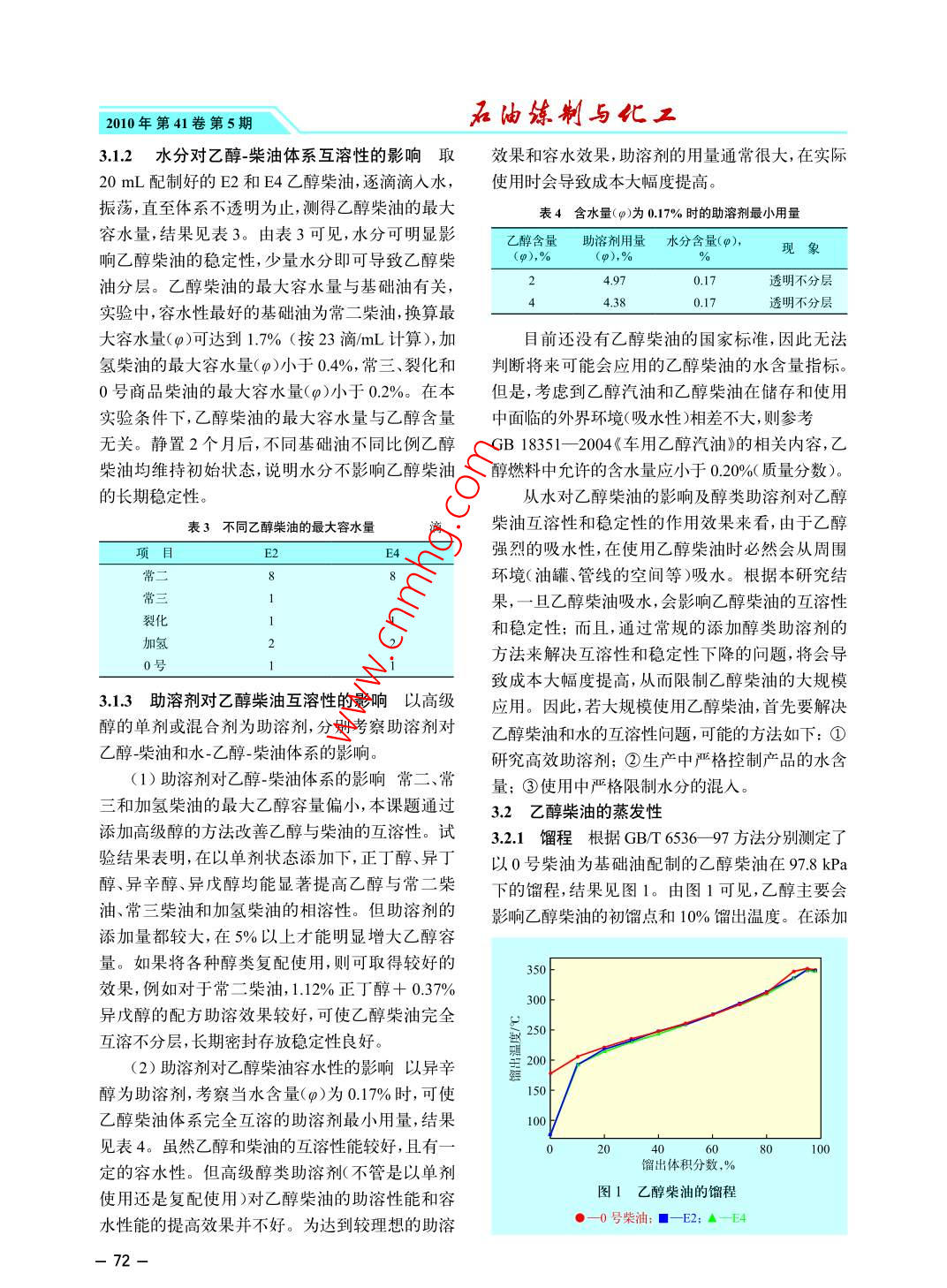 油煉制與化工油品 PETROLEUM PROCESSING AND PETROCHEMICALS2010年第41卷第5期乙醇柴油性能研究劉曉,熊云,許世海,范林君(后勤工程學(xué)院軍事油料應(yīng)用與管理工程系,重慶400016)摘要以常二柴油、常三柴油、催化裂化柴油、催化加氫柴油和0號(hào)輕柴油為基礎(chǔ)油,分別配制了不同體積分?jǐn)?shù)的乙醇柴油,對(duì)乙醇柴油的互溶性、理化性能和發(fā)動(dòng)機(jī)性能進(jìn)行了研究。結(jié)果表明,商品柴油與乙醇的互溶性能及穩(wěn)定性能良好水分會(huì)嚴(yán)重影響乙醇柴油的穩(wěn)定性;助溶劑可以適當(dāng)改善乙醇柴油的容水性;加入乙醇后,能不同程度地降低乙醇柴油的凝點(diǎn)和冷濾點(diǎn);乙醇柴油的腐蝕試驗(yàn)結(jié)果能夠達(dá)到國(guó)家燃油標(biāo)準(zhǔn);乙醇的加入使得柴油的密封性能變差,閃點(diǎn)降低,從而增加了柴油的著火危險(xiǎn)性;乙醇柴油的燃料消耗率和排氣煙度與商品柴油相當(dāng),但NO排放降低。關(guān)鍵詞:乙醇柴油互溶性穩(wěn)定性助溶劑1前言察其互溶性,結(jié)果見(jiàn)表1。將配制好的乙醇柴油在從2003年起,我國(guó)開(kāi)始推廣使用乙醇汽油室溫下靜置2個(gè)月,觀察其穩(wěn)定性(所有乙醇柴油近年來(lái),乙醇汽油的使用量不斷增加。汽油消費(fèi)均密封靜置,以排除水分的影響),結(jié)果見(jiàn)表2。由是享受型消費(fèi),柴油消費(fèi)多為生產(chǎn)型消費(fèi)柴油表1和表2可見(jiàn),2%的乙醇添加量可以保證乙醇對(duì)國(guó)民經(jīng)濟(jì)的發(fā)展、國(guó)家的穩(wěn)定具有更重要的作與不同基礎(chǔ)油實(shí)現(xiàn)互溶,且長(zhǎng)期靜置后不分層。用,因此,乙醇柴油有可能進(jìn)入實(shí)用研究階段。表1不同基礎(chǔ)柴油與無(wú)水乙醇的互溶性為迎接乙醇柴油的大規(guī)模使用,國(guó)內(nèi)從2002年起項(xiàng)目2e4e6e8e10開(kāi)始出現(xiàn)關(guān)于乙醇柴油的研究報(bào)道,研究工作主常二層不分層不分要集中在乙醇柴油助溶劑和乙醇柴油的排放特性常三透明分層分層分層分層上211本課題以常二柴油、常三柴油、催化裂化不分層裂化透明透明透明透明透明柴油、催化加氫柴油和0號(hào)輕柴油為基礎(chǔ)油,分別不分層不分層不分層不分層不分層配制不同體積分?jǐn)?shù)的乙醇柴油,對(duì)乙醇柴油的互加氫透明透明透明渾濁渾濁不分層不分層不分層溶性、理化性能和發(fā)動(dòng)機(jī)性能進(jìn)行研究。0號(hào)透明透明透明透明透明2原料及主要試劑不分層不分層不分層不分層不分層常二柴油(常二),取自蘭州煉油廠5Mt/a常表2乙醇柴油的穩(wěn)定性減壓蒸餾二裝置;常三柴油(常三),取自蘭州煉油項(xiàng)目《4EE8Ei0《廠5Mt/a常減壓蒸餾三裝置;催化裂化柴油(裂常二透明透明透明分層分層不分層不分層不分層化),取自蘭州煉油廠1.mta催化裂化裝置;催常三透明分層分層分層分層不分層化加氫柴油(加氫),取自蘭州煉油廠1.2Mt/a加裂化透明透明氫精制裝置;0號(hào)商品柴油(0號(hào)),市售;無(wú)水乙透明透明透明不分層不分層不分層不分層不分層醇,市售,分析純。加氫透明透明透明分層分層不分層不分層不分層3結(jié)果與討論透明透明3.1乙醇柴油的混合性能研究0號(hào)不層不分層不層不分層不分層3.1.1乙醇-柴油體系的互溶性以不同柴油為基收稿日期:2009-09-29;修改稿收到日期:2010-01-13礎(chǔ)油,分別按2%,4%,6%,8%,10%的體積分?jǐn)?shù)與作者簡(jiǎn)介:劉曉(1974),男,博士,主要從事油品應(yīng)用和節(jié)能的研究工無(wú)水乙醇混合(分別記為E2,E4,E6,E8,E10),觀基金項(xiàng)目:重市金C2019712010年第41卷第5期油練制與優(yōu)3.1.2水分對(duì)乙醇-柴油體系互溶性的影響取效果和容水效果,助溶劑的用量通常很大,在實(shí)際20mL配制好的E2和E4乙醇柴油,逐滴滴入水,使用時(shí)會(huì)導(dǎo)致成本大幅度提高。振蕩,直至體系不透明為止,測(cè)得乙醇柴油的最大表4含水量()為0.17%時(shí)的助溶劑最小用量容水量,結(jié)果見(jiàn)表3。由表3可見(jiàn),水分可明顯影乙醇含量助溶劑用量水分含量()響乙醇柴油的穩(wěn)定性,少量水分即可導(dǎo)致乙醇柴(),%(p),%%現(xiàn)油分層。乙醇柴油的最大容水量與基礎(chǔ)油有關(guān),4.970.17透明不分層實(shí)驗(yàn)中,容水性最好的基礎(chǔ)油為常二柴油,換算最44.380.17透明不分層大容水量()可達(dá)到1.7%(按23滴/mL計(jì)算),加目前還沒(méi)有乙醇柴油的國(guó)家標(biāo)準(zhǔn),因此無(wú)法氫柴油的最大容水量(p)小于0.4%,常三、裂化和判斷將來(lái)可能會(huì)應(yīng)用的乙醇柴油的水含量指標(biāo)。0號(hào)商品柴油的最大容水量()小于0.2%。在本但是,考慮到乙醇汽油和乙醇柴油在儲(chǔ)存和使用實(shí)驗(yàn)條件下,乙醇柴油的最大容水量與乙醇含量中面臨的外界環(huán)境(吸水性)相差不大,則參考無(wú)關(guān)。靜置2個(gè)月后,不同基礎(chǔ)油不同比例乙醇GB183512004車用乙醇汽油》的相關(guān)內(nèi)容,乙柴油均維持初始狀態(tài),說(shuō)明水分不影響乙醇柴油醇燃料中允許的含水量應(yīng)小于0.20%(質(zhì)量分?jǐn)?shù))的長(zhǎng)期穩(wěn)定性。從水對(duì)乙醇柴油的影響及醇類助溶劑對(duì)乙醇表3不同乙醇柴油的最大容水量滴柴油互溶性和穩(wěn)定性的作用效果來(lái)看,由于乙醇項(xiàng)目 E2 E4強(qiáng)烈的吸水性,在使用乙醇柴