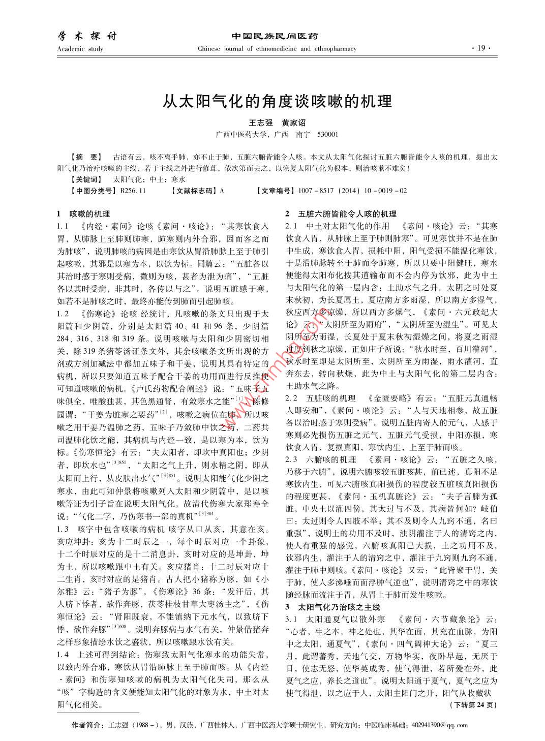 學(xué)術(shù)探討中國民族民間醫(yī)藥Academic studyChinese joumal of ethnomedicine and ethnopharmacy●19.從太陽氣化的角度談咳嗽的機(jī)理王志強(qiáng)黃家詔廣西中醫(yī)藥大學(xué),廣西南寧530001[摘要]古語有云,咳不離乎肺,亦不止于肺,五臟六腑皆能令人咳。本文從太陽氣化探討五臟六腑皆能令人咳的機(jī)理,提出太陽氣化乃治療咳嗽的主線,若于主線之外進(jìn)行修茸,依次第而去之,以恢復(fù)太陽氣化為根本,則治咳嗽不難矣![關(guān)鍵詞]太陽氣化; 中土;寒水[中圖分類號(hào)] R256. 11[文獻(xiàn)標(biāo)志碼] A[文章編號(hào)] 1007 -8517 (2014) 10-0019 -021咳嗽的機(jī)理2五臟六腑 皆能令人咳的機(jī)理1.1《內(nèi)經(jīng). 素問》論咳《素問.咳論》:“其寒飲食人2.1中土對(duì)太陽氣化的作用 《素問 .咳論》云:“其寒胃,從肺脈上至肺則肺寒,肺寒則內(nèi)外合邪,因而客之而飲食人胃,從肺脈上至于肺則肺寒”??梢姾嫴⒉皇窃诜螢榉慰取保f明肺咳的病因是由寒飲從胃沿肺脈上至于肺引中生成,寒飲食人胃,損耗中陽,陽氣受損不能溫化寒飲,起咳嗽,其邪是以寒為本,以飲為標(biāo)。同篇云:“五臟各以于是沿肺脈轉(zhuǎn)至于肺而令肺寒,所以只要中陽健旺,寒水其治時(shí)感于寒則受病,微則為咳,甚者為泄為痛”,“ 五臟便能得太陽布化按其道輸布而不會(huì)內(nèi)停為飲邪,此為中土各以其時(shí)受病,非其時(shí),各傳以與之”。說明五臟感于寒,與太陽氣化的第- -層內(nèi)含:土助水氣之升。太陰之時(shí)處夏如若不是肺咳之時(shí),最終亦能傳到肺而引起肺咳。末秋初,為長夏屬土,夏應(yīng)南方多雨濕,所以南方多濕氣,1.2 《傷寒論》論咳經(jīng)統(tǒng)計(jì),凡咳嗽的條文只出現(xiàn)于太秋應(yīng)西方多涼燥,所以西方多燥氣,《素問 .六元政紀(jì)大陽篇和少陰篇,分別是太陽篇40、41和96條,少陰篇論》 云:“太陰所至為雨府”,“太陰所至為濕生”??梢娞?84、316、318和319條。說明咳嗽與太陽和少陰密切相陰所至為雨濕,長夏處于夏末秋初濕燥之間,將夏之雨濕關(guān),除319條豬苓湯證條文外,其余咳嗽條文所出現(xiàn)的方過度到秋之涼燥,正如莊子所說:“ 秋水時(shí)至,百川灌河”,劑或方劑加減法中都加五味子和干姜,說明其具有特定的秋水時(shí)至即是太陰所至,太陰所至為雨濕,雨水灌河,直病機(jī),所以只要知道五味子配合干姜的功用而進(jìn)行反推便奔東去,轉(zhuǎn)向秋燥,此為中土與太陽氣化的第二層內(nèi)含:可知道咳嗽的病機(jī)?!侗R氏藥物配合闡述》說:“五味子五土助水氣之降。味俱全,唯酸獨(dú)甚,其色黑通腎,有斂寒水之能”田,陳修2.2五臟咳的機(jī)理 《 金匱要略》有云:“ 五臟元真通暢園謂:“干姜為臟寒之要藥”日,咳嗽之病位在肺,所以咳人即安和”,《素問.咳論》云:“人與天地相參,故五臟嗽之用干姜乃溫肺之藥,五味子乃斂肺中飲之藥,二藥共各以治時(shí)感于寒則受病”。說明五臟內(nèi)寄人的元?dú)?,人感于司溫肺化飲之能,其病機(jī)與內(nèi)經(jīng)一致,是以寒為本,飲為寒則必先損傷五臟之元?dú)猓迮K元?dú)馐軗p,中陽亦損,寒標(biāo)?!秱阏摗酚性?“夫太陽者,即坎中真陽也;少陰飲食入胃,復(fù)損真陽,寒飲內(nèi)生,上至于肺而咳。者,即坎水也”381,“ 太陽之氣上升,則水精之陰,即從2.3六腑咳的機(jī)理 《素問. 咳論》云:“ 五臟之久咳,太陽而上行,從皮膚出水氣”3851。說明太陽能氣化少陰之乃移于六腑”,說明六腑咳較五臟咳甚,前已述,真陽不足寒水,由此可知仲景將咳嗽列入太陽和少陰篇中,是以咳寒飲內(nèi)生,可見六腑咳真陽損傷的程度較五臟咳真陽損傷嗽等證為引子旨在說明太陽氣化,故清代傷寒大家鄭壽全的程度更甚,《素問,玉機(jī)真臟論》云:“夫子言脾為孤臟,中央土以灌四傍,其太過與不及,其病皆何如?岐伯說:“氣化二字,乃傷寒書-一部的真機(jī)”1384.日:太過則令人四肢不舉;其不及則令人九竅不通,名日1.3咳字中包含 咳嗽的病機(jī)咳字從口從亥,其意在亥。重強(qiáng)”,說明土的功用不及時(shí),濁陰灌注于人的清竅之內(nèi),亥應(yīng)坤卦:亥為十二時(shí)辰之一,每個(gè)時(shí)辰對(duì)應(yīng)-一個(gè)卦象,使人有重強(qiáng)的感覺,六腑咳真陽已大損,土之功用不及,十二個(gè)時(shí)辰對(duì)應(yīng)的是十二消息卦,亥時(shí)對(duì)應(yīng)的是坤卦,坤飲邪內(nèi)生,灌注于人的清竅之中,灌注于九竅則九竅不通,為土,所以咳嗽跟中土有關(guān)。亥應(yīng)豬肖:十二時(shí)辰對(duì)應(yīng)十灌注于肺中則咳?!端貑?咳論》又云:“ 此皆聚于胃,關(guān)二生肖,亥時(shí)對(duì)應(yīng)的是豬肖。古人把小豬稱為豚,如《小于肺,使人多涕唾而面浮腫氣逆也”,說明清竅之中的寒飲爾雅》云:“豬子為豚”,《傷寒論》36條:“發(fā)汗后, 其隨經(jīng)脈而流注于胃,從胃上于肺而發(fā)生咳嗽。人臍下悸者,欲作奔豚,扶苓桂枝甘草大棗湯主之”,《傷3太陽氣化乃治咳之主線寒恒論》云:“腎陽既衰,不能鎮(zhèn)納下元水氣,以致臍下3.1 太陽通夏氣以散外寒 《素問●六節(jié)藏象論》云:悸,欲作奔豚”13108說明奔豚病與水氣有關(guān),仲景借豬奔“心者,生之本,神之處也,其華在面,其充在血脈,為陽之樣形象描繪水飲之盛狀,所以咳嗽跟水飲有關(guān)。中之太陽,通夏氣”,《素問.四氣調(diào)神大論》云:“夏三1.
