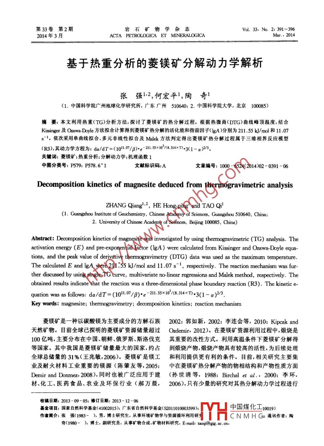 第33卷第2期巖石礦物學(xué)雜志Vol.33,No.2:391~3962014年3月ACTA PETROLOGICA ET MINERALOGICAMar.,2014基于熱重分析的菱鎂礦分解動(dòng)力學(xué)解析張強(qiáng)12,何宏平1,陶奇1(1.中國科學(xué)院廣州地球化學(xué)研究所,廣東廣州510640:2.中國科學(xué)院大學(xué),北京100085)摘要:本文利用熱重(TG)分析方法,探討了菱鎂礦的熱分解過程。根據(jù)熱微商(DTG)曲線峰頂溫度,結(jié)合Kissinger及 Ozawa-Doyle方法擬合計(jì)算得到菱鎂礦熱分解的活化能和指前因子(gA)分別為2115J/mdl和11.07s-1.依次采用單曲線擬合、多元非線性擬合及 Malek方法判定得出菱鎂礦熱分解過程屬于三維相界反應(yīng)模型(R3),其動(dòng)力學(xué)方程為:da/dT=(10107/)·e-2.5×10(834xT.3(1-a)23關(guān)鍵詞:菱鎂礦;熱重分析;分解動(dòng)力學(xué);機(jī)理函數(shù)1中圖分類號(hào):P579;P578.6+1文獻(xiàn)標(biāo)識(shí)碼:A文章編號(hào):1000-6524(2014)02-0391-06Decomposition kinetics of magnesite deduced from thermogravimetric analysisZHANG Qiang. 2, HE Hong-ping and TAO Q(1. Guangzhou Institute of Geochemistry, Chinese academy of Sciences, guangzhou 510640, China2. University of Chinese Academy of Sciences, Beijing 100085, China)Abstract: Decomposition kinetics of magnesite was investigated by using thermogravimetric(TG)analysis. Theactivation energy(E) and pre-exponential factor(lgA)were calculated from Kissinger and Ozawa-doyle equations, and the peak value of derivative thermogravimetry(dtg) data was used as the maximum temperatureThe calculated E and IgA were 211.55 kJ/mol and 11.07 s", respectively. The reaction mechanism was furher discussed by using single- TG curve, multivariate no-linear regressions and Malek method, respectively. Theobtained results indicate that the reaction was a three-dimensional phase boundary reaction(R3 ) The kinetic e-quation was as follows: da/dT=(10 1.071B.e- 211.55x1071(8. 314xT)3(1-a)2/3Key words: magnesite; thermogravimetry; decomposition kinetics; reaction mechanism菱鎂礦是一種以碳酸鎂為主要成分的方解石族2002;郭如新,2002;李連會(huì)等,2010; Kipcak and天然礦物。目前全球已探明的菱鎂礦資源儲(chǔ)量超過 Ozdemir,2012)。在菱鎂礦資源利用過程中,煅燒是100億噸,主要分布在中國、朝鮮、俄羅斯、斯洛伐克其重要的改性方式。利用高溫條件下菱鎂礦分解得等國家。其中我國是菱鎂礦儲(chǔ)量最大的國家,約占到煅燒產(chǎn)物,煅燒產(chǎn)物具有較高的活性,為后續(xù)處理全球總儲(chǔ)量的31%(王兆敏,2006)。菱鎂礦是鎂工和利用提供更有利的條件。目前,相關(guān)研究主要集業(yè)及耐火材料工業(yè)重要的鎂源(陳肇友等,2005;中在菱鎂礦熱分解產(chǎn)物的物相結(jié)構(gòu)和產(chǎn)物性質(zhì)方面Demir and dome,2008),同時(shí)也被廣泛應(yīng)用于建(孫世清等,1988; Birchall et al.,2000;李環(huán)材、化工、醫(yī)藥食品、農(nóng)業(yè)及環(huán)保行業(yè)(郝萬晨,2006),只有少量的研究對(duì)其熱分解動(dòng)力學(xué)過程進(jìn)行收稿日期:2013-09-05;修訂日期:2013-12-06基金項(xiàng)目國家自然科學(xué)基金(405東省自然科學(xué)基金(s0100392V凵中國煤化工00作者藺介:張強(qiáng)1983-),男博土研究生,從事環(huán)境礦物學(xué)與資源循環(huán)利用研丬CNMHG:通訊作者:陶奇(1980-),博士,副研究員,從事礦物合成、礦物材料研究, E-mail: taoqi@g,ac,mn92巖石礦物學(xué)雜志第33卷了探索( Jesenak et al.,1997)。在熱分解動(dòng)力學(xué)參表1實(shí)驗(yàn)菱鎂礦樣品化學(xué)成分?jǐn)?shù)求解方面,利用較多的是熱分析方法,其中以熱重Table 1 Chemical analyses of magnesite差示掃描量熱法( TG-DSC)及熱重-差熱分析法成分 Mgo CaO Al2O2SO2MnO2Fe2O2燒失量(100℃)( TG-DTA為主( Demir et al.,2003;Liu,2011)。含量44821.010.213.570.061.7149,15采用這兩種方法時(shí),需要一個(gè)共同的前提,即設(shè)定試樣和參比物的熱容在整個(gè)反應(yīng)的過程中保持不變1.2分析方法(沈興,1995)。然而,在菱鎂礦熱分解的過程中,因?qū)⒘怄V礦在105℃條件下烘干后破碎磨至粒徑質(zhì)量變化、相轉(zhuǎn)變以及爆裂等現(xiàn)象的存在經(jīng)常導(dǎo)致為100-150目標(biāo)準(zhǔn)篩的細(xì)度。稱取樣品質(zhì)量為實(shí)際過程與理論假設(shè)出現(xiàn)較大偏差( Turcaniova et15.00±0.05mg,在空氣氣氛,氣流速率為60mL/a1.,1996)。因此,在動(dòng)力學(xué)分析上,采用熱重(TG)min條件下,分別以5、10、20、3040℃/min的升溫?cái)?shù)據(jù)比采用DSC或者DTA數(shù)據(jù)的分析結(jié)果更加接速率將樣品從30℃加熱到950℃,獲得其分解的TG近實(shí)際情況。本文探索了利用TG數(shù)據(jù)對(duì)菱鎂礦的曲線。TG分析在 NETZSCH-STA409PC熱分析儀熱分解動(dòng)力學(xué)過程進(jìn)行解析,為菱鎂礦煅燒改性及上進(jìn)行。由TG曲線得到熱微商(DTG)曲線,DTG資源利用提供理論依據(jù)。曲線的峰頂溫度為失重率最大時(shí)的溫度,表示分解速率達(dá)到最大時(shí)的溫度。1原料與方法2結(jié)果與討論1.1實(shí)驗(yàn)原料實(shí)驗(yàn)所用菱鎂礦來自遼寧大石橋。其物相和化2.1菱鎂礦熱分解的 TG-DTG曲線學(xué)成分分別由X射線衍射(XRD)和X射線熒光光菱鎂礦在不同升溫速率下的 TG-DTG曲線顯譜(XRF)測(cè)試得到。XRD結(jié)果顯示其主要物相成分示,菱鎂礦熱分解的溫度區(qū)間在500-800℃之間(圖為碳酸鎂,其中的鈣硅雜質(zhì)分別以白云石及滑石相2)。不同升溫速率條件下菱鎂礦失重趨勢(shì)相同,失存在(圖1)。在菱鎂礦形成過程中,雜