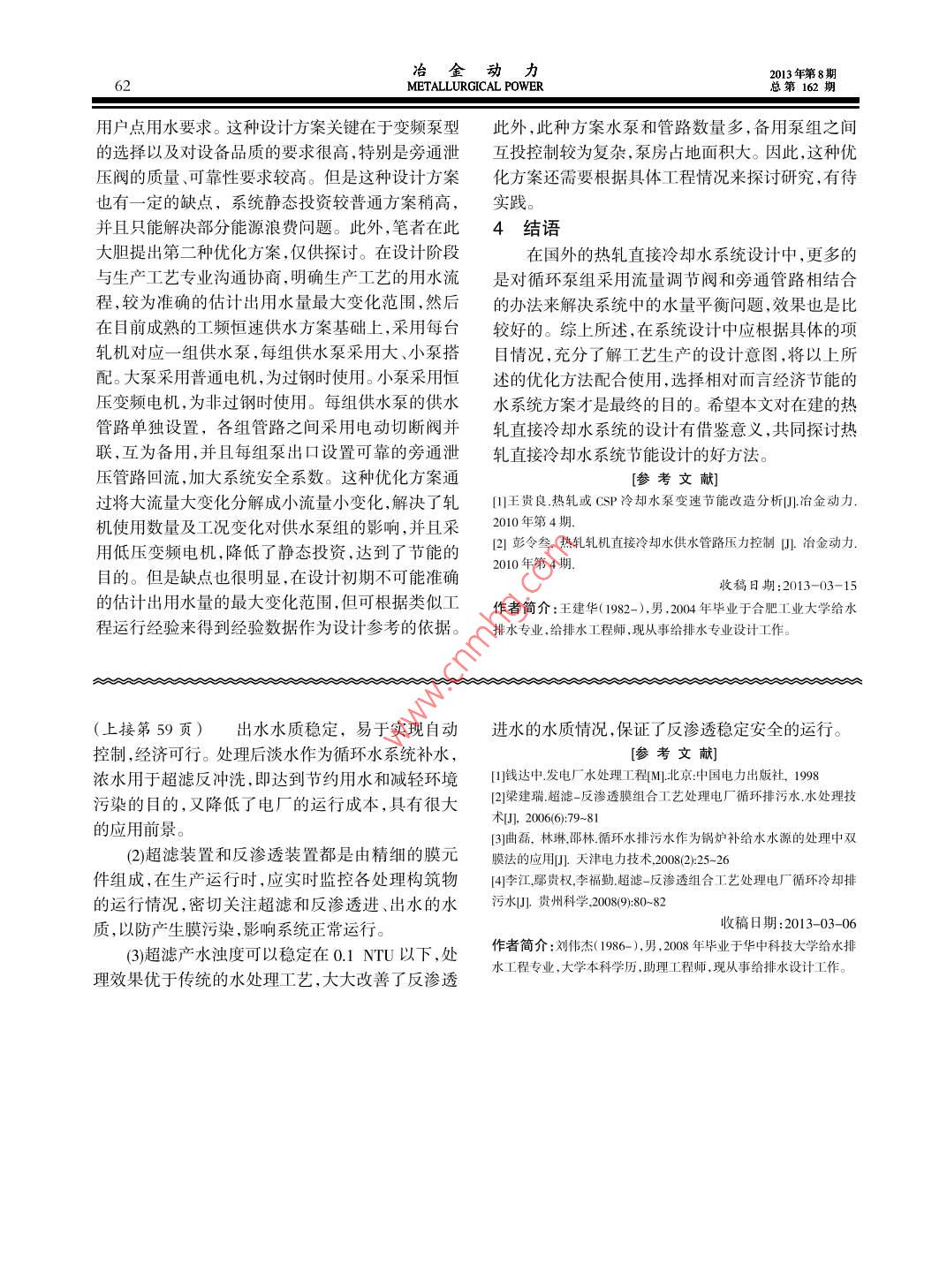 冶金動力013年第8期METALLURGICAL POWER總第162期循環(huán)水排污水的回用處理劉偉杰1,岳禹峰1,劉成榮2(1中國核電工程有限公司深圳設計院廣東深圳2南京覬盛開能環(huán)保能源有限公司江蘇南京)【摘要】結合循環(huán)水排污水回用處理的工程實例,針對電廠循環(huán)水排污水高濁度高鹽量的水質(zhì)特點,采用澄清+過濾+超濾+反滲透工藝進行處理,處理后水進行回用,實現(xiàn)電廠循環(huán)水排污水的零排放。關鍵詞】循環(huán)水排污水;超濾;反滲透;中水回用【中圖分類號】TF085【文獻標識碼】B【文章編號】1006-6764(2013)08-0058-03Waste Water Treatment and RecyclingLIU Wei-jie, YUE Yu-feng, LIU Cheng-rong( Shenzhen Design Institute, China Nucle2. Nanjing Kesen Kenen Environment Energy Co, Ltd, Nanjing, Jiangsu Chir[Abstract ]Combined with the engineering example of waste water treatment and recycling, in the light of water characteristics of the power plants waster water with high turbidity and high salt, the clarification filter ultrafiltration reverse osmosis process is adopted. The treated water is reused to realize zero discharge of the waste water of the power(Key words waste water treatment and recycling; ultrafiltration; reverse osmosis; reuse ofrecycled water1引言泵→機械加速澄清池→多介質(zhì)過濾器→超濾→保循環(huán)補充水是電廠用水的主要部分,大約占到安過濾器→反滲透→產(chǎn)品水箱。余熱發(fā)電廠用水量的90%。循環(huán)冷卻水系統(tǒng)的節(jié)水循環(huán)水排污水進入生水池,加藥后經(jīng)提升泵進主要有兩項措施:通過適當方式提高濃縮倍率;對入機械加速澄清池,澄清后進入多介質(zhì)過濾器,截循環(huán)水排污水水進行回收處理。電廠循環(huán)水排污水留住大顆粒物質(zhì)以保護超濾膜,超濾出水再經(jīng)高壓也是電廠主要的廢水來源,直接排放不但浪費寶貴泵進入反滲透系統(tǒng)。處理后淡水作為循環(huán)補充水,的水資源,還會對周圍環(huán)境造成影響,因此循環(huán)冷反滲透的濃水用于超濾反沖洗。卻排污水的回用意義重大。河北省某余熱發(fā)電廠設2.3設計參數(shù)置了一套50m/h的循環(huán)水排污水回用處理裝置循環(huán)水排污水處理系統(tǒng)主要包括1臺直徑5.5m處理后水可作為循環(huán)補充水,實現(xiàn)電廠循環(huán)水排污的機械加速澄清池,3臺直徑為2200m的多介質(zhì)水的零排放過濾器,2套出力33m/h的超濾裝置,2套出力252系統(tǒng)簡介m3/h的反滲透裝置。21設計水量3主要構筑物及工藝參數(shù)河北省某余熱發(fā)電廠的循環(huán)補充水采用水庫31機械加速澄清池水,循環(huán)水系統(tǒng)的濃縮倍率為40。根據(jù)水量平衡計機械加速澄清池是利用池中積聚的泥渣與原算,夏季工況時總的循環(huán)水量為12240m/h,排污水中的雜質(zhì)顆粒相互接觸、吸附,以達到清水較快量為49m沿h,考慮到反滲透系統(tǒng)的衰減及一定的分離的作用,可較充分發(fā)揮混凝劑的作用和提高設計余量,循環(huán)水排污水回用處理裝置總處理能力澄清效率。實踐證明,機械加速澄清池對保證超濾為65mh,產(chǎn)水出力為50m3/h反滲透的穩(wěn)定運行起到了非常重要的作用,機械加2.2工藝流程速澄清池的出水一直很穩(wěn)定,維持在5NTU以下。工藝流程為:循環(huán)水排污水→生水池一提升機械加速澄清池直徑5.5m,清池總高度為4.年第8期冶金動力第162期METALLURGICAL POWER5995m,停留時間為1.0h,池的設計容積為95m3。4實際的運行效果32多介質(zhì)過濾器4.1超濾出水循環(huán)水經(jīng)過加藥凝聚后,形成大顆粒雜質(zhì),在機SDI是反滲透最重要的進水指標之一,循環(huán)水械加速澄清池中不能完全被去除,將這種原水通過排污水回收裝置自投產(chǎn)以來,超濾產(chǎn)水SD總體上定厚度的粒狀材料,通過粒料間的間隙形成多層穩(wěn)定在1.3左右。即使在進水混凝效果不理想等情的過濾結構,有效地去除水中的懸浮物、泥沙等雜況下,超濾出水SD也可保持在2.0以下,而反滲透質(zhì),使出水達到超濾進水的相關要求。過濾器采用石膜進水要求的SD最高限值是50,故超濾的出水英砂、無煙煤雙層濾料。濾層飽和后,可通過逆向水SD指標是可以保證的。流反洗濾料,恢復過濾功能超濾產(chǎn)水濁度也比較穩(wěn)定,保持在0.1NTU以多介質(zhì)過濾器直徑2.2m,無煙煤填裝高度0.4下,最高為0.16NTU,最小為0.035NTU,總體來說,,石英砂填裝高度0.8m,配套反洗水泵流量120超濾有著非常好的降濁效果,在多介質(zhì)過濾器出水m3/h,揚程25m,功率15kW。濁度變化較大情況下,也能很好的降濁,完全能夠滿3.3超濾裝置足反滲透進水濁度<10NTU的要求。反滲透設備對于進水的水質(zhì)要求較為嚴格,4.2反滲透出水般的預處理工藝如混凝、過濾等處理效果并也不理自設備投運以來,超濾出水一直穩(wěn)定,這給反滲想,特別是進水中含有較多的污染物時,出水的污染透的良好運行打下了堅實的基礎,反滲透系統(tǒng)運行指數(shù)(SD)很難達到反滲透設備的要求。而超濾技情況見表1術可以較好地解決這一問題,能夠?qū)δz體、大分子有表11反滲透運行指標表機物、細菌等進行有效截留,出水完全滿足反滲透設備的要求B回收率%心sm(pscm(mh超濾膜采用荷蘭NORT公司的孔徑為20m的0115.1567.51568中空纖維膜,共配置12根,每根過濾面積為40m2,20116.267922.8材質(zhì)為親水性的聚醚砜,中空膜絲的內(nèi)徑為08201718691437mm。膜元件以串聯(lián)的形式分別