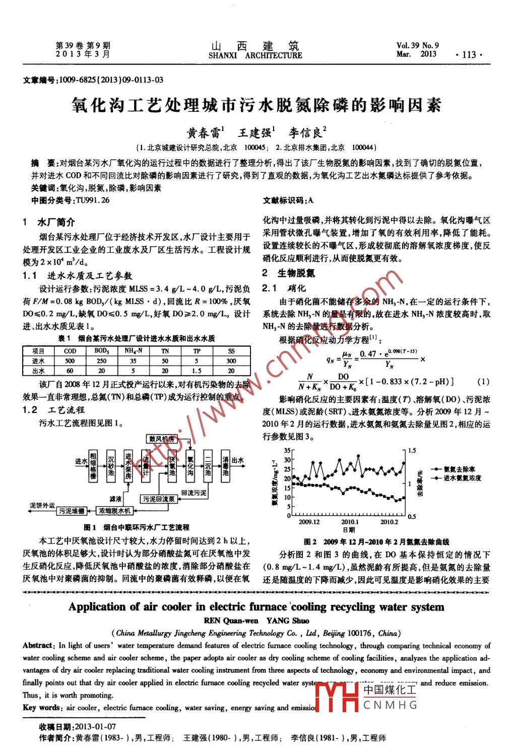 山西建_筑Vol. 39 No. 92013年3月SHANXI ARCHITECTUREMar.2013.111●文章編號:1009-6825 (2013)09-0111-03空冷器在電爐設(shè)備冷卻循環(huán)水系統(tǒng)中的應(yīng)用任全文楊碩(中冶京誠工程技術(shù)有限公司,北京100176)商要:針對電爐設(shè)備冷卻工藝用戶水溫需求的特點(diǎn),通過對水冷方案和空冷方案的技術(shù)經(jīng)濟(jì)比較,采用了空冷器作為冷卻設(shè)備的干空冷方案,并從技術(shù)角度經(jīng)濟(jì)性、環(huán)境影響三方面入手,對干式空冷器替代傳統(tǒng)水冷卻器的應(yīng)用優(yōu)勢進(jìn)行了分析指出在電爐設(shè)備冷卻循環(huán)水系統(tǒng)中采用干式空氣冷卻器能夠節(jié)水、節(jié)能、減排,值得推廣。關(guān)鍵詞:空冷器,電爐設(shè)備冷卻,節(jié)水,節(jié)能減排中圖分類號:TU991.42文獻(xiàn)標(biāo)識碼:A1概述分是低溫冷卻水用戶,主要供給電爐相關(guān)導(dǎo)電部件冷卻用水,如近年來,我國社會各界對節(jié)水工作的重視程度普遍提高,也表1中6項(xiàng)~8項(xiàng)所示,供水水溫為35C,溫升約10C。由于系推動著鋼鐵企業(yè)的節(jié)水技術(shù)水平不斷向前發(fā)展。設(shè)備冷卻采用統(tǒng)的水質(zhì)要求較高,所以常采用軟水閉路循環(huán)系統(tǒng)。閉路循環(huán)水技術(shù)就是鋼鐵企業(yè)節(jié)水的重要措施之一。3傳統(tǒng)水冷方 案和空冷方案的比較目前,在鋼鐵企業(yè)中,電爐設(shè)備冷卻循環(huán)水系統(tǒng)大多數(shù)采用通常工業(yè)上有水冷及空冷兩種冷卻方法。因工業(yè)產(chǎn)品的冷以板換為冷卻設(shè)備的閉路水冷方法"。較之早期的冷卻塔作為卻終溫較低(45 C左右) ,水冷卻效率較高,其總傳熱系數(shù)K值為冷卻設(shè)備的開式系統(tǒng),在節(jié)水方面,有了明顯的提高,但仍屬于傳325 w/(m2●.K)-1 200 w/(m2 . K)左右,設(shè)備緊湊,有利于布統(tǒng)水冷方法,需要另外配- -套冷 媒水循環(huán)系統(tǒng),它會增加設(shè)備投置,因此在鋼鐵冶金 工業(yè)中冷卻設(shè)備大多數(shù)采用傳統(tǒng)水冷方法。資及日常運(yùn)行維修費(fèi)用,而空氣冷卻法簡單易行,并擁有諸多優(yōu)在工程實(shí)例A中,針對電爐設(shè)備冷卻的低溫冷卻水用戶,鑒于點(diǎn)。隨著空冷器技術(shù)的發(fā)展,干式空冷器已成為節(jié)水節(jié)能減排的設(shè)備產(chǎn)品的冷卻終溫為45心,考慮到該工程建設(shè)所在地的自然氣有效冷卻設(shè)備,值得積極推廣應(yīng)用。候條件中大氣溫度參數(shù)為:年平均溫度22 C ,極端最高42.8 C ,故本文結(jié)合具體的工程設(shè)計,對干式空冷器替代傳統(tǒng)水冷卻器實(shí)際設(shè)計中仍然采用傳統(tǒng)的水冷方法,回水利用余壓送至閉式冷應(yīng)用進(jìn)行了初步的分析和探討,可作為相似工程中設(shè)計的借鑒和卻塔 ,將水溫降至用戶要求的35 C水溫后,再繼續(xù)用泵加壓循環(huán)使用。2典型的電爐設(shè) 備冷卻水工藝用戶特點(diǎn)對于電爐設(shè)備的高溫冷卻水用戶,在循環(huán)水系統(tǒng)設(shè)計中,比.典型的電爐設(shè)備冷卻水工藝用戶通常由高、低溫兩部分構(gòu)選了以板式換熱器為冷卻設(shè)備的傳統(tǒng)水冷方案和以干式空冷器成,以下面的工程實(shí)例A為例子進(jìn)行說明。為冷卻設(shè)備的干空冷方案,這兩種方案的工藝流程圖如圖1和圖工程實(shí)例A:某電爐工程,擬建設(shè)90 1電爐,LF,VD,圓坯連鑄2所示。機(jī)等設(shè)施。主要生產(chǎn)石油套管鋼管線鋼等。其中:電爐煉鋼主工藝用水戶板式換熱器車間配置1座90 t超高功率電弧爐,電爐變壓器額定容量為電爐Constel部(mMhXMPsXCI70 MVA。0+50mV關(guān)于電爐設(shè)備的工藝用水要求見表1。0-450mym表1用戶采用 90 t AC電弧爐的用水要求0-100m%元冷卻塔水壓/MPa水溫/序號用戶名稱m3/h水質(zhì)KT碳氧槍.出口t入口出口上爐殼(爐壁水冷板+1渣門+ hriontal TBT| 450| 0.78 0.35| 65| 80 軟化水panel)冷媒水泵爐蓋250_」0.780.356580軟化水I冷媒水池爐門氧槍100 0.58 I 0.35 65 80 軟化水500.780.3565 T 80 軟化水I-板換冷媒水系統(tǒng)Consteel部件1000 0.78 0.3565 80軟化水80.9365TBT機(jī)械機(jī)構(gòu)+電極(mhIMPaN c臂+爐蓋支撐臂+液200 | 0.58 0.30| 35| 45| 軟化水管道過濾器變壓器、電抗器100I0.580.303545軟化水]水冷電纜+二次短網(wǎng)00 0.58| 0.30 3545 軟化水由表1用水戶用水要求特點(diǎn),可以得出:電爐設(shè)備冷卻水工藝系統(tǒng),一部分是高溫冷卻水用戶,包括圖1傳統(tǒng)水冷方案流程圖中國煤化工表1中前5項(xiàng)的設(shè)備冷卻用水,主要是供給電爐的爐蓋、爐殼等對圖1和空冷方案進(jìn)行工藝相關(guān)機(jī)械部件冷卻使用,供水水溫為65 C ,溫升約15 C;另一部流程比較,可以:nYH"CN M H &大的差別在于傳統(tǒng)收稿8期:2013-01-04作者簡介:任全文(1979- ),男,工程師;楊碩(1982- ),女,工程師第39卷第9期山西建筑Vol. 39 No.9SHANXI ARCHITECTUREMar.2013●113●文章編號:1009-6825(2013 )09-0113-03氧化溝工藝處理城市污水脫氮除磷的影響因素黃春雷’王建強(qiáng)’ 李信良2(1.北京城建設(shè)計研究總院,北京100045; 2. 北京排水集團(tuán),北京10044)摘要:對煙臺某污水廠氧化溝的運(yùn)行過程中的數(shù)據(jù)進(jìn)行了整理分析,得出了該廠生物脫氮的影響因素,找到了確切的脫氮位置,并對進(jìn)水COD和不同回流比對除磷的影響因素進(jìn)行了研究,得到了直觀的數(shù)據(jù),