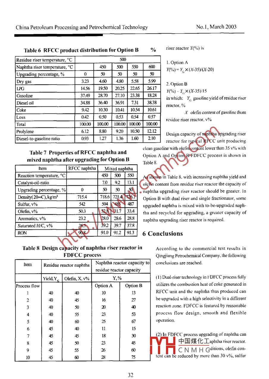 Advances in Refining TechnologyCommercial Test of Flexible Dual-RiserCatalytic Cracking ProcessTang Haitao'; Wang Longyan'; Wang Guoliang'; Zhang Lixin'Wei Jialu2; Chen Zhenghong; Teng Tiancan'; Sun Zhonghang'(I.Luoyang Petrochemical Enginnering Company of SINOPEC,Luoyang,4710032.Qingjiang Petrochemical Company' of SINOPEC)Abstract:The technical features and commercial test results of flexible dual-riser f1uidived catalytic cracking(FDFCC) process are presented for refiners to choose an efficient process to upgrade FCC naphtha and boostpropylene production in a RFCC unit. The commercial Lest resuls indicatce that the olefin content of catalyi-cally cracked gasoline can be sigmificanly reduced to lcss than 20 vV%, while sulfur content reduced by 15%6625% and RON incrcased by 0.5- 2 units in a RFCC unit. In addition. propylene yield and the production ratioof dicscl to gasoline can also be remarkably enhanced in the RFCC unit,key words: RFCC; dual-riser: commercial test下年2 A1 Introductionupgrade naphtha in scparatc riscr reactors under differentopcration conditions. I nol only eficintly upgrades naphtha.Flexible dual-riser catalytic cracking (FDFCC) process devel- but also makes operation in residue riser reactor more efctive.oped by Luoyang Petrochemical Engineering Companyadopts dual-riser technology to process low grade residueThere are two options for upgrading naphtha in FDFCC. Inand upgrade naphtha in separate riser reactors and under Option A, a second fractionator is sct up at the outlet ofdifferent operation conditions. Commercial test of this pro-naphtha upgrading rcactor and upgraded naphtha directlycess in Qingjiang Petrochemical Company passed technical cntcrs the absorption/stabilization system, eliminating mix-appraisal organized by R&D department of SINOPEC. It ising and recycling of upgraded naphtha with to-be -upgradedconcluded by thc appraisal that as compared with conven-naphtha and greatly enhancing the efficiency of naphthational FCC process FDFCC can reduce olefin content of gaso-upgrading. The operation of the main fractionator of RFCC isline by more than 20 v%. sulfur content by 15%- 25% andnot affected. In Option B, naphtha upgrading reactor andincrease RON and MON by 0.5- 2 units each in a RFCC unit.residue riser reactor share the same fractionator. UpgradedThe production ratio of diesel to gasoline can be remarkablynaphtha is scent back to the main fractionator to be mixed withenbanced and propylene yield can be increased by 3%- 6 %.to-be-upgraded naphtha. One part of the mixed naphtha en-Commercial application of FDFCC is strongly recommended.ters the adsorption/stabilization system and the other partenters naphtha upgrading reactor for recyeled upgrading. TheCommercial test of FDFCC process was conducted byflow diagrams of these two options arc shown below.Luoyang Petrochemical Engineering Company and QingjiangPetrochemical Company in a 120 kta dual-riser RFCC unit toThe 120 kt/a dual-riser FCC unit in Qingjiang Petrochemicalverify pilot test results and accumulate commercial operationc ompany is designed by Luoyang Petrochemical Engineer-experience.ing Company. Residue riser reactor and naphtha upgradingriser reactor have separate disengagers, but share common2 Technical Features and Commercialstripper, regenerator and fractionator.Test Plan中國煤化工DuringYHC N M H Gochemical CompanyFDFCC adopts dual-riser to process low. grade residue andOption A was simulated with two risers and two firactionators.29China Petroleum Processing and Petrochemical TechnologyNo. l, March 20033 FDFCC Feed and CatalystThe 120 kta dual-riser FCC unit used 75%i atmospheric resi-言due of Subei Oil Field and 25%、acuum residue of Subei Oil當(dāng)Field as feed for residue riser reactor. Ihe 500 kta RFCC unitused 60% Subei almospheric residue and 40%。Subei gasoilas feed. The catalyst for commercial test was comnmercial mixedcquilibrium catalyst of maximum diesel yicld type LRC-99 andResidue .MLC-500.The properties of feed oil and calalyst are listed inTable 1 and Table 2.Option 4: FDFCC process with dual riser,4 Commercial Test Resultsdual fractionuator4.1 Option A (dual riser, dual fractionator)Product distribution of naphtha upgrading and properties凰before and after upgrading for simulated Option A commer-cial test are listed in Tablc 3 and fable 4 respectively.百RFCC producl distribution and its performance for Option Aarc listed in Table 5. Upgrading percentagc refers to the ratioTable I Properties of feed oil for commercial testRcsuduc[temOption A .Option BOption B: FDFCC process with dual riser,| Residue feedsingle fractionatorDensity( 20cC).kg/m?90029193Figure I The f!owv diagrams of theseViscosiy(100ocC),mm'/s10.7424.571v0 optionsSulfur,ug/g32063128Carbon residue, %3.527.05Outsourced naphtha frum 500 kt/a RFCC unit was Laken asSaturated hydrocarbon. %60.750.2the fccl for naphtha upgrading riser reactor. Then 0)ption BAromatic hydrocarbon, %22.428.2was lested by using naphtha from the 120 kU/a dual-riser FCCResin & asphaltene, %16.921.6unit itself as the feed for naphtha upgrading riser reactor. Theperformance of naphtha upgrading riser reactor was exam-Table 2 Properties of equilibrium catalyst forined and its impact on FCC product ditribution and qualitycommercial testwas studicd .Option A.Option BSpecific surface area, m/g107.7116.6In the process of comnercial test and calibration. in additionPore volume, mUg0.1310.152to metering and sampling analysis of conventional FCCprocess. a special ditillatle sanpling device was installed atApparent density, g/ml0.83the outlet of naphtha upgrading riser reactor for periodic sam-Ni, mg/g87659347pling and analysis. The composition and properties of gasV.mg中國煤化工0.10600and liquid products of naphtha upgrading can be directlyCarbonMicrorYHCNMHG63.0monitored.30Advances in Refining TechnologyTable 3 Product distribution of naphtha upgrad- percentage. the cracking severity of naphtha and gas yielding for Option A%i