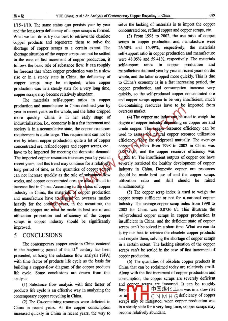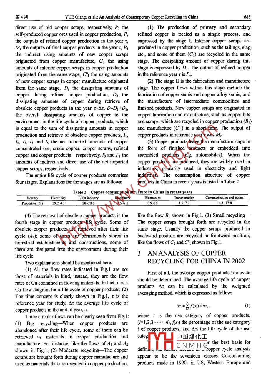 第6卷第4期過程工程學(xué)報(bào)Vol.6 No.42006年8月The Chinese Journal of Process EngineeringAug. 2006An Analysis of Contemporary Copper Recycling in ChinaYUE Qiang(岳強(qiáng)),LU Zhong-wu(陸鐘武)(SEPA Key Laboratory on Eco-Industry, Northeastern Universit, Shenyang, Liaoning 10004, China)Abstract: Copper consumption increased very quickly in China in recent years, which could not be met by inland copperindustry. In order to achieve a sustainable development of copper industry, an analysis of copper recycling in China wasnecessary. For the life cycle of copper products a copper-flow diagram with time factor was worked out and the contemporarycopper recycling in China was analyzed, ftom which the following data were obtained. The average life cycle of copperproducts was 30 years. From 1998 to 2002, the use ratio of copper scraps in copper production, the use ratio of copper scrapsin copper manufacture, the materials self-support ratio in copper production, and the materials self-support ratio in coppermanufacture were 26.50%, 15.49%, 48.05% and 59. 41%, respectively. The materials self-support ratios in copper productionand manufacture declined year by year in recent years on the whole, and the ltter dropped more quickly. The average indexof copper ore and copper scrap from 1998 to 2002 were 0.8475 t and 0.0736 t respectively, and copper resource eficiencywas 1.1855 Ut. Some efforts should be paid to reduce copper ores consumption and promote copper scraps regeneration.Copper scraps were mostly imported from foreign countries because of shortage in recent years in China. Here the reasonsrelated to copper scraps deficiency were also demonstrated. But we can forecast: when copper production was in a slow riseor in a steady state in China, the deficiency of copper scraps may be mitigated; when copper production was in a steady statefor a very long time, copper scraps may become relatively abundant. According to the status of copper industry in China, theraw materials of copper production and manufacture have to depend on oversea markets heavily in recent years, and at thesame time, the copper scraps using proportion and eficiency in copper industry should be improved.Key words: copper scrap; copper recycling; copper-flow diagram of the life cycle of copper products; self-support ratio;copper ore index; copper scrap index; copper resource eficiencyCLC No.: TF811Document Code: AArticle ID: 1009- 606X(2006)04 -0683-081 INTRODUCTIONcopper ore resources is as follows: reserves arerelatively abundant, but mostly in low grades; copper1.1 Backgroundores are dfficult for mining and milling; the reserve perCopper is an important basic material and widelycapita is deficient'. As a developing country,used in many fields, such as electricity, light industry,consumption of copper ores in China increased moreindustrial machinery,electronics, transportation,quickly than those in developed countries. Comparedcommunication and national defense, etc. The demandwith the demand, the supply of copper ores was severelyfor copper increased quickly in China in recent yearsin shortage and the self-support ratio of copper ores waswith the rapid development of economy, as indicated inonly about 50%. In the early stage of the 21st century,Table 1. China has become the largest country in copperthe condition of copper ore was austere. So theconsumption since 2002. Along with the rapidregeneration of copper scraps has an importantincrement of consumption, copper production in Chinasignifcance for the copper industry in China. Firstly,can not meet the demand, and the gap has to be filled byusing of copper scraps can reduce the consumption ofoversea markets.non-renewable resources- copper ores, and secondly, itThe reserves of copper ores in China are proved incan reduce consumption of energy and decreasethe fourth place throughout the world. The status quo ofenvironmental pollution.Table 1 Production and consumption of refined copper in China in 1995~2002 (x10*t)Year1995 1996 1997 1998 1 9992000 2001 2002 Increasing rate (%)Production107.97 11919 1l 794121.13 117.42 137.11 152.33 163.256.08Cosumption 114.70 119.27 126.97 140.22 148.42 192.81 230.73. 268.4412.92%Note: The data come from China Noferrous Metals Industy Yearbook (1996中國煤化工TYHCNMHGReceived date: 2005- -10- -18; Accepted date: 2006 -04 -08Foundato ti spre Key TccloierD‘Ce Pogamme (No 203A614A-42)Biography: YUE Qiang(1975-), male, native of Anshan City, Liaoning Province, Ph.D, lecturer, major in material flow analysis.684過程工程學(xué)報(bào)第6卷,An analysis of contemporary copper recycling ofin this paper, such as Kapur et al.5J on Asian copperChina is very useful in finding the recycling status quo cycle, Spatari et al.4 on European copper cycle, andof copper scraps in copper industry in China, which canlan Beers et al.sl on African copper cycle; Most ofhelp to attain the savings of Cu-containing resourcesthem are the components of the Stocks and Flowsand achieve a sustainable development in the industry.(STAF) Project of the Center for Industrial Ecology at1.2 The Investigative Status Quo of CopperYale University, which seeks a comprehensiveRecycling in China and Abroadaccounting of the anthropogenic mobilization of copperThe method of substance flow analysis is used inand other metals in the industrial economy; and worksanalyzing copper recycling in the present work.of Ayresl2.0), Graedel and Allenby", Kleijn, HansenSubstance flow analysis (SFA) is an effective tool fornd Lassen on theory and practice in general. It isstudying the industrial metabolism of specificclear that in developed countries the method of SFA hassubstances (e.g. copper, aluminum) in a certain spatial been shaped, and a wealth of experience accumulated.scale, for example, in the scale of a nation, a region or aCopper flow analysis in China was lacking and fewfirm. Industrial metabolism means the whole integratedpapers were published on it. There