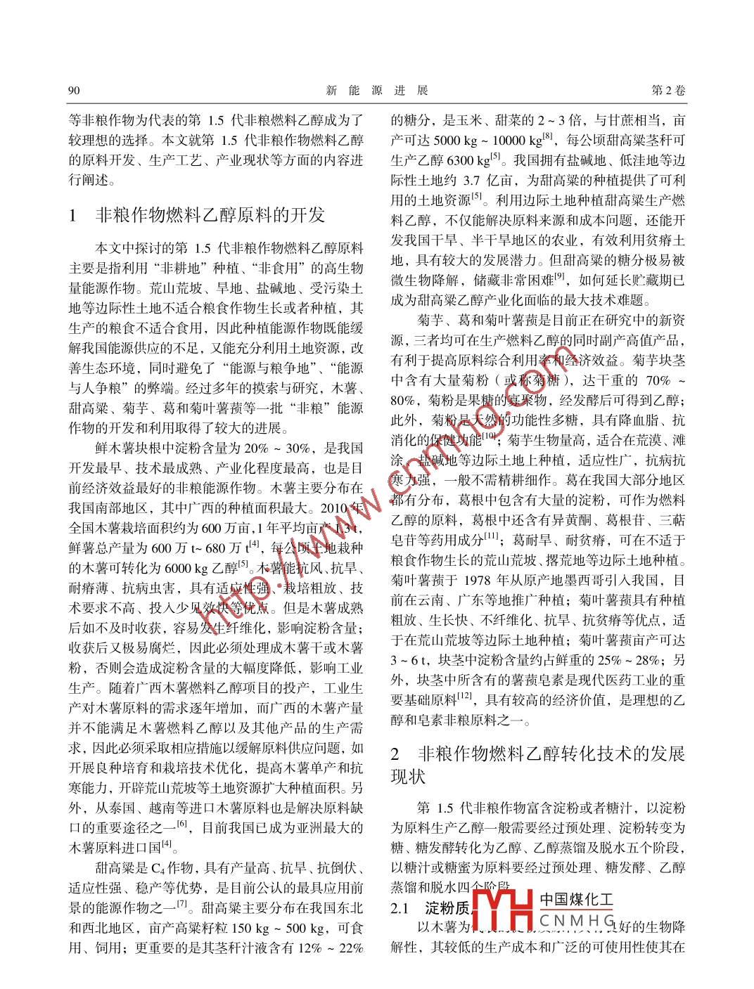 第2卷第2期新能源進(jìn)展Vol 2 No. 22014年4月ADVANCES IN NEW AND RENEWABLE ENERGYApr.2014文章編號(hào):2095-560X(2014)020089-05我國(guó)非糧作物燃料乙醇技術(shù)與產(chǎn)業(yè)發(fā)展現(xiàn)狀王霞1,陳迪嘉23,葉廣英23,謝君23(1.茂名職業(yè)技術(shù)學(xué)院,化學(xué)工程系,茂名525000;2.華南農(nóng)業(yè)大學(xué),新能源與新材料研究所,廣州510642農(nóng)業(yè)部能源植物資源與利用重點(diǎn)實(shí)驗(yàn)室,廣州510642)摘要:非糧燃料乙醇是我國(guó)生物質(zhì)能源發(fā)展的重點(diǎn)之一。本文就我國(guó)木薯、甜高粱、菊芋、葛和菊葉薯蕷等幾種非糧能源作物的資源優(yōu)勢(shì)、非糧乙醇轉(zhuǎn)化技術(shù)及其產(chǎn)業(yè)發(fā)展現(xiàn)狀進(jìn)行探討,并對(duì)我國(guó)非糧作物燃料乙醇產(chǎn)業(yè)的可持續(xù)發(fā)展提出了建議關(guān)鍵詞:燃料乙醇;非糧能源作物;淀粉;糖質(zhì)中圖分類號(hào):TK6文獻(xiàn)標(biāo)志碼:Adoi:10.3969/issn.2095560X.2014.02.002Development of Technology and Industrialization ofNon-Grain Crops Fuel EthanolWANG Xia, CHEN Diii 2.3 YE Guang-ying", XIE Jun2,3(1. Department of Chemical Engineerin, Maoming Polytechnic College, Maoming 525000, China2. Institute of New Energy and New Materials, South China Agriculture University, Guangzhou 510642, China3. Key Laboratory of Energy Plants Resource and Utilization, Ministry of Agriculture, Guangzhou 510642, China)Abstract: Non-grain fuel ethanol is one of emphases on the development of biomass energy in China. Non-grain energycrops, such as cassava, cane, Jerusalem artichoke, kudzu, and Dioscorea composite, etc, are discussed from aspects ofresource advantages, development of ethanol conversion technology, and industrialization in China. Suggestions about howto develop non-grain crops fuel ethanol industry are proposed in this articleKey words: fuel ethanol; non-grain energy crops; starch; sugariness0引言化技術(shù)創(chuàng)新、推進(jìn)液體燃料等生物質(zhì)能源產(chǎn)品規(guī)?;a(chǎn)與示范”的發(fā)展需求。2012年,我國(guó)燃料乙可再生能源是解決我國(guó)能源供需矛盾、改善能醇產(chǎn)量約為166萬(wàn)t,是繼美國(guó)和巴西之后的第三大源結(jié)構(gòu)和實(shí)現(xiàn)可持續(xù)發(fā)展的戰(zhàn)略選擇。近年來(lái),作燃料乙醇生產(chǎn)國(guó)。第1代糧食燃料乙醇主要以玉米、為一種能替代化石燃料的清潔液體燃料能源,生物甘蔗等為原料,雖然為環(huán)境倸護(hù)、節(jié)能減排、降低石燃料乙醇受到了人們的關(guān)注。生物質(zhì)乙醇的廣泛油消耗做出了較大貢獻(xiàn),但是也存在過(guò)度消耗糧食、應(yīng)用,使其在全球范圍內(nèi)的產(chǎn)量大幅提高凹。根據(jù)與人畜爭(zhēng)奪口糧、與糧林爭(zhēng)奪土地的弊端。第2代纖2007年9月國(guó)家發(fā)展和改革委員會(huì)公布的《可再生維素乙醇具有資源豐富、成本低廉、綠色環(huán)保、低能源中長(zhǎng)期發(fā)展規(guī)劃》,預(yù)計(jì)2020年我國(guó)可再生能碳節(jié)源、不爭(zhēng)糧、不爭(zhēng)地等特點(diǎn),符合世界能源發(fā)源消費(fèi)量將達(dá)到能源消費(fèi)總量的15%左右,而生物展趨勢(shì)和環(huán)保潮流,受到國(guó)家政策支持,發(fā)展?jié)摿θ剂弦掖甲鳛橹攸c(diǎn)發(fā)展對(duì)象之一,年利用量將達(dá)到巨大,然而生產(chǎn)成本高使其產(chǎn)業(yè)化進(jìn)程緩慢。我1000萬(wàn)t。2012年,科技部發(fā)布了《生物質(zhì)能源科國(guó)是人口大國(guó),糧食安全是關(guān)乎國(guó)家穩(wěn)定的首要問(wèn)技發(fā)展¨“十二五”重點(diǎn)專項(xiàng)規(guī)劃》,明確了我國(guó)“加題?,F(xiàn)階段,在發(fā)展糧食燃料乙醇不可行、纖維素快新型能源植物的規(guī)?;嘤?、加強(qiáng)生物質(zhì)高效轉(zhuǎn)燃料乙醇暫不圍經(jīng)洺性的背晷下以木薯、甜高粱中國(guó)煤化工*收稿日期:201309-04修訂日期:201404-10CNMHG基金項(xiàng)目:廣東省科技計(jì)劃重點(diǎn)項(xiàng)目(2011B090400437);“十二五”國(guó)家科技支撐計(jì)劃(201BAD22B01)通信作者:謝君,E-mail:xIejun@scau.edu.cn新能源進(jìn)展第2卷等非糧作物為代表的第1.5代非糧燃料乙醇成為了的糖分,是玉米、甜菜的2~3倍,與甘蔗相當(dāng),畝較理想的選擇。本文就第1.5代非糧作物燃料乙醇產(chǎn)可達(dá)5000kg-1000kg48,每公頃甜高粱莖稈可的原料開(kāi)發(fā)、生產(chǎn)工藝、產(chǎn)業(yè)現(xiàn)狀等方面的內(nèi)容進(jìn)生產(chǎn)乙醇6300kg3。我國(guó)擁有鹽堿地、低洼地等邊行闡述際性土地約3.7億畝,為甜高粱的種植提供了可利用的土地資源。利用邊際土地種植甜高粱生產(chǎn)燃1非糧作物燃料乙醇原料的開(kāi)發(fā)料乙醇,不僅能解決原料來(lái)源和成本問(wèn)題,還能開(kāi)本文中探討的第1.5代非糧作物燃料乙醇原料發(fā)我國(guó)干旱、半干旱地區(qū)的農(nóng)業(yè),有效利用貧瘠土主要是指利用“非耕地”種植、“非食用”的高生物地,具有較大的發(fā)展?jié)摿?。但甜高粱的糖分極易被量能源作物。荒山荒坡、早地、鹽堿地、受污染土微生物降解,儲(chǔ)藏非常困難,如何延長(zhǎng)貯藏期已地等邊際性土地不適合糧食作物生長(zhǎng)或者種植,其成為甜高粱乙醇產(chǎn)業(yè)化面臨的最大技術(shù)難題生產(chǎn)的糧食不適合食用,因此種植能源作物既能緩菊芋、葛和菊葉薯蕷是目前正在硏究中的新資解我國(guó)能源供