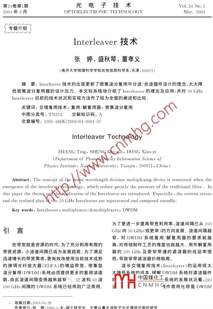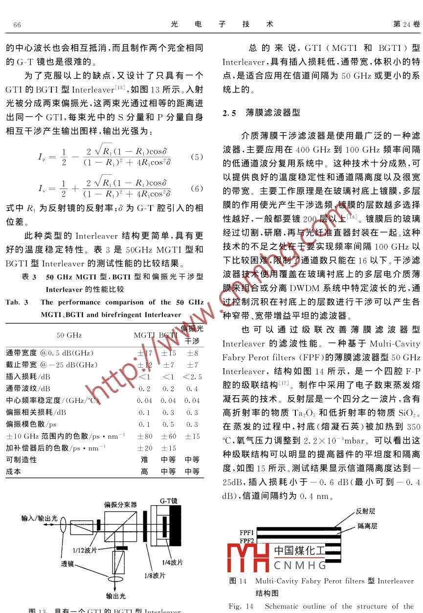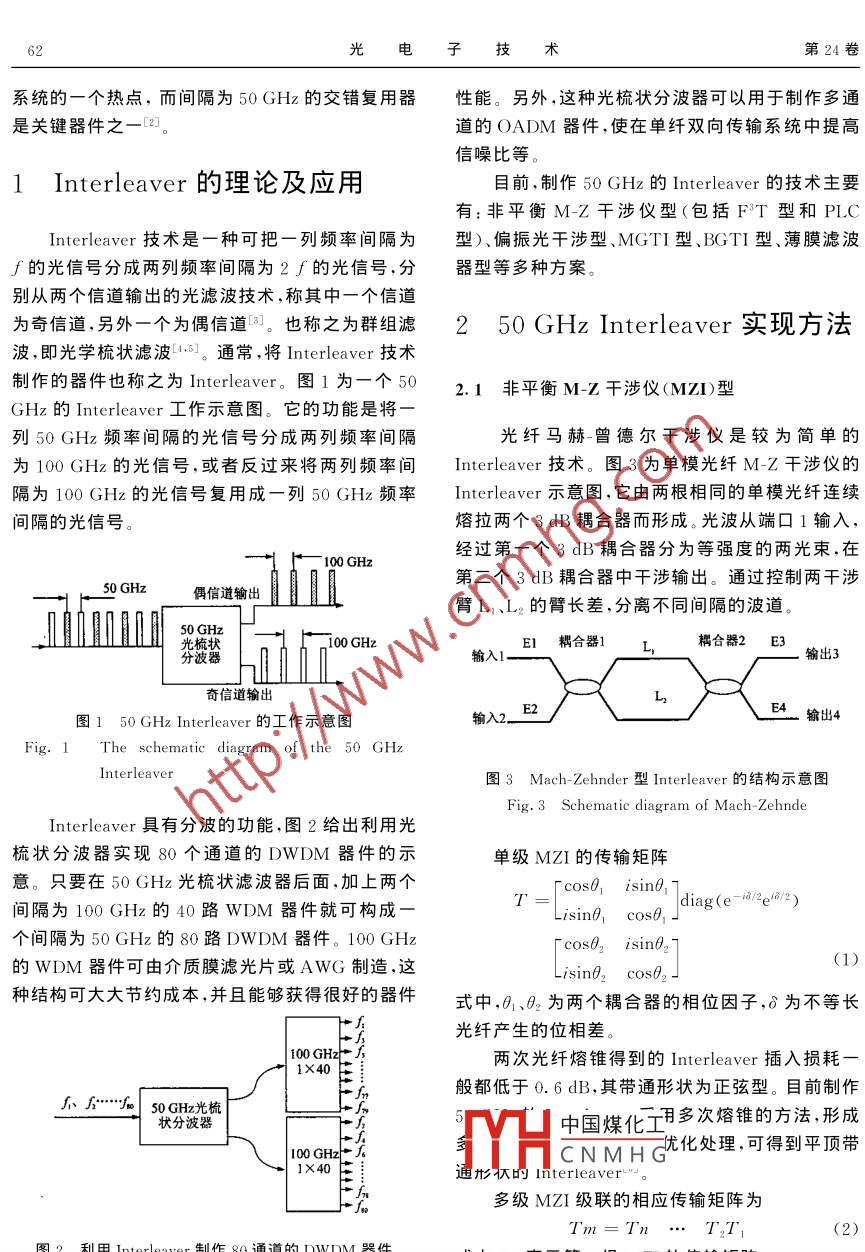 第24卷第1期光電子技術(shù)Vol.24No.1.2004年3月OPTOELECTRONIC TECHNOLOGYMar. 2004多專題介紹Interleaver技術(shù)張婷,盛秋琴,董孝義(南開大學(xué)物理科學(xué)學(xué)院光電信息科學(xué)系,天津,300071)摘要: Interleaver技術(shù)的出現(xiàn)更新了密集波分復(fù)用中分波/合波器件設(shè)計(jì)的理念,大大降低密集波分復(fù)用器的設(shè)計(jì)壓力。本文較系統(tǒng)地介紹了Interleaver 的理論及應(yīng)用,并對50 GHzInterleaver目前的技術(shù)狀況和實(shí)現(xiàn)方法作了較為全面的闡述和比較。關(guān)鍵詞:交錯復(fù)用技術(shù);復(fù)用/解復(fù)用器;密集波分復(fù)用中圖分類號: TN253文獻(xiàn)標(biāo)識碼: A文章編號: 1005-488X (2004 )01 -0061-07Interleaver T echnologyZHANG Ting, SHENG Qiu-qin, DONG Xiao-yi(Department of Photoelectricity Information Science ofPhysics Institute, Nankai University, Tianjin, 300071, China)Abstract: The concept of the dense wavelength division multiplexing device is renovated when theemergence of the interleaver technology,which reduce greatly the pressure of the traditional filter . Irthis paper the theory and the application of the Interleaver are introduced. Especially, the current statusand the realized plan of the 50 GHz Interleaver are represented and compared roundly.Key words: Interleaver; multiplexers/demultiplexers; DWDM為了更進(jìn)一步提高帶寬利用率,波道間隔已從100引言GHz向50GHz(或更窄)的方向發(fā)展。波道間隔越窄,對DWDM系統(tǒng)復(fù)用/解復(fù)用器的要求就越在帶寬就是資源的時代,為了充分利用有限的高,對傳統(tǒng)制作工藝的難度也就越大。用作解復(fù)用帶寬資源,小波道間隔已成為發(fā)展趨勢。為了滿足器的100GHz及更窄帶通的濾波器的成品率很迅速增長的帶寬需求,更有效地使用當(dāng)前技術(shù)成熟低,導(dǎo)致窄帶濾波器價(jià)格極高。的摻鉺光纖放大器(EDFA)的增益帶寬,密集型波長交錯復(fù)用技術(shù)(Interleaver)的運(yùn)用將大波分復(fù)用(DWDM)系統(tǒng)必須提供更多的復(fù)用波道大降低系統(tǒng)的成本.緩解DWDM系統(tǒng)對濾波器件數(shù),由此波道間隔變得越來越窄1。32波和40波YH中國煤化工系統(tǒng)的發(fā)展?fàn)顩r看160100GHz間隔的DWDM系統(tǒng)已經(jīng)得到廣泛商用。CNMHC魯件商用化將是DWDM.收稿日期:2003-04-28作者簡介:張婷(1980-),女,碩士研究生。主要從事光波電子與光通信方面的研究。盛秋琴(1946-),女,教授。主要從事光電子與光通信方面的研究。董孝義(1936-),男,教授。主要從事信息光電子學(xué)與現(xiàn)代光通信方面的研究。62光電子技術(shù)第24卷系統(tǒng)的一個熱點(diǎn),而間隔為50GHz的交錯復(fù)用器性能。另外,這種光梳狀分波器可以用于制作多通是關(guān)鍵器件之一[2]。道的OADM器件,使在單纖雙向傳輸系統(tǒng)中提高信噪比等。1Interleaver的理論及應(yīng)用.目前,制作50 GHz的Interleaver的技術(shù)主要有:非平衡M-Z干涉儀型(包括F"T型和PLCInterleaver技術(shù)是-種可把-列頻率間隔為型)、偏振光干涉型、MGTI型、BGTI型、薄膜濾波f的光信號分成兩列頻率間隔為2 f的光信號,分器型等多種方案。別從兩個信道輸出的光濾波技術(shù),稱其中一個信道為奇信道,另外一個為偶信道[3]。也稱之為群組濾2 50 GHz Interleaver實(shí)現(xiàn)方法波,即光學(xué)梳狀濾波(1.5]。通常,將Interleaver技術(shù)制作的器件也稱之為Interleaver。圖1為一個502.1非平衡 M-Z干涉儀(MZI)型GHz的Interleaver工作示意圖。它的功能是將一列50GHz頻率間隔的光信號分成兩列頻率間隔光纖馬赫曾德爾干涉儀是較為簡單的為100GHz的光信號,或者反過來將兩列頻率間Interleaver 技術(shù)。圖3為單模光纖M-Z干涉儀的隔為100GHz的光信號復(fù)用成一列50 GHz頻率Interleaver示意圖,它由兩根相同的單模光纖連續(xù)間隔的光信號。熔拉兩個3dB耦合器而形成。光波從端口1輸入,經(jīng)過第一個3dB耦合器分為等強(qiáng)度的兩光束,在上100 GHz第二個3dB耦合器中干涉輸出。通過控制兩干涉50 GHz偶信道輸出臂L、L2的臂長差,分離不同間隔的波道。光梳狀100 GHz輸入1-E1 耦合器1L耦合器2 E3輸出3分波器奇信道輸出E2E4輸出4圖150 GHz Interleaver的工作示意圖輸入2_Fig.1The schematic diagram of the 50 GHzInterleaver .圖3 Mach-Zehnder 型Interleaver的結(jié)構(gòu)示意圖Fig. 3 Schematic diagram of Mach- ZehndeInterleaver具有分波的功能,圖2給出利用光梳狀分波器實(shí)現(xiàn)80個通道的DWDM器件的示單級MZI的傳輸矩陣意。只要在50GHz光梳狀濾波器后面,加上兩個T=「cos0, isin0, ]diag(e- i12eg/2))間隔為100GHz的40路WDM器件就可構(gòu)成一Lisinθ, cosθ, 」個間隔為50GHz的80路DWDM器件。100GHz.「cos02 isinθ27的WDM器件可由介質(zhì)膜濾光片或AWG制造,這Lisinθ2 cosO2 」種結(jié)構(gòu)可大大節(jié)約成本,并且能夠獲得很好的器件式中,0、02為兩個耦合器的相位因子,8為不等長光纖產(chǎn)生的位相差。100 GHzC后兩次光纖熔錐得到的Interleaver插入損耗一1X40般都低于0.6 dB,其帶通形狀為正弦型。目前制作爪f*.50GHz光梳狀分波器中國煤化工用多次熔錐的方法,形成優(yōu)化處理,可得到平頂帶100 GHz JCNMH G通形狀的Interleaver。多級MZI級聯(lián)的相應(yīng)傳輸矩陣為Tm= Tn ... T2T;圖2利用 Interleaver制作80通道的DWDM器件式中T'n表示第n級MZI的傳輸矩陣。Fig.2 80 channel DWDM device with Interleaver圖4為一種采用M-Z干涉串聯(lián)結(jié)構(gòu)的第1期張婷等: Interleaver 技術(sh
