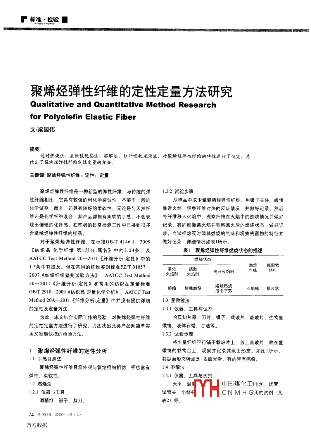 r標準.檢驗.聚烯烴彈性纖維的定性定量方法研究Qualitative and Quantitative Method Researchfor Polyolefin Elastic Fiber文/梁國偉摘要:通過燃燒法、顯微鏡觀察法、溶解法、紅外吸收光譜法,對聚烯烴彈性纖維的特性進行了研究,總結(jié)出了聚烯烴彈性纖維定性定量的方法。關(guān)鍵詞:聚烯烴彈性纖維:定性:定量聚烯烴彈性纖維是-種新型的彈性纖維,與傳統(tǒng)的彈1.2.2試驗步驟性纖維相比.它具有較強的耐化學(xué)腐蝕性.不溶于一般的從樣品中取少量聚烯烴彈性纖維.用鑷子夾住.緩慢.化學(xué)試劑,而且.還具有較好的柔軟性.無論是與天然纖靠近火焰.觀察纖維對熱的反應(yīng)情況.并做好記錄。然后維還是化學(xué)纖維混合,其產(chǎn)品都擁有柔軟的手感,不會表將纖維移入火焰中,觀察纖維在火焰中的燃燒情況并做好現(xiàn)出僵硬的化纖感。在筆者的日常檢測工作中已接到很多記錄。將纖維撤離火焰并觀察離火后的燃燒狀態(tài).做好記含聚烯烴彈性纖維的樣品。錄。當(dāng)試樣熄滅時聞其燃燒的氣味和觀察殘留物的特征并對于聚烯烴彈性纖維.在標準GB/T 4146.1-2009做好記錄。詳細情況如表1所示?!都徔椘坊瘜W(xué)纖維第1部分:屬名》中的3.24條,及表l聚烯烴彈性纖維 燃燒狀態(tài)的描述AATCC Test Method 20- -2011《纖維分析:定性》中的燃燒狀態(tài)1.3條中有提及。但在常用的纖維鑒別標準FZ/T 01057-靠近接觸.燃燒殘留物離開火焰時氣味特征2007《紡織纖維鑒別試驗方法》. AATCC Test Method火焰時20--2011《纖維分析:定性》和常用的紡織品定量標準熔縮熔融燃燒熔融燃燒石蠟味蠟片狀GB/T 2910- -2009 《紡織品定量化學(xué)分析》. AATCC Tcst液態(tài)下落Method 20A- 2011《纖維分析:定量》中并沒有提供詳細1.3 顯微鏡法的定性及定量方法。1.3.1 儀器、工具與試劑為此,本文結(jié)合實際工作的經(jīng)驗,對聚烯烴彈 性纖維哈氏切片器、刀片、鑷子、載玻片、蓋玻片.生物顯的定性定量方法進行了研究.力圖找出此類產(chǎn)品既簡單實微鏡、液體石蠟.甘油等。用又準確快捷的檢驗方法。1.3.2試驗步驟將少量纖維平行鋪于載玻片上,蓋上蓋玻片.放在顯I聚烯烴彈 性纖維的定性分析微鏡的載物臺上,觀察并記錄其縱面形態(tài)。如圖1所示.1.1手感目測法其縱面形態(tài)特點是:表面光滑.有的帶有疤痕。聚烯烴彈性纖維目測外觀與氨綸粗細相仿.手感富有1.4溶解法彈性、柔軟性。1.4.1 儀器、工具與試劑1.2燃燒法天平.中國煤化工電爐.試管.1.2.1儀器與工具試管夾.小燒材YHCNMHG用的試劑(見酒精燈、鑷子.剪刀。表2)等。74中國纖檢 2013年 1月(E:)■標準.檢驗1收峰。/i圖2聚烯烴彈性纖維 的紅外吸收光譜圖2聚烯烴彈性纖維 與其他纖維的混合物的定量圖1聚烯烴彈性纖維 縱面形態(tài)分析1.4.2試驗步驟由于聚烯烴彈性纖維屬于彈性纖維,所以,-般情況將少量聚烯烴彈性纖維放入試管或小燒杯中,加入適下可以采用手工分解法對其進行定量。如果對于某些不容量的常用試劑.在常溫下?lián)u動Smin。如果在常溫條件下不易拆的樣品,也可以根據(jù)以上的溶解性能,根據(jù)具體的情溶解,可以用封閉電爐加熱至沸騰,并保持3min,觀察溶況選擇適當(dāng)?shù)脑噭捎萌芙夥ㄟM行定量:①當(dāng)聚烯烴彈解情況。聚烯烴彈性纖維在常用試劑中的溶解性能如表2性纖維與纖維素纖維混合時可采用75%硫酸進行定量:②所示。當(dāng)聚烯烴彈性纖維與毛、絲等蛋自質(zhì)纖維混合時可采用次表2聚烯烴彈性纖維 的溶解性能氯酸鈉溶液進行定量:③當(dāng)聚烯烴彈性纖維與錦綸混合時溫度溶解情況可采用80%甲酸進行定量:④當(dāng)聚烯烴彈性纖維與腈綸混95%~ 98%硫酸常溫合時可采用N, N-二甲基甲酰胺進行定量:⑤當(dāng)聚烯烴彈煮沸性纖維與聚酯纖維混合時可采用98%濃硫酸進行定量。在75%硫酸日常檢驗中,筆者利用這些方法進行定量.取得了很好的效果。20鹽酸80%甲酸通過上面的研究分析可見.聚烯烴彈性纖維外觀比較細,燃燒時有石蠟味.而且化學(xué)穩(wěn)定性較好.不溶于- -般Imo/L次氯酸鈉的試劑,紅外吸收光譜圖也具有很明顯的吸收峰。利用這些特征比較容易地就能將其與其他彈性纖維進N. N-二甲基甲酰胺行區(qū)別。比如氨綸溶于濃硫酸.而聚烯烴彈性纖維不溶:丙酮二烯類彈性纖維一般比較粗. 燃燒時有燒橡膠的味道.而聚烯烴彈性纖維比較細,燃燒時是石蠟味。二甲苯另外.利用聚烯烴彈性纖維化學(xué)穩(wěn)定性較好的特點,也很容易對其進行定量分析。苯酚/四氯乙烷參考文獻:[1]FZ/T 01057- 2007紡織纖維鑒別試驗方法[S].環(huán)己酮.'ss[2]GB/T 2910- 2009 紡織品定量化學(xué)分析[S].注:S-溶解;P-部分溶解;PSS- 微溶;I- -不溶解; O一溶脹。[3] AATCCTM 20- 2011纖維分析:定性[S].1.5紅外光譜鑒別法[4]AATCC 1中國煤化工].聚烯烴彈性纖維的紅外吸收光譜圖如圖2所示。由圖[5]GB/T 4146.YHCNMHG部分:屬名[S].可見,在2918cm*'. 2849cm'. 1463cmi 處有很明顯的吸(作者單位:廣州市纖維產(chǎn)品檢測院)2013年1月(上)中國纖檢 75