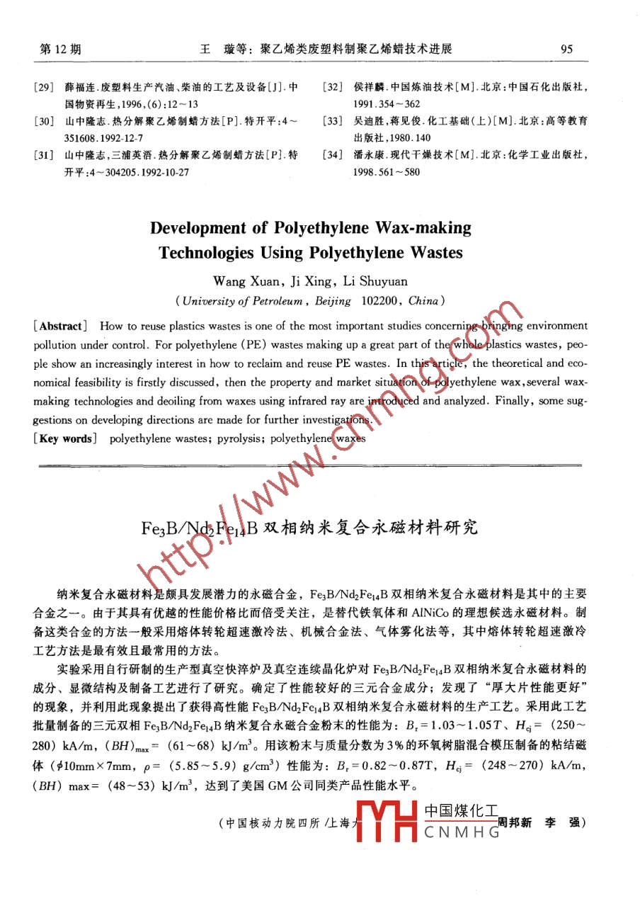 2001年12月中國工程科學Dec.2001第3卷第12期Engineering Science _Vol.3 No.12綜合述評聚乙烯類廢塑料制聚乙烯蠟技術(shù)進展王璇,冀星,李術(shù)元(石油大學化工學院,北京102200)[摘要]廢舊塑料的回收利用是近年來治理環(huán)境污染的一個重要課題。廢聚乙烯(PE) 在塑料垃圾中占有很大的比例,如何對其進行合理的回收、利用已成為人們十分關(guān)心的問題。從理論和經(jīng)濟兩方面分析了廢聚乙烯裂解制取聚乙烯蠟技術(shù)的可行性,介紹了棗乙烯蠟的性能及市場情況,分析比較了幾種有代表性的制蠟工藝,綜合評價了這些工藝技術(shù)的應(yīng)用范圍和優(yōu)缺點。還簡要介紹了紅外脫油技術(shù),并對該技術(shù)的研究和應(yīng)用方向提出了一些建議。[關(guān)鍵詞]聚乙烯類廢塑料;熱解;聚乙烯蠟化學回收是將高分子化合物經(jīng)熱解或催化裂引言解,制成小分子的化合物[1,主要有產(chǎn)氣技術(shù)[7],近年來,塑料的產(chǎn)量和用量逐漸增加,目前全產(chǎn)油技術(shù)和產(chǎn)蠟技術(shù),均有專利報導。對廢塑料的世界總產(chǎn)量已超過1X108t。我國的塑料工業(yè)在80油化研究開展較早,目前已經(jīng)基本成熟,并在某些年代后開始飛速發(fā)展,年產(chǎn)量以近20%的速度增國家實現(xiàn)了工業(yè)化。該技術(shù)可用于處理混合熱塑性長[1]。到1995年我國塑料生產(chǎn)量已達994X 10* t,廢塑料,具有較好的經(jīng)濟效益。廢塑料油化的工藝成為世界塑料制品生產(chǎn)大國(2]。2000年塑料產(chǎn)量主要有:熱解工藝、催化裂解工藝以及兩者結(jié)合的估計達到10 Mt,而且每年還會進口不少塑料原兩段法。熱解法是直接對廢塑料進行加熱使其分解料、半制成品和制成品(3]。各種塑料產(chǎn)品的應(yīng)用的方法[8],它具有工藝簡單、設(shè)備裝置成本低的給人類的生產(chǎn)和生活帶來了極大的方便,但也因此優(yōu)點,但是得到的汽、柴油質(zhì)量不佳,僅適用于對導致了人類生存環(huán)境的惡化。產(chǎn)品要求不高的回收廠使用。催化裂解法是將廢塑廢塑料的回收利用方法主要有:填埋法、焚燒料與催化劑按照一定比例混合,然后送人反應(yīng)器中法、再生利用法和化學回收法。填埋法因其簡單易進行裂解的方法[9]; 兩段法是指先將廢塑料置于行,幾乎不需要成本,在很多國家得到采用,但資熱解反應(yīng)器中進行熱解,然后對裂解氣進行催化改源利用率極低[5],同時也會造成環(huán)境污染。焚燒質(zhì)[10,11]。相比較而言,前者的工藝比較簡單,但法是將廢塑料燃燒轉(zhuǎn)化為熱能的處理方法。該方法催化劑無法再生,操作成本很大,所以目前的油化可以用來處理混合廢塑料,但燃燒產(chǎn)生的氣體中含工藝基本.上采取的是兩段法。典型的工藝有日本的有致癌的二鮊英及其它有害氣體,給人類健康造成富士回收法,德國的BASF回收法等。在我國,廢危害[4.5]。再生利用法中最典型的方法是熔融再生塑料制取汽、柴油技術(shù)已經(jīng)引起了環(huán)保部門和產(chǎn)業(yè)法,再生塑料產(chǎn)品的質(zhì)量- -般比較差,而且需要對界的重視,并成為經(jīng)濟界關(guān)注的熱點。石油大學系原料進行細致的分離、篩選和清洗工作,從而增加統(tǒng)地工民了本朔判制所當些油的理論與應(yīng)用研了工藝的復雜性[6]。究中國煤化工置的中試工作。THCNMHG[收稿日期] 2001 -04-19;修回日期2001 -07 - 10[作者簡介]王璇(1978-),女,山西運城市人,石油大學碩士研究生第12期王璇等: 聚乙烯類廢塑料制聚乙烯蠟技術(shù)進展:91廢塑料油化技術(shù)的關(guān)鍵在于生產(chǎn)出合格的汽、且潤滑性、分散性、流動性好,可以與涂料、油柴油。但因聚乙烯支鏈化程度較低,制得的汽油辛漆、油墨等配合使用,能產(chǎn)生消光、分散光和光滑烷值只能達到88,制得的柴油含蠟量較高,凝點的效果,與其他種類的蠟及其聚烯烴樹脂有良好的較低。調(diào)查顯示,廢塑料中各種品種的用量比例約相溶性。為LDPE (低密聚乙烯) :HDPE (高密聚乙烯) :1聚乙烯蠟的性能PP (聚丙烯) :PS (聚苯乙烯) :PVC (聚氯乙烯)Table 1 Property of polyethlene waxes:其它= 27:21:18:16:7:1112],其中聚乙烯的用量聚乙烯蠟軟化點/心相對分子質(zhì)量熔點心幾乎占到了一半。廢聚乙烯量大,但不適合于生產(chǎn)1號104~ 1051 350~2 000>93汽、柴油。研究表明,在一定操作條件下,由廢聚2106 ~ 1081 600~ 2200>95乙烯熱解可生產(chǎn)聚乙烯蠟。3號109~ 1121 900~2 700>971聚乙烯蠟的性能、應(yīng)用與市場供求聚乙烯蠟的用途十分廣泛,可用于油墨制造擦情況.亮蠟、高檔地板漆、高檔轎車上光蠟、橡膠脫模防聚乙烯蠟又稱為低相對分子質(zhì)量聚乙烯[13)。老化劑、紡織加工用柔軟劑、潤滑劑、聚氯乙烯制根據(jù)制造方法的不同,分為聚合型聚乙烯蠟和裂解品光亮潤滑劑、脫模劑、熱熔膠粘劑、用于提高紙型聚乙烯蠟兩種。前者是聚乙烯聚合時的副產(chǎn)物,張涂料光澤度和持久度、用于電纜填充劑、電纜色后者由聚乙烯樹脂加熱裂解而成[14]。聚合型聚乙母料添加劑、紙板涂料、玻璃瓶涂料、熱融粘合烯蠟的產(chǎn)量在1994年就達1 kt左右(15],近年來隨劑、特種工藝蠟燭等[13]。質(zhì)量好的聚乙烯微粉蠟著聚乙烯產(chǎn)量的增加其產(chǎn)量也隨之增長。目前市場還可用于化妝品和個人護理品。在色母粒加工生產(chǎn)上的裂解型聚乙