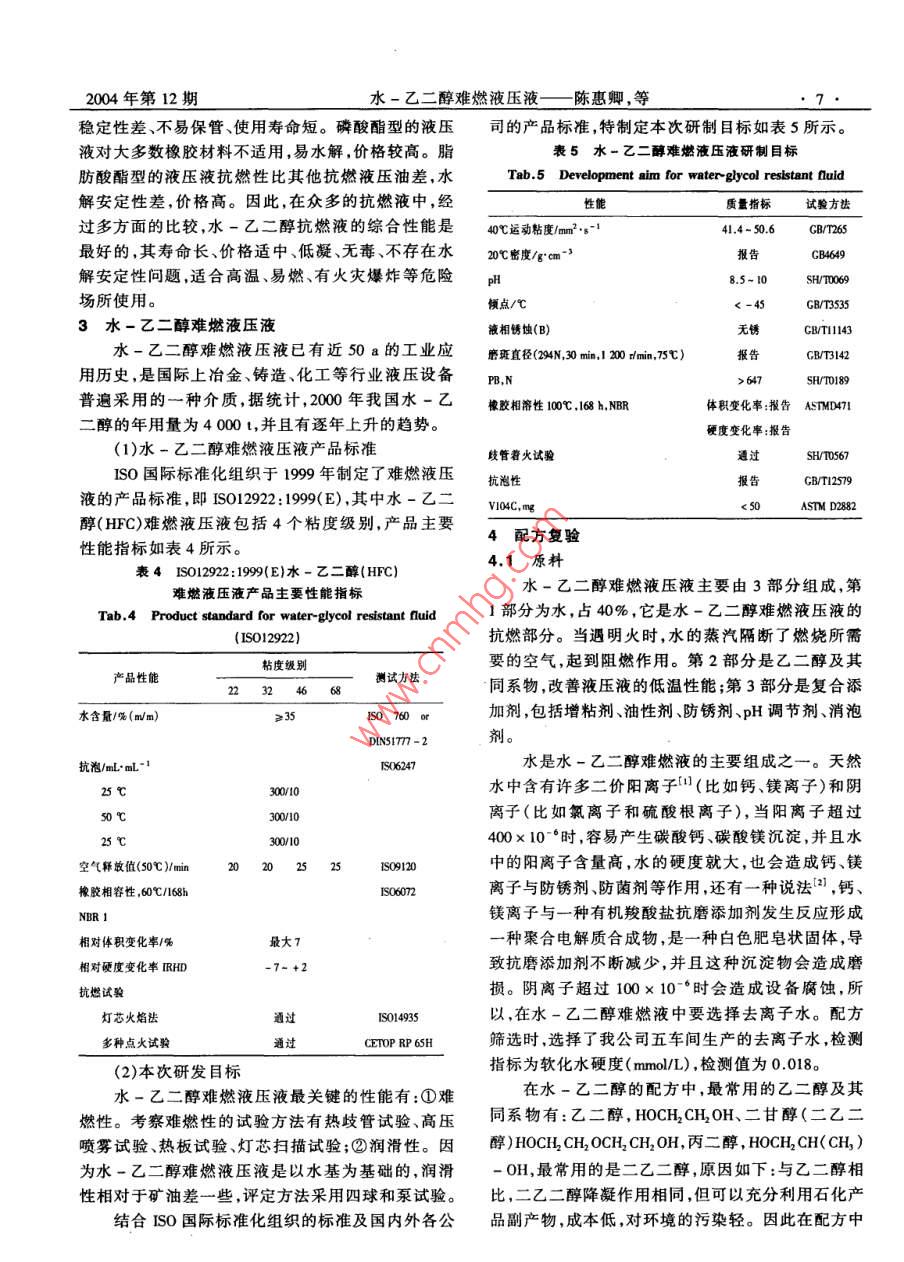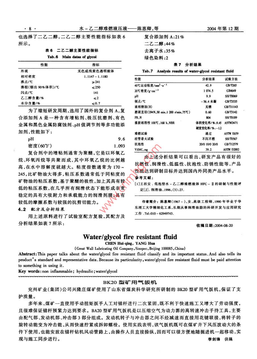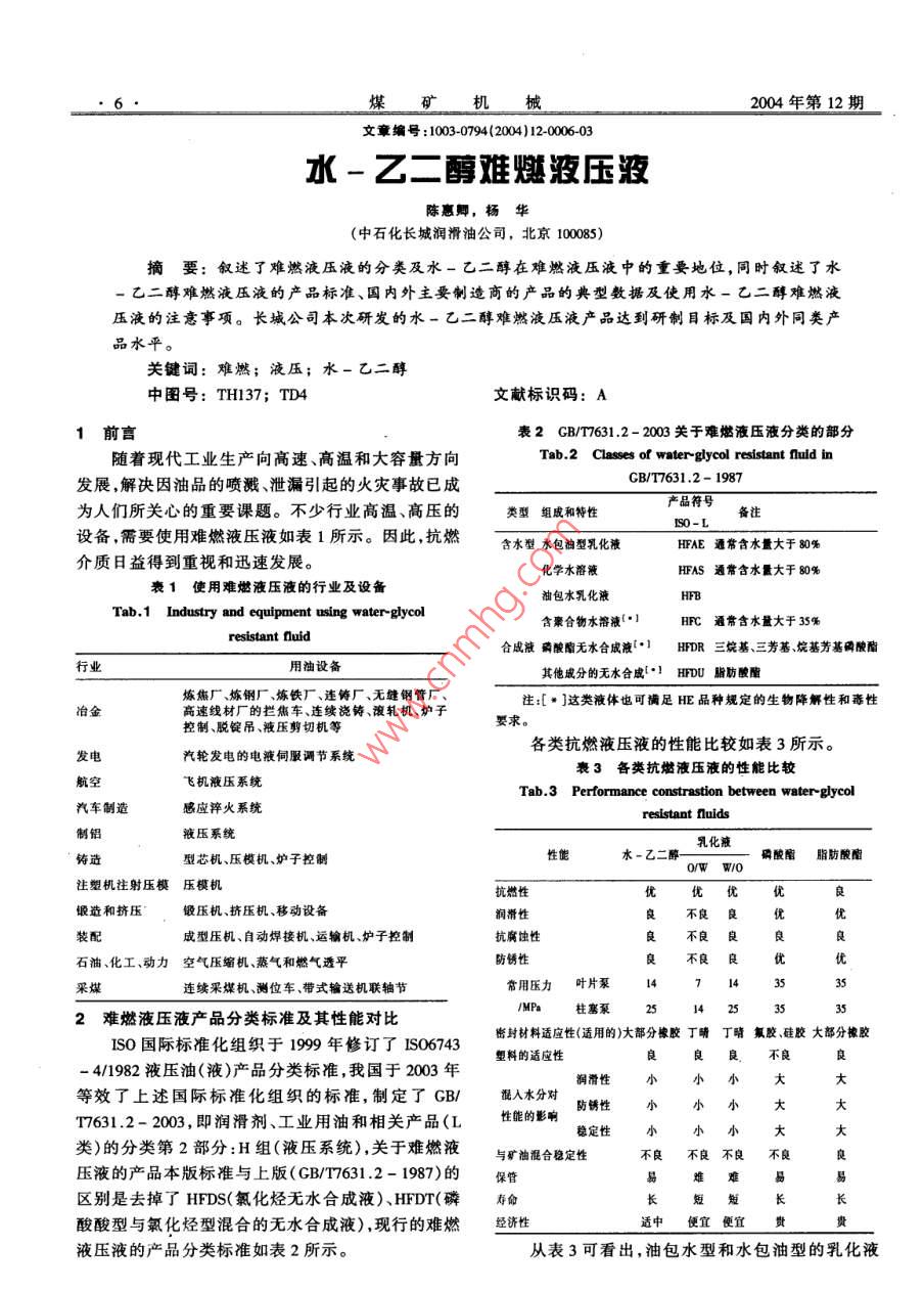 煤礦機(jī)械文章編號:1003-0794(2004)12-000603水-乙二醇避哪液壓陳惠卿,楊華(中石化長城潤滑油公司,北京100085摘要:敘述了難燃液壓液的分類及水一乙二醇在難燃液壓液中的重要地位,同時敘述了水乙二醇難燃液壓液的產(chǎn)品標(biāo)準(zhǔn)、國內(nèi)外主要制造商的產(chǎn)品的典型數(shù)據(jù)及使用水一乙二醇難燃液壓液的注意事項。長堿城公司本次研發(fā)的水一乙二醇難燃液壓液產(chǎn)品達(dá)到研制目標(biāo)及國內(nèi)外同類產(chǎn)品水平。關(guān)鍵詞:難燃;液壓;水-乙二醇中圖號:TH37;TD4文獻(xiàn)標(biāo)識碼:A1前言表2GB/T6312-2003關(guān)于難燃液壓液分類的部分隨著現(xiàn)代工業(yè)生產(chǎn)向高速、高溫和大容量方向Tab 2 Classes of waterglycol resistant nuid in發(fā)展解決因油品的噴濺泄漏引起的火災(zāi)事故已成GB/T76312-1987為人們所關(guān)心的重要課題。不少行業(yè)高溫、高壓的類型組成和特性產(chǎn)品符號備注設(shè)備,需要使用難燃液壓液如表1所示。因此,抗燃含水型水包油型乳化液HFAE通常含水量大于80%介質(zhì)日益得到重視和迅速發(fā)展。化學(xué)水溶液HFAS通常含水量大于80%表1使用難燃液壓液的行業(yè)及設(shè)備油包水乳化液ab1 Industry and equipment using water-glycol含聚合物水溶液{·1HFC通常含水量大于3%resistant nuid合成液磷酸酯無水合成液·1HFDR三烷基、三芳基烷基芳基磷酸酯行業(yè)用油設(shè)備其他成分的無水合成【·1HFDU脂肪酸酯n蘭焦車、連續(xù)澆鑄、滾軋機(jī)、爐子注:[]這類液體也可滿足HE品種規(guī)定的生物降解性和毒性壓剪切機(jī)等求汽輪發(fā)電的電液伺服調(diào)節(jié)系統(tǒng)各類抗燃液壓液的性能比較如表3所示。衰3各類抗燃液壓液的性能比較飛機(jī)液壓系統(tǒng)Tab 3 Performance constraction between waterglycol汽車制造感應(yīng)淬火系統(tǒng)resistant fluids制鋁液壓系統(tǒng)鑄造型芯機(jī)、壓模機(jī)、爐子控制性能水乙二醉磷酸酯脂肪酸酯注塑機(jī)注射壓模壓模機(jī)抗燃性優(yōu)優(yōu)優(yōu)優(yōu)鍛造和擠壓鍛壓機(jī)、擠壓機(jī)、移動設(shè)備潤滑性不良良裝配成型壓機(jī)、自動焊接機(jī)、運輸機(jī)、爐子控制抗腐濁性良石油、化工、動力空氣壓縮機(jī)、蒸氣和燃?xì)馔钙椒冷P性不良良優(yōu)優(yōu)連續(xù)采煤機(jī)、測位車、帶式輸送機(jī)聯(lián)軸節(jié)常用壓力葉片泵147|435352難燃液壓液產(chǎn)品分類標(biāo)準(zhǔn)及其性能對比/MRa柱塞泵密封材料適應(yīng)性(適用的)大部分橡膠丁晴丁晴氟膠、硅膠大部分橡膠0國際標(biāo)準(zhǔn)化組織于1999年修訂了ls06743塑料的適應(yīng)性-4/1982液壓油(液)產(chǎn)品分類標(biāo)準(zhǔn),我國于2003年等效了上述國際標(biāo)準(zhǔn)化組織的標(biāo)準(zhǔn),制定了GBM混八水分潤滑性小小小大性能的影響小小小大大T7631.2-2003,即潤滑劑、工業(yè)用油和相關(guān)產(chǎn)品(L穩(wěn)定性小小小大大類)的分類第2部分:H組(液壓系統(tǒng)),關(guān)于難燃液與礦油混合穩(wěn)定性不良不良不良不良良壓液的產(chǎn)品本版標(biāo)準(zhǔn)與上版(GB76312-1987)的保管區(qū)別是去掉了HFDS(氯化烴無水合成液)、HFDT(磷壽命酸酸型與氯化烴型混合的無水合成液),現(xiàn)行的難燃經(jīng)濟(jì)性適中便宜便宜液壓液的產(chǎn)品分類標(biāo)準(zhǔn)如表2所示從表3可看出,油包水型和水包油型的乳化液2004年第12期水-乙二醇難燃液壓液—陳惠卿,等穩(wěn)定性差、不易保管、使用壽命短。磷酸酯型的液壓司的產(chǎn)品標(biāo)準(zhǔn),特制定本次研制目標(biāo)如表5所示。液對大多數(shù)橡膠材料不適用,易水解,價格較高。脂表5水-乙二醇難燃液壓液研制目標(biāo)肪酸酯型的液壓液抗燃性比其他抗燃液壓油差,水Tab.5 Development aim for waterglycol resistant auld解安定性差,價格高。因此,在眾多的抗燃液中,經(jīng)性能質(zhì)量指標(biāo)試驗方法過多方面的比較,水-乙二醇抗燃液的綜合性能是40運動粘度/m2,41,4-50.6GB最好的其壽命長、價格適中、低凝、無毒、不存在水20℃密度/gm3解安定性問題,適合高溫、易燃、有火災(zāi)爆炸等危險p8.5-10SH/TO069場所使用。傾點/℃<-453水-乙二醇難燃液壓液液相銹蝕(B)GB/TI1143水-乙二醇難燃液壓液已有近50a的工業(yè)應(yīng)感斑直徑(N,3m,120m,萬)報告用歷史,是國際上冶金、鑄造、化工等行業(yè)液壓設(shè)備,N普遍采用的一種介質(zhì),據(jù)統(tǒng)計,2000年我國水一乙橡膠相溶性1℃,1h,NBR體積變化率:報告 ASTMD4二醇的年用量為4000t,并且有逐年上升的趨勢。硬度變化率:報告(1)水-乙二醇難燃液壓液產(chǎn)品標(biāo)準(zhǔn)歧管著火試驗ISO國際標(biāo)準(zhǔn)化組織于1999年制定了難燃液壓抗泡性報告GB/T12579液的產(chǎn)品標(biāo)準(zhǔn)即IO1292:19,其中水-2二wcm醇(HFC)難燃液壓液包括4個粘度級別,產(chǎn)品主要4配方復(fù)驗性能指標(biāo)如表4所示。4.1原料表4IsO12922:1999(E)水-乙二醇(HFC)難燃液壓液產(chǎn)品主要性能指標(biāo)水-乙二醇難燃液壓液主要由3部分組成,第Tab 4 Product standard for water-glycol resistant fluid部分為水,占40%,它是水-乙二醇難燃液壓液的(Iso2922抗燃部分。當(dāng)遇明火時,水的蒸汽隔斷了燃燒所需粘度級別要的空氣,起到阻燃作用。第2部分是乙二醇及其產(chǎn)品性能測試方法2232466同系物,改善液壓液的低溫性能;