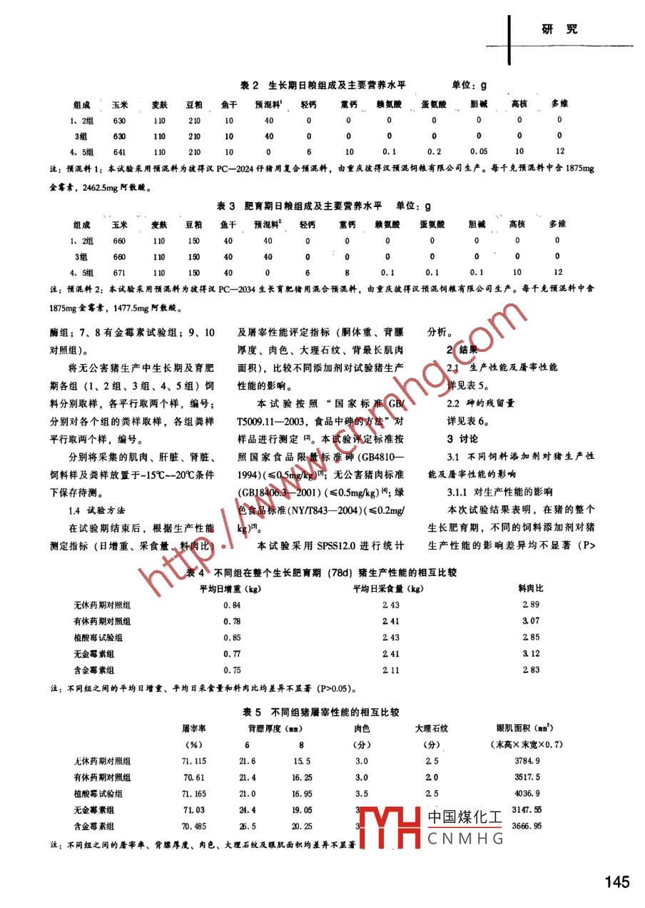 研究三種飼料添加劑對豬肉安全的研究李瑞豐劉力*范賽李躍民(西南大學動物科技學院400716)摘要:本次試驗通過在生長育肥豬飼試驗,對不同組試驗豬間的生長性能、漢預混飼料有限公司生產(chǎn)的彼得漢糧中分別添加金霉素、阿散酸和植酸屠宰性能的比較研究,評價三種添加PC- 2024 仔豬用復合預混料和彼得漢酶添加劑進行飼養(yǎng)試驗,對不同組試劑在養(yǎng)豬生產(chǎn)中的作用及負面效應,PC- -2034 生長育肥豬用混合預混料),驗豬的生長性能、屠宰性能的比較研以指導農(nóng)戶規(guī)模化商品豬養(yǎng)殖,也為和金霉素添加劑(華蒙金河實業(yè)有限究,評價三種添加劑在養(yǎng)豬生產(chǎn)中的無公害豬肉生產(chǎn)提供科學理論依據(jù),公司金河集團有限公司生產(chǎn)的“牧星”作用,尤其對生產(chǎn)出的無公害豬產(chǎn)品尤其對生產(chǎn)出的無公害豬產(chǎn)晶(肌肉、牌飼料金霉素)。試驗飼糧包括生長階(肌肉、肝臟和腎臟)、飼料及豬糞樣肝臟和腎臟)、飼料及豬糞樣進行砷殘段飼糧和肥育階段飼糧。分階段飼養(yǎng)進行了砷殘留檢測,以探討砷對養(yǎng)豬留檢測,探討砷對養(yǎng)豬生產(chǎn)和環(huán)境的(第1階段生長期38d,第2階段肥育生產(chǎn)和環(huán)境安全的負面效應。結(jié)果表負面效應。期40d),飼糧組成及營養(yǎng)水平分別見明: (1) 在豬的整個生長育肥階段,1材料方法表2、表3。不同添加制對豬的生產(chǎn)性能、屠宰性1.1 試驗動物及飼養(yǎng)本次養(yǎng)殖的試驗點的環(huán)境經(jīng)重慶能影響差異不顯著(P>0.05)。 (2)本試驗采用單因子完全隨機化試市質(zhì)檢局檢測,均符合生豬養(yǎng)殖生產(chǎn)在經(jīng)過休藥期后庸宰的商品豬,其肌驗設計,選用30 (+1)日齡、體重28的國家無公害限定標準。在養(yǎng)殖過程肉、肝臟和腎臟中砷殘留量符合我國(+0.1) Kg的三元雜交(杜x長x大)生嚴格按照無公害食品(NY5030-5033-食品中砷限量標準(GB4810- -1994)長豬75頭,按照無公害豬肉生產(chǎn)條件2001):生豬飼養(yǎng)獸藥使用準則、生豬和無公害畜禽肉產(chǎn)品(GB18406.3-飼養(yǎng)于重慶市涪陵區(qū)南沱振祥養(yǎng)豬場。飼養(yǎng)獸醫(yī)防疫準則、生豬飼養(yǎng)飼料使2001)的要求,而在未經(jīng)過休藥期的試驗豬預飼期10d后進人正式試驗,用準則、生豬飼養(yǎng)管理準則的要求進商品豬,其肝臟和腎臟中砷殘留量幾.正式試驗開始時,組間體重差異均不行"。乎全部超標。超過0.5kg。試驗豬按照試驗設計分1.3 樣品分組關鏞詞:飼料添加劑;生產(chǎn)性能;庸組,喂以不同的的試驗日糧。飼喂豬在試驗的各個組中分別隨機選擇2宰性能;殘留只在體重平均達到90Kg左右時宰殺,頭育肥豬,共10頭,按照無公害豬肉對豬組織(背最長肌、腎、肝)中砷屠宰標準,采用頸動靜脈放血方法,飼料添加劑在養(yǎng)豬生產(chǎn)中的使用的含量進行測定;恫喂過程中采集糞在涪陵桂樓屠宰場進行屠宰。再分別現(xiàn)已十分廣泛,同時,其帶來的負面便,對其中砷的殘留量進行測定。將10頭豬的肌肉、肝臟、腎臟分別平效應也受到人們的關注。本次試驗通1.2 試驗飼糧及添加劑行取兩個樣,并從1~10編號(1、 2為過在生長育肥豬飼糧中分別添加金霉飼養(yǎng)過程中采用飼料中添加含有阿散酸無休藥期試驗組; 3、4為阿散素、阿散酸和植酸酶添加劑進行飼養(yǎng)阿散酸和金霉素的預混料(重慶彼得酸有休藥期試驗組; 5、 6阿散酸植酸表1試驗分組組別無休藥期組(1)有休藥期組(2).植酸酶組(3)金霉素組(4)空白組 (5)添加劑阿散酸預混料植酸酶+阿敞酸預混料金霉素預混料休藥期(d)7無頭數(shù)(頭)15基金項目:國家科技部“葉五”科技攻關項目(001A604A05)。中國煤化工作者簡介:李瑞豐(1985- -),女,在讀研究生,研究方向:獸醫(yī)公共衛(wèi)生。MHCNMHG中通訊作者:劃力。144研究表2生長期日糧組成及主要營養(yǎng)水平單位: g組成玉麥麩豆粕魚干預混料'、輕鈣重鈣 賴氨酸蛋氨膽堿高核多維1、2組6301101003組114. 5組 6410. 1注:預混料1:本試驗采用預混料為彼得議PC- 2024 仔豬用復合預混料,由重慶彼得漢預混飼糧有限公司生產(chǎn)。每千克預混料中含1875mg金霧素,2462.5mg阿散酸。表3肥育期日糧組成及主要營養(yǎng)水平單位: g .米魚干預混料° 輕鈣重鈣。賴氨酸蛋氨酸膽臧高核 多維50組660404.5組注:頇混料2:本試驗采用預混料為彼得汊PC- -2034 生長育肥豬用混合預混料,由重慶彼得議預混飼糧有限公司生產(chǎn)。每千克預混料中含1875mg金霉素,177.5mg 阿散酸。酶組; 7. 8有金霉素試驗組; 9.10及屠宰性能評定指標(胴體重、背膘分析。.對照組)。厚度、肉色、大理石紋、背最長肌肉.2結(jié)果將無公害豬生產(chǎn)中生長期及育肥面積),比較不同添加劑對試驗豬生產(chǎn)2.1生產(chǎn)性能及屠宰性能期各組(1. 2組、3組、4、5組)飼性能的影響。詳見表5。料分別取樣,各平行取兩個樣,編號;本試驗按照“國家標準GB/2.2砷的殘留量分別對各個組的糞樣取樣,各組糞樣T5009.11- 2003, 食品中砷的方法"對詳見表6。.平行取兩個樣,編號。樣品進行測定內(nèi)。本試驗評定標準按3討論分別將采集的肌肉、肝臟、腎臟、照國家食品限量標準砷(GB4810-3.1不同飼料添加劑對豬生產(chǎn) 性飼料樣及糞樣放置于-15C~ -20C條件1994)(≤0.5mgkg)凹;無公害豬肉標準能及屠宰性能的影響下保存待測。(GB18406.3- 2001) (≤0.5mg/kg)4;綠3.1
