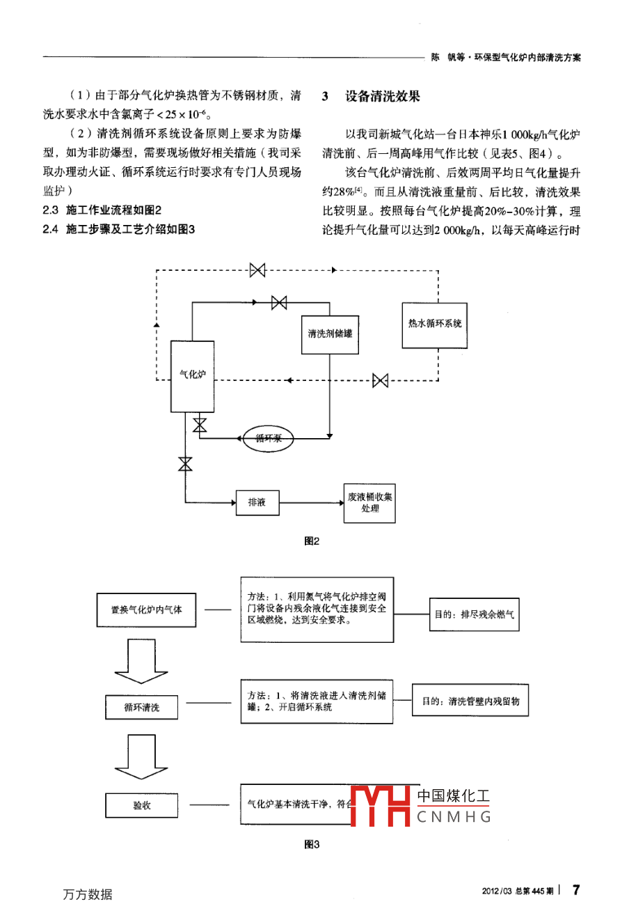 燃?xì)饧夹g(shù)Gas Technologydoi:10.3969/j isn.1671-5152.2012.03.001環(huán)保型氣化爐內(nèi)部清洗方案0溫州市管道燃?xì)庥邢薰? 325000)陳帆郝興軍湯承宗摘要: 闡述了對(duì)水浴式氣化爐內(nèi)部換熱層管壁(液化石油氣層)的清洗新技術(shù),該技術(shù)能有效提高在用氣化爐換熱效率和截面流量,從而達(dá)到最大限度發(fā)揮氣化爐氣化能力的效果。關(guān)鍵詞:液化石油氣氣化爐水基清洗劑環(huán)保換熱率氣化能力溫州市管道燃?xì)庥邢薰咀鳛闇刂莸貐^(qū)最大的管按其化學(xué)組成可分為無(wú)機(jī)化學(xué)清洗劑和有機(jī)化學(xué)清洗道燃?xì)夤?yīng)企業(yè),肩負(fù)著溫州市區(qū)及大學(xué)城等區(qū)域供劑;按其中有的清洗劑可能對(duì)不同的污垢有不同的作氣任務(wù),公司目前擁有約12萬(wàn)戶居民用戶,近300戶用, 或?qū)ν?一種污垢具有兩種或兩種以上的作用,則工商業(yè)用戶,氣源為液化石油氣,2011年日最大供氣應(yīng)按其在一-般情況下的主要作用歸類。量已經(jīng)達(dá)到65t。設(shè)備材質(zhì)有碳鋼、奧氏體不銹鋼、銅系金屬、由于液化石油氣通過(guò)水浴式氣化器長(zhǎng)期加熱(溫鋁、鈦等。常用的清洗液有硫酸、鹽酸(或鹽酸與氫度保持65C-70C) ,其中烷烴和烯烴通過(guò)物理和化氟酸)、硝酸(或硝酸與氫氟酸)、氨基磺酸、檸檬學(xué)反應(yīng)形成焦油,焦油層影響氣化器換熱率和流量,酸或氨化檸檬酸等。他們的適應(yīng)性見表3。降低了氣化器氣化能力,影響設(shè)備安全運(yùn)行。1.2水基清洗劑性質(zhì)介紹為了保證公司對(duì)經(jīng)營(yíng)區(qū)域內(nèi)用戶安全、穩(wěn)定供人們把破壞大氣臭氧層的物質(zhì)稱為“消耗臭氧層氣,由公司安全技術(shù)處組織相關(guān)部門對(duì)市區(qū)3座氣化物質(zhì)”,因其英文名稱為Ozone Depleing Substances,站所轄10臺(tái)氣化爐經(jīng)行內(nèi)部換熱層管壁(液化石油氣取其英文名稱字頭組成縮寫,簡(jiǎn)稱0DS。-般液化石層)清洗叫H2。油氣氣化爐清洗劑包括三氯乙烷,三氟三氯乙烷、四氯化碳等。水基清洗劑主要成分為表面活性劑,無(wú)機(jī)1清洗劑選用助洗劑以及少量的溶劑與水。該綠色非ODS清洗劑以其具有傳統(tǒng)清洗技術(shù)所親油(疏水)的碳?xì)滏溁鶊F(tuán)和1.1清洗劑分類極性的親水(疏油)基團(tuán)所組成,可大大降低溶劑常用的化學(xué)清洗藥劑可有不同的分類方法。例如的表面張力和液液界面間的張力,改變體系的界面表1場(chǎng)站氣化爐配置情況表序號(hào)場(chǎng)站名品牌及安裝時(shí)間單臺(tái)設(shè)備氣化量(設(shè)計(jì)量)數(shù)量氣化總量1南浦站日本神樂(1997年)4th中國(guó)煤化工新城站日本神樂( 200 )2vh3雪山站天津奧利達(dá)( 2003年)YHCNMHG5th總氣化能力11Vh4萬(wàn)務(wù)數(shù)據(jù)刊陳帆等.環(huán)保型氣化爐內(nèi)部清洗方案表2化學(xué)清洗的分類無(wú)機(jī)酸HCL、HNO3、HSO4、HF. HPO4、 氨基磺酸酸性清洗劑有機(jī)酸檸檬酸、草酸.酒石酸、甲酸、羥基乙酸清堿性清洗劑NaOH、Na:C0. Na;PO4、 水玻璃、NaxHPO,. NaPO。洗水基清洗液以表面活性劑為主,加入助劑和無(wú)機(jī)堿齊分絡(luò)合物清洗劑EDTA. PMA. PAA. HEDA類黏泥菌藻清洗劑聚丙烯酸鈉、聚馬來(lái)酸鈉、過(guò)氧化氫、潔爾滅有機(jī)溶劑清洗劑含氯有機(jī)阻燃清洗劑、四氯化碳、F-113: 三氟三氯乙烷氧化還原劑KMnO,、H2O2. 過(guò)硫酸鉀、肼、二硫化鈉(改變氧化還原態(tài),改變結(jié)晶結(jié)構(gòu),使不溶性垢可溶)表3化學(xué)清洗液對(duì)材質(zhì)的適應(yīng)性酸洗液序號(hào)材質(zhì)中性洗液堿性洗液鹽酸硝酸HNO3- HF氨基磺酸檸檬酸碳鋼C02銅系金屬Op奧氏體不銹鋼x混凝土鋁注: O表示好△表示可用x 表示不可用表4常用氣化設(shè)備清洗劑清洗劑名稱效果優(yōu)點(diǎn)缺點(diǎn)1洗潔精基本無(wú)效果金屬清洗劑效果一般金屬表面清洗效果較好但不適合較厚焦油清洗但由 于四氯化碳本身劇毒性,特別是加熱后揮發(fā)四氣化碳效果較好清洗效果較好, 氣化器廠家基本出來(lái)氣體也對(duì)人體有害, 高濃度該物質(zhì)量蒸氣對(duì)粘膜有輕度刺激作用,對(duì)中樞神經(jīng)系統(tǒng)有麻醉作推薦該方法清洗用,對(duì)肝、腎有嚴(yán)重?fù)p害,不利于操作人員安全操作,且廢液處理相當(dāng)困難。狀態(tài),通過(guò)吸附、潤(rùn)濕、滲透、乳化、分散、起泡、人類生存的地球,促進(jìn)我國(guó)履約目標(biāo)的實(shí)現(xiàn),促進(jìn)我增溶等性能,以及其相互作用而達(dá)到清洗目的。助洗國(guó)對(duì)外經(jīng)濟(jì)的發(fā)展劑可以與表面活性劑發(fā)生-系列協(xié)同作用,如發(fā)揮活目前,工業(yè)生產(chǎn)中仍大量使用堿性清洗劑、有性膠體吸附作用,提高表面活性劑的活性作用等。添機(jī)溶劑 (石油溶劑、鹵代烴類溶劑等)進(jìn)行清洗,其加劑可以起到增溶、抗再沉積、消泡等目的,從而提清洗能力較差,清洗后部件易生銹,通常用于清洗黑高清洗效果。通過(guò)對(duì)各組分的優(yōu)化復(fù)配,確定環(huán)保型色金屬表面的輕度油污和無(wú)機(jī)鹽等污垢。溶劑清洗水基金屬清洗劑以有機(jī)物助洗劑(HX- ZOD、 硼酸劑雖然有很強(qiáng)的清洗能力,很容易清洗金屬表面的污鈉)和復(fù)合表面活性劑(HX-T-1 )作為基本堿性組大量能源,造成環(huán)