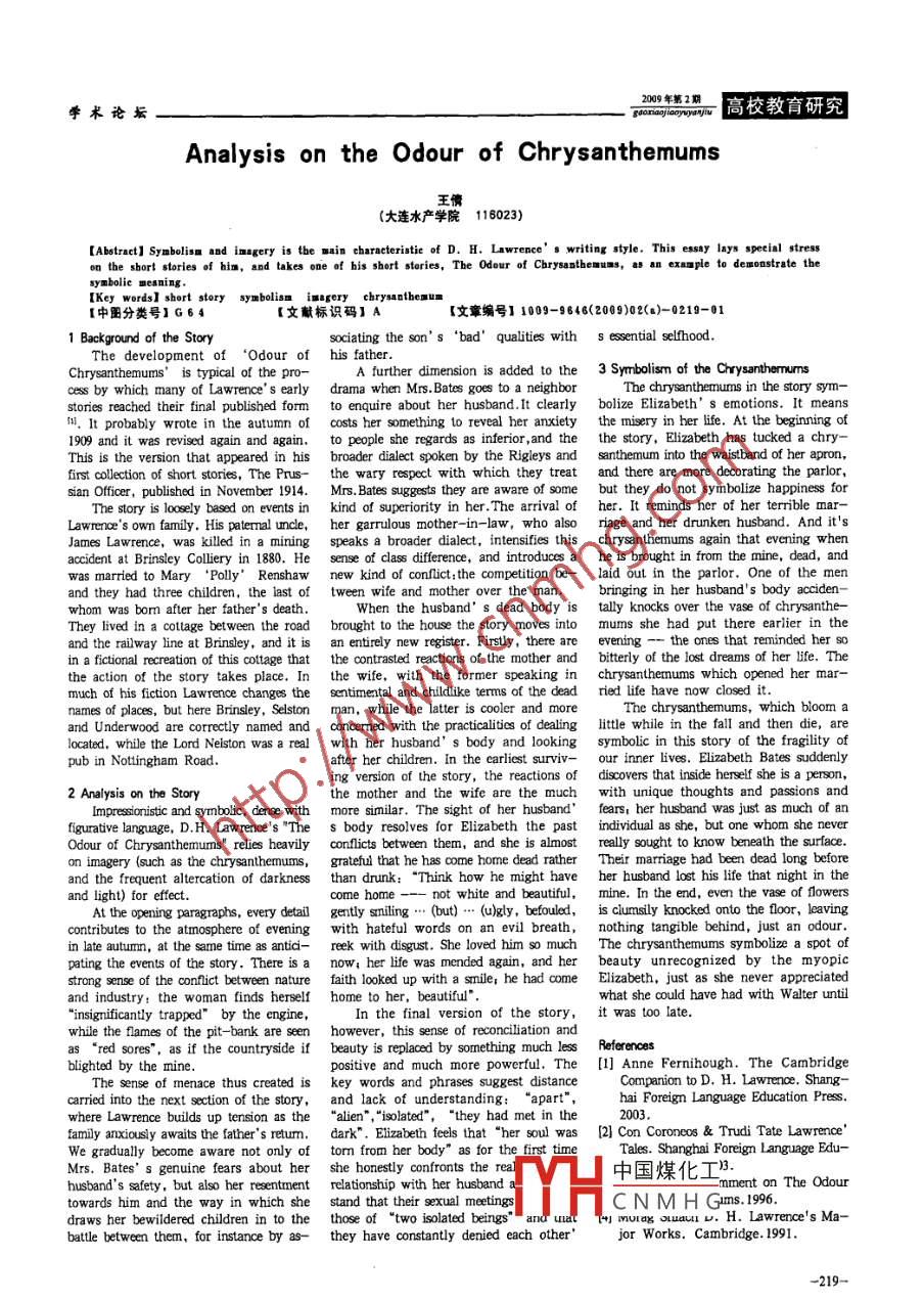 2009年第2期高校教育研究學(xué)術(shù)論壇goaoriajojjAnalysis on the Odour of Chrysanthemums(大連水產(chǎn)學(xué)院116023)[Abstract] Symbolism ond inagery is the main characteristie of D. H. Lawrence' . writing style. This essay lays special stresson the sbort stories of him, and takes one of his short stories, The Odour of Chrysanthenuas, a a exaple to demonstrate thesymbolie meaning .[Key words] short story symbolismchryaothemum[中圖分類號(hào)] G64 [文 獻(xiàn)標(biāo)識(shí)碼] A(文章編號(hào)] 1009-9646(2009)02(a)-0219-011 Background of the Storysociating the son's 'bad' qualitis with s esential selfhood.The development of 'Odour of his father.Chrysanthemums’is typical of the pro-A further dimension is added to the3 Symbolism of the Chrysanthermumnscess by which many of Lawrence' s earlydrama when Mrs.Bates goes to a neighborThe chrysanthemums in the story sym-stories reached their final published formto enquire about her husband.It clearlybolize Elizabeth' s emotions. It means川. It probably wrote in the autumn of costs her something 1to reveal her anxietythe misery in bher life. At the beginning of1909 and it was revised again and again.to people she regards as inferior,and the the story, Elizabeth has tucked a chry-This is the version that appeared in his broader dialet spoken by the Rigleys and santhemum into the waisband of her apron, .first cllection of short stories, The Prus-the wary respect with which they treat and there are more decorating the parlor,sian Officer, published in November 1914.Mrs. Bates suggests they are aware of somebut they do not symbolize happiness forThe story is losely based on events inkind of superiority in her.The arrival ofner. It reminds her of her terrible mar-Lawrence's owm family. His patermal uncle,hergarrulous notner-tn-- in-law, who alsoriage and her drunken husband. And it'sJames Lawrence, was killed in a miningspeaks a broader dialect, intensifies thischrysanthemums again that evening whenacident at Brinsley Colliery in 1880. He sense of class diference, and introduces a he is brought in from the mine, dead, andwas married to Mary Poll' Renshaw new kind of confict:the compettin be- laid out in the parlor. One of the menand they had three children, the last oftween wife and mother over the man.bringing in her husband's body acciden-whom was bom after her father' s death.When the husband' s dead body istally knocks over the vase of chrysanthe-They lived in a cottage between the roadbrought to the house the story moves intomums she had put there earlier in theand the railway line at Brinsley, and it isan entirely new register. Firstly, there areevening -- the ones that reminded her s0in a fictional rereation of this cottage thatthe contrasted reactions of the mother andbitterly of the lost dreams of her life. Thethe action of the story takes place. Inthe wife, with the former speaking inchrysanthemums which opened her mar-much of his fiction Lawence changes the sentimental and chilike terms of the deadnames of places, but here Brinsley, Selstonman, while the latter is cooler and moreThe chrysanthemums, which bloom aand Underwood are crret named and concerned with the paticaltis of dealing Httet while in the fall and then die, arelocated, while the Lord Nelston wasareal with her husband' s body and loking symblic in this story of the fragility ofpub in Notingham Road.after her children. In the earliest surviv-our inner lives. Elizabeth Bates suddenlying version of the story, the reactions ofdiscovers that inside herself she is a person,2 Analysis on the Storythe mother and the wife are the muchwith unique thoughts and passions andImpesionistic and symbolic, dense withmore similar.The sight of her husband'fears; her husband was just as much of anfigurative language, D.H. Lawrence's "The s body resolves for Elizabeth the pastindividual as she, but one whom she neverOdour of Chrysanthemums" relies heavily conflicts between them, and she is almost really sought to know beneath the surface.on imagery (such as the chrysanthemums, grateful that he has come home dead rather Their marriage had been dead long beforeand the frequent altercation of darkness than drunk: "Think how he might have her husband lost his life that night in theand light) for effect.come home - - - not white and beautiful,mine. In the end, even the vase of lowersAt the opening paragraphs, every detailgently smiling ... (but) .. (u)gly, befouled,is clumsily knocked onto the floor, lcavingcontributes to the atmosphere of eveningwith hateful words on an evil breath,nothing tangible behind, just an odour.in late autumn, at the same time as antid-reek with disgust. She loved him so muchThe chrysanthemums symbolize a spot ofpating the events of the story. There isa now; her lifte was mended again, and herbeauty unrecognized by the myopicstrong sense of the confict between nature faith looked up with a smile he had come Elizabeth, just as she never appreciatedand industry: the woman finds herselfhome to her, beautiful" .what she could have had with Walter until"insignificantly trapped" by the engine,In the final version of the story,it was too late.while the flames of the pit-bank are seenhowever, this sense of reconciliation andas."red sores", as if the countryside ifbeauty is replaced by something much lessReferencesblighted by the mine.positive and much more powerful. The[1] Anne Fernihough. The CambridgeThe sense of menace thus created is key words and phrases suggest distanceCompanion to D. H. Lawrence. Shang -carried into the next section of the story,and lack of understanding:‘ apart" ,hai Foreign Language Education Press.where Lawrence builds up tension as the "alien" ,islaed”,"they had met in the2003.family anxiously awaits the father 's retum.dark". Elizabeth feles that "her soul was [2] Con Coroneos & Trudi Tate Lawrence'We gradully become aware not only oftom from her body" as for the first timeTales. Shanghai Foreign Language