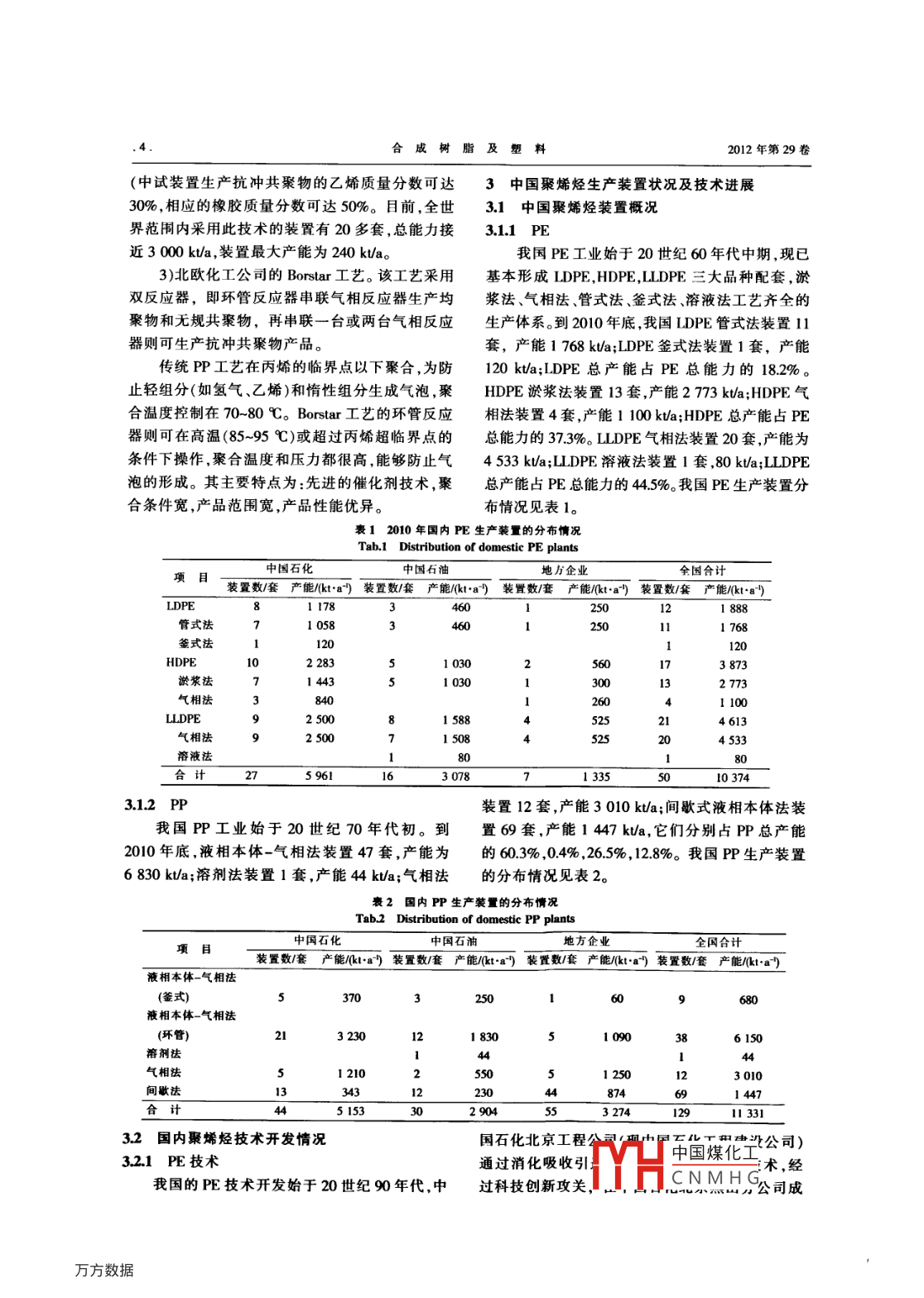 合成樹脂及塑料,2012, 29(1):1專論CHINA SYNTHETIC RESIN AND PLASTICS我國聚烯烴生產(chǎn)工藝現(xiàn)狀及發(fā)展高春雨(中國石油化I.集團公司經(jīng)濟技術(shù)研究院,100292)摘要:介紹了目前聚烯烴工藝技術(shù),分析了我國聚烯烴工藝技術(shù)的狀況。低密度聚乙烯生產(chǎn)工藝主要為管式法和釜式法,新建裴置基本采用管式法工藝;高密度聚乙烯(HDPE)或線型低密度聚乙烯(LDPE)生產(chǎn)工藝主要為氣相法、淤漿法和溶液法,但氣相法更適合生產(chǎn)LLDPE,淤漿法更適合生產(chǎn)HDPE;最廣泛和最有發(fā)展前途的聚丙烯生產(chǎn)工藝是本體法和氣相法。從來來的情況看,我國的聚烯烴生產(chǎn)工藝仍主要依賴國外技術(shù)。關(guān)鍵詞:聚烯烴聚乙烯聚丙烯工藝技術(shù) .中圈分類號: TQ 325.1文獻標識碼: A文章編號: 1002-1396(2012)01-0001-052010年,世界聚乙烯(PE)產(chǎn)能達89000kU/a,質(zhì)量分數(shù)高達20%的乙烯-丙烯酸乙酯共聚物。聚丙烯(PP)產(chǎn)能達59320k/a。同期中國聚烯烴目前,全世界采用該技術(shù)的裝置能力約4800kUa,工業(yè)也得到了長足進步。2010 年,國內(nèi)PE和PP單線能力高達320 kUa。產(chǎn)能分別為10 370,11 330 kt/a,分別占世界總產(chǎn)2)荷蘭DSM公司高壓管式法工藝。該技術(shù)的能的1.7%,.19.1%。未來幾年仍將是中國聚烯烴主 要特點是使用混合的過氧化物引發(fā)劑,可得到擴能的高峰期,因此,分析和總結(jié)世界聚烯烴生產(chǎn)較高的單程轉(zhuǎn)化率、較低的峰溫,反應管不易結(jié)工藝,對未來新建裝置的技術(shù)選擇有一定幫助。焦,產(chǎn)品具有更好的光學性質(zhì)。所產(chǎn)LDPE的MFR為0.30-65.00 g/10 min,密度為0.918~0.930 g/cm',1PE生產(chǎn)技術(shù)進展適于生產(chǎn)w(VA)為10% 的EVA。目前,全球采用PE主要分為低密度聚乙烯(LDPE).高密度該技術(shù)的裝置產(chǎn)能約1 000 kua,裝置最大產(chǎn)能為聚乙烯(HDPE)和線型低密度聚乙烯(LLDPE)。250k/a,最大單線設(shè)計能力可達400kt/ao產(chǎn)技術(shù)可分為:一是在高壓下,通過自引發(fā)或過氧3)美國??松梨诠竟苁椒üに嚒T摷夹g(shù)化物引發(fā)聚合,用于生產(chǎn)LDPE,因此也被稱為高的特點是反應器采用多側(cè)線進料口,兩個單體側(cè)壓PE;二是在相對較低的壓力下,采用Ziegler-線進料口、四個或更多的引發(fā)劑進料口,單程轉(zhuǎn)化Natta(z- -N)催化劑或單活性中心催化劑,通過控率可達34%~36%;可生產(chǎn)w(VA)達28%或更高制工藝條件可生產(chǎn)出密度為0.880~0.960g/cm'的的EVA產(chǎn)品;用35C的冷水夾套冷卻反應器并各類PE,有時也稱為低壓PE或線型PE。在排出閥后用乙烯激冷,可以不用產(chǎn)品冷卻器。該1.1 LDPE生產(chǎn)技術(shù)工藝產(chǎn)品密度為0.918-0.935 g/cm3 ,MFR為0.30~生產(chǎn)LDPE主要有高壓釜式法和管式法。目46.00 g/10 min。近年來,多套200 k/a以上規(guī)模的前,全球LDPE產(chǎn)能21 470kt,其中,管式法約占裝置在沙特、馬來西亞、中國等國建成。2010 年,65.3%,釜式法約占34.7%。從未來發(fā)展看,新建裝置沙特SABIC公司采用該技術(shù)在英國建成的400基本上為管式法,只有建設(shè)以生產(chǎn)乙烯-乙酸乙烯kta裝置,成為該技術(shù)的最大單線裝置。目前,全(EVA)為主的LDPE裝置時,才考慮釜式法裝置。1.1.1管式法技術(shù) .收稿日期: 2011-11-25;1)瑞士Basell公司Lupotech 高壓管式法工藝。修回日期: 2011-12-13。作者簡介:高春雨,1965 年生,高級專家,Lupotech 工藝可在較高轉(zhuǎn)化率下直接從反應器生1987年畢業(yè)于清華大學高分子化工專產(chǎn)熔體流動速率(MFR)為0.20~50.00 g/10 min,業(yè),現(xiàn)在主要從享中國煤化工密度為0.915-0.932 g/cm3的LDPE;還可生產(chǎn)乙酸作。聯(lián)系電話:乙烯(VA)質(zhì)量分數(shù)高達30%的EVA、丙烯酸酯gaocy .edri@sinopecYHCNMH G合成樹脂及塑料2012年第29卷世界采用該技術(shù)的裝置產(chǎn)能約1400kVa。Inovene技術(shù)的催化劑對溫度的反應相對溫和,因1.1.2釜 式法技術(shù)而操作中流化床的熱點和結(jié)塊現(xiàn)象比較少。目前,1)意大利埃尼化學公司釜式法工藝。該工藝全球范圍已建成40多套Inovene裝置,產(chǎn)能超過與英國ICI公司相似,反應器為有內(nèi)部攪拌器的8 000 kVa,最大單線能力達450 -500 kUa。多區(qū)反應器,轉(zhuǎn)化率因牌號而不同,一般為16%~3)Basell公司的氣相法Spherline工藝。20%。埃尼化學公司對釜式法技術(shù)的主要改進體Spherilene 工藝采用鈦系Z-N催化劑,可以生產(chǎn)現(xiàn)為裝置的大型化(理論上最大反應器可達3 m)ULDPE,LLDPE,中密度PE(MDPE),HDPE等。產(chǎn)和將產(chǎn)品范圍擴大到LLDPE、超低密度PE品密度從小于0.900 kg/cm2(ULDPE)到大于0.960(ULDPE)和EVA的能力。目前,全世界采用該技kg/cm3(HDPE) ,MFR為0.01~100.00 g/10 min。由術(shù)的裝置能力約500kUa,最大單線能力200kUa。于采用兩臺氣相反應器,故可生產(chǎn)相對分子質(zhì)量2)??松梨诠靖椒üに?。該工藝的反分布曲線呈雙峰(簡稱雙峰)的PE和特種聚合物。應器是??松梨诠咀孕性O(shè)計的1.5m3釜式反已有10套裝置采用該工藝,產(chǎn)能已達3 000 kVa,應器,并替代了用氧氣作引發(fā)劑的管式法反應器;單線產(chǎn)能最高可達400 k/a。目前,中國沒有這類反應器具有較高的長徑比,有利于生產(chǎn)質(zhì)量類似技術(shù)的生產(chǎn)裝置。管式法工藝的薄膜產(chǎn)品;壓力范圍很寬,可生產(chǎn)低1.2.2淤漿法 技術(shù)MFR的均聚物和高VA含量的共聚物