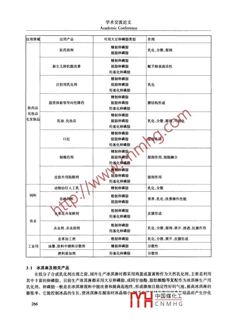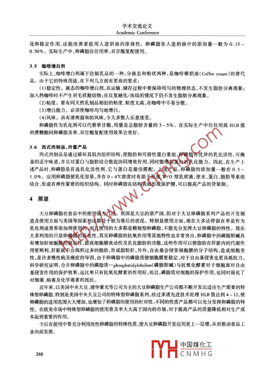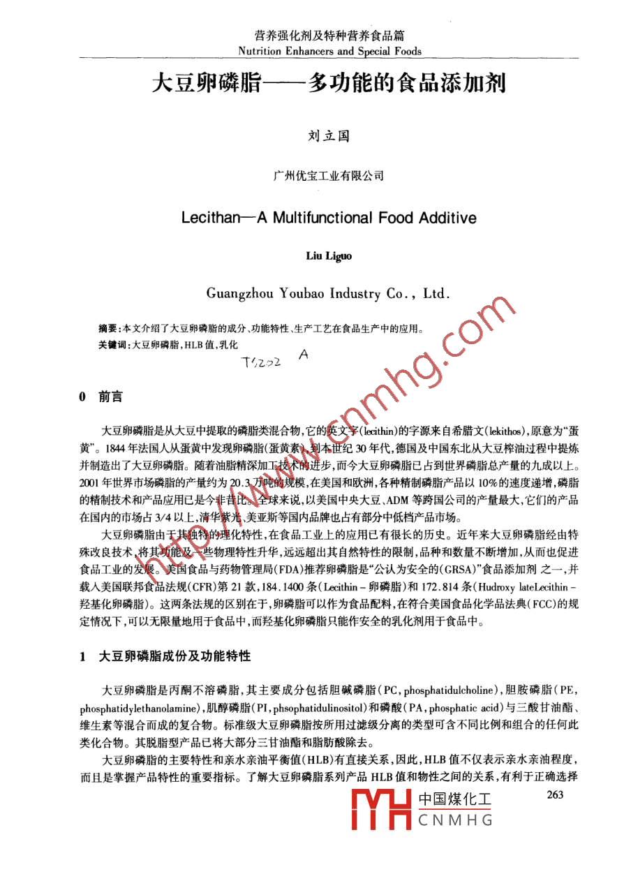 營養(yǎng)強(qiáng)化劑及特種營養(yǎng)食品篇Nutrition Enhancers and Special Foods大豆卵磷脂-多功能的食品添加劑劉立國廣州優(yōu)寶工業(yè)有限公司Lecithan- A Multifunctional Food AdditiveLiu Liguo .Guangzhou Y oubao Industry Co.,Ltd. .摘要:本文介紹了大豆卵磷脂的成分、功能特性、生產(chǎn)工藝在食品生產(chǎn)中的應(yīng)用。關(guān)鍵詞:大豆卵磷脂, HLB值,乳化T億2A0前言大豆卵磷脂是從大豆中提取的磷脂類混合物,它的英文字(lecithin)的字源來自希臘文(lekithos),原意為“蛋黃"。1844 年法國人從蛋黃中發(fā)現(xiàn)卵磷脂(蛋黃素),到本世紀(jì)30年代,德國及中國東北從大豆榨油過程中提煉并制造出了大豆卵磷脂。隨著油脂精深加工技術(shù)的進(jìn)步,而今大豆卵磷脂已占到世界磷脂總產(chǎn)量的九成以上。2001年世界市場磷脂的產(chǎn)量約為20.3萬噸的規(guī)模,在美國和歐洲,各種精制磷脂產(chǎn)品以10%的速度遞增,磷脂的精制技術(shù)和產(chǎn)品應(yīng)用已是今非昔比。全球來說,以美國中央大豆ADM等跨國公司的產(chǎn)量最大,它們的產(chǎn)品在國內(nèi)的市場占3/4以上,清華紫光美亞斯等國內(nèi)品牌也占有部分中低檔產(chǎn)品市場。大豆卵磷脂由于其獨特的理化特性,在食品工業(yè)上的應(yīng)用已有很長的歷史。近年來大豆卵磷脂經(jīng)由特殊改良技術(shù),將其功能及--些物理特性升華,遠(yuǎn)遠(yuǎn)超出其自然特性的限制,品種和數(shù)量不斷增加,從而也促進(jìn)食品工業(yè)的發(fā)展。美國食品與藥物管理局(FDA)推薦卵磷脂是“公認(rèn)為安全的(GRSA)”食品添加劑之一,并.載人美國聯(lián)邦食品法規(guī)(CFR)第21款, 184. 1400條( Lecithin -卵磷脂)和172. 814條( Hudroxy lateLecihin -羥基化卵磷脂)。這兩條法規(guī)的區(qū)別在于,卵磷脂可以作為食品配料,在符合美國食品化學(xué)品法典FCC)的規(guī)定情況下,可以無限量地用于食品中,而羥基化卵磷脂只能作安全的乳化劑用于食品中。1大豆卵磷脂成份及功能特性大豆卵磷脂是丙酮不溶磷脂,其主要成分包括膽堿磷脂( PC, phosphatidulcholine),膽胺磷脂( PE,phosphatidylethanolamine) ,肌醇磷脂( PI,phsophatidulinositol)和磷酸( PA, phosphatic acid)與三酸甘油酯、維生素等混合而成的復(fù)合物。標(biāo)準(zhǔn)級大豆卵磷脂按所用過濾級分離的類型可含不同比例和組合的任何此類化合物。其脫脂型產(chǎn)品已將大部分三甘油酯和脂肪酸除去。大豆卵磷脂的主要特性和親水親油平衡值( HLB)有直接關(guān)系,因此, HLB值不僅表示親水親油程度,而且是掌握產(chǎn)品特性的重要指標(biāo)。了解大豆卵磷脂系列產(chǎn)品HLB值和物性之間的關(guān)系,有利于正確選擇中國煤化工263MHCNMHG學(xué)術(shù)交流論文Academic Conference應(yīng)用各種大豆卵磷脂系列產(chǎn)品。HLB值不同,卵磷脂的表面活化性作用亦不同。一般HLB值在1-4之間的乳化劑具有消泡作用;油溶性乳化劑HLB值在3.5- 6之間;水溶性乳化劑HLB值為8- 18;HLB值7- 9的乳化劑具有濕潤作.用,13- 15之間的有清洗作用,而15- 18之間的有助溶作用。經(jīng)過羥化或脫油工藝生產(chǎn)的大豆卵磷脂與普通標(biāo)準(zhǔn)型的大豆卵磷脂的最大區(qū)別在于在水中的溶解分散程度較高,從而大大提高了大豆卵磷脂的商業(yè)價值。將羥化大豆卵磷脂放在水中,下沉很快,落在水底中,并能逐漸往上返同時漸漸溶解,其溶解度不高,但水化力較強(qiáng)。這是大豆卵磷脂的一-個重要特性,在使用中常常會利用這一-特性。大豆卵磷脂系列產(chǎn)品其外觀是淺黃至棕色透明或半透明的粘稠狀液態(tài)物質(zhì),或白色至淺棕色粉末或顆粒。主要性狀是流動性好,無臭或略帶堅果類氣味及滋味。脫脂卵磷脂溶于脂肪酸;有適當(dāng)?shù)恼承?部分溶于水,但易成水合物形成乳濁液,有很好的乳化作用,HLB值3~14;有促進(jìn)產(chǎn)品成型的作用;成膜性能好,能改善產(chǎn)品外觀。卵磷脂同時也是一一種多功能的保健品,可提供具有完全生物活性的膽堿,還可將膽堿有控制地釋放進(jìn)人體,使血液膽堿水平保持長期穩(wěn)定,這有助于人類在耐力運動中保持體力;保護(hù)肝功能;有利于胎、嬰兒神經(jīng)的發(fā)育;可消除青春痘、雀斑并滋潤皮膚;可預(yù)防老年癡呆的發(fā)生;能有效地化解膽結(jié)石是良好的心理調(diào)和劑。2大豆卵磷脂的制取大豆卵磷脂系列產(chǎn)品均以大豆為原料,經(jīng)多道工序制作而成。大豆中含有蛋白質(zhì)、可溶性碳水化合物、不溶性碳水化合物、油脂、水分灰分等物質(zhì),其中卵磷脂的含量約0.5%。其生產(chǎn)工藝見圖1,首先是對豆子進(jìn)行嚴(yán)格的篩選,清洗除去大豆中的雜質(zhì),經(jīng)過均濕處理、壓碎研磨成豆粕;接著用已烷將油萃取出來,制成粗油,再加上少許水分溶解粗油中的磷脂。此時產(chǎn)品為干燥狀態(tài),然后加入大豆油及脂肪酸使其溶解,這就是標(biāo)準(zhǔn)型的卵磷脂,可經(jīng)純化或脫脂制成精制卵磷脂系列產(chǎn)品。大豆↓清洗,壓碎,去皮均濕(軟化處理),壓成薄片全脂豆粕萃取油脂脫脂豆粕大豆飼料可食性大豆蛋白純化大豆油卵磷脂標(biāo)準(zhǔn)型卵磷脂純化加值卵磷脂圖1大豆卵磷脂生產(chǎn)工藝流程目前,大豆磷脂產(chǎn)品主要可分為粗制磷脂、精制磷脂、酶中國煤化工哩磷脂幾大類別264*MHCNMHG營養(yǎng)強(qiáng)化劑及