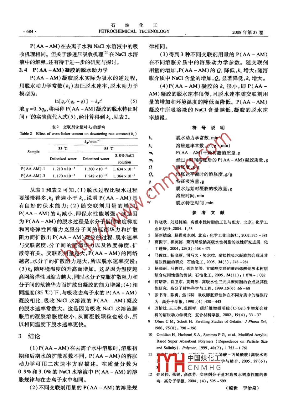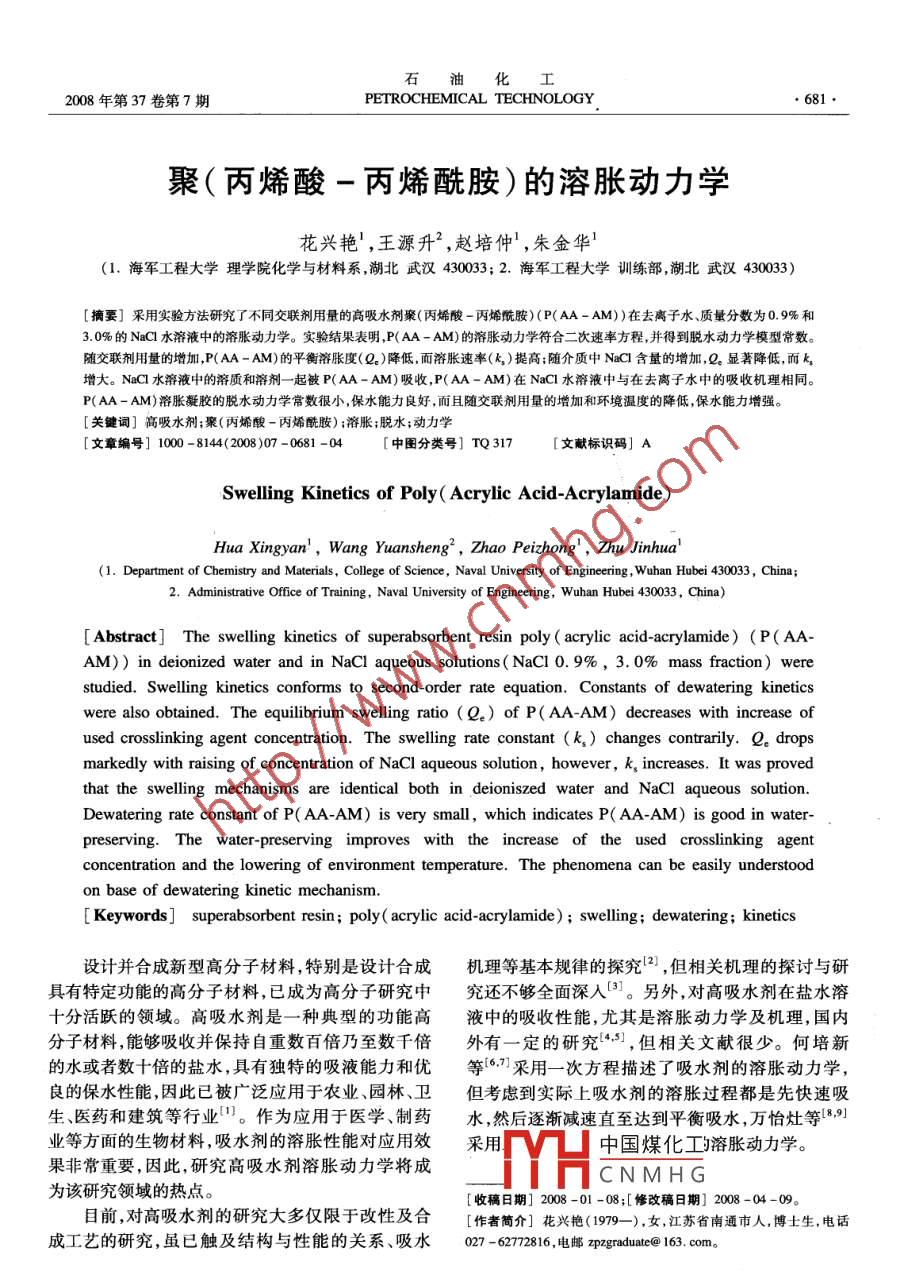 石油化工2008年第37卷第7期PETROCHEMICAL TECHNOLOGY聚(丙烯酸一丙烯酰胺)的溶脹動(dòng)力學(xué)花興艷!,王源升2,趙培仲,朱金華(1.海軍工程大學(xué)理學(xué)院化學(xué)與材料系,湖北武漢430033;2.海軍工程大學(xué)訓(xùn)練部,湖北武漢430033)[摘要]采用實(shí)驗(yàn)方法研究了不同交聯(lián)劑用量的高吸水劑聚(丙烯酸-丙烯酰胺)(P(AA-AM))在去離子水、質(zhì)量分?jǐn)?shù)為0.9%和30%的NaC1水溶液中的溶脹動(dòng)力學(xué)。實(shí)驗(yàn)結(jié)果表明,P(AA-AM)的溶脹動(dòng)力學(xué)符合二次速率方程,并得到脫水動(dòng)力學(xué)模型常數(shù)。隨交聯(lián)劑用量的增加,P(AA-AM)的平衡溶脹度(Q)降低而溶脹速率(k)提高;隨介質(zhì)中NaC1含量的增加,Q。顯著降低,而k增大。NaC1水溶液中的溶質(zhì)和溶劑一起被P(AA-AM)吸收,P(AA-AM)在NaCl水溶液中與在去離子水中的吸收機(jī)理相同。P(AA-AM)溶脹凝膠的脫水動(dòng)力學(xué)常數(shù)很小,保水能力良好,而且隨交聯(lián)劑用量的增加和環(huán)境溫度的降低,保水能力增強(qiáng)關(guān)鍵詞]高吸水劑;聚(丙烯酸-丙烯酰胺);溶脹;脫水;動(dòng)力學(xué)文章編號(hào)]1000-8144(2008)07-0681-04中圖分類(lèi)號(hào)]TQ317[文獻(xiàn)標(biāo)識(shí)碼]ASwelling Kinetics of Poly( Acrylic Acid-Acrylamide)Hua Xingyan', Wang Yuansheng, Zhao Peizhong, Zhu Jinhua(1. Department of Chemistry and Materials, College of Science, Naval University of Engineering, Wuhan Hubei 430033, China2. Administrative Office of Training, Naval University of Engineering, Wuhan Hubei 430033, China)Abstract The swelling kinetics of superabsorbent resin poly( acrylic acid-acrylamide )(P(AA-AM)) in deionized water and in Nacl aqueous solutions( NaCl 0. 9%mass fraction)werestudied. Swelling kinetics conforms to second-order rate equation. Constants of dewatering kineticswere also obtained. The equilibrium swelling ratio(e) of P(AA-AM)decreases with increase ofused crosslinking agent concentration. The swelling rate constant(ks) changes contrarily. Q dropsmarkedly with raising of concentration of NaCl aqueous solution, however, ks increases. It was provedthat the swelling mechanisms are identical both in deionized water and NaCl aqueous solutionDewatering rate constant of P(AA-AM) is very small, which indicates P(AA-AM) is good in water-preserving. The water-preserving improves with the increase of the used crosslinking agentconcentration and the lowering of environment temperature. The phenomena can be easily understoodon base of dewatering kinetic mechanismI Keywords superabsorbent resin; poly acrylic acid-acrylamide ) swelling dewatering; kinetics設(shè)計(jì)并合成新型高分子材料,特別是設(shè)計(jì)合成機(jī)理等基本規(guī)律的探究12),但相關(guān)機(jī)理的探討與研具有特定功能的高分子材料,已成為高分子研究中究還不夠全面深入3。另外,對(duì)高吸水劑在鹽水溶十分活躍的領(lǐng)域。高吸水劑是一種典型的功能高液中的吸收性能,尤其是溶脹動(dòng)力學(xué)及機(jī)理,國(guó)內(nèi)分子材料能夠吸收并保持自重?cái)?shù)百倍乃至數(shù)千倍外有一定的研究3,但相關(guān)文獻(xiàn)很少。何培新的水或者數(shù)十倍的鹽水,具有獨(dú)特的吸液能力和優(yōu)等6,采用一次方程描述了吸水劑的溶脹動(dòng)力學(xué),良的保水性能,因此已被廣泛應(yīng)用于農(nóng)業(yè)、園林、衛(wèi)但考慮到實(shí)際上吸水劑的溶脹過(guò)程都是先快速吸生醫(yī)藥和建筑等行業(yè)。作為應(yīng)用于醫(yī)學(xué)、制藥水,然后逐漸減速直至達(dá)到平衡吸水,萬(wàn)怡灶等9業(yè)等方面的生物材料吸水劑的溶脹性能對(duì)應(yīng)用效采用中國(guó)煤化工溶脹動(dòng)力學(xué)果非常重要,因此,研究高吸水劑溶脹動(dòng)力學(xué)將成為該研究領(lǐng)域的熱點(diǎn)。CNMHG[收稿日期]200801-08;[修改稿日期】200804-09。目前,對(duì)高吸水劑的研究大多僅限于改性及合[作者簡(jiǎn)介]花興艷(197-),女,江蘇省南通市人,博士生,電話成工藝的研究,雖已觸及結(jié)構(gòu)與性能的關(guān)系、吸水027-62772816,電郵 graduate@e163,com。石油化工682PETROCHEMICAL TECHNOLOGY2008年第37卷高吸水劑在實(shí)際應(yīng)用中大多是鹽水環(huán)境,研究不存在線性關(guān)系;不同交聯(lián)劑含量的3種吸水劑在鹽水介質(zhì)中的溶脹機(jī)理不僅可以促進(jìn)凝P(AA-AM)的溶脹曲線的變化規(guī)律相同,且溶脹度膠學(xué)理論的發(fā)展,而且具有重要的實(shí)際意義。另隨交聯(lián)劑含量的增加而顯著減小。在P(A-AM)外,國(guó)內(nèi)外對(duì)吸水劑凝膠的脫水機(jī)理研究較少,而溶脹的初期和后期,水在P(AA-AM)中的擴(kuò)散系數(shù)這對(duì)高吸水劑的使用效果尤為重要,因?yàn)樽鳛樾滦筒皇浅?shù),這說(shuō)明水在高度溶脹的P(AA-AM)中進(jìn)水緩釋材料的載體基體,要控制釋水速率需要研究一步擴(kuò)散時(shí)的擴(kuò)散系數(shù)與溶脹初期的擴(kuò)散系數(shù)不同。釋放動(dòng)力學(xué)本工作在去離子水和鹽溶液中對(duì)聚(丙烯酸丙烯酰胺)(P(AA-AM)的溶脹動(dòng)力學(xué)和脫水動(dòng)力學(xué)進(jìn)行了研究,采用二次速率方程對(duì)實(shí)驗(yàn)數(shù)據(jù)進(jìn)行處理,得到二次速率方程參數(shù)。1實(shí)驗(yàn)部分1.1試劑丙烯酸(AA):分析純,天津市泰興試劑廠;丙烯酰胺(AM)、NaOH、過(guò)硫酸鉀:分析純,廣州汕頭市西圖1在去離子水中P(AA-AM)的Q~2曲線隴化工廠;N,N-亞甲基雙丙烯酰胺:分析純,天津市Fig. 1 