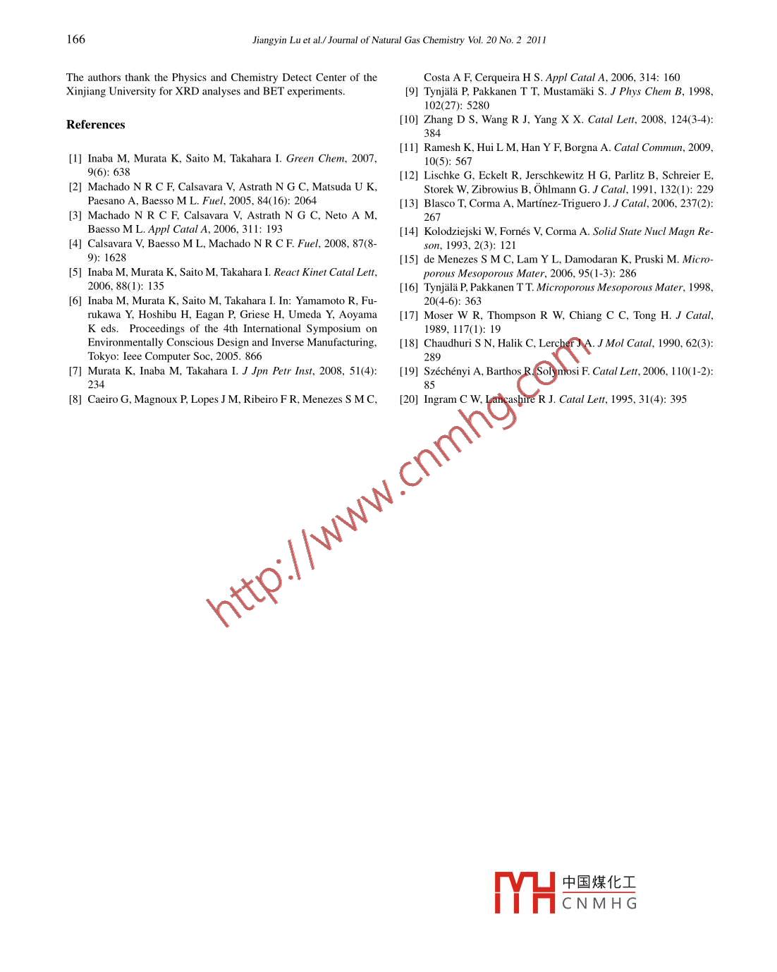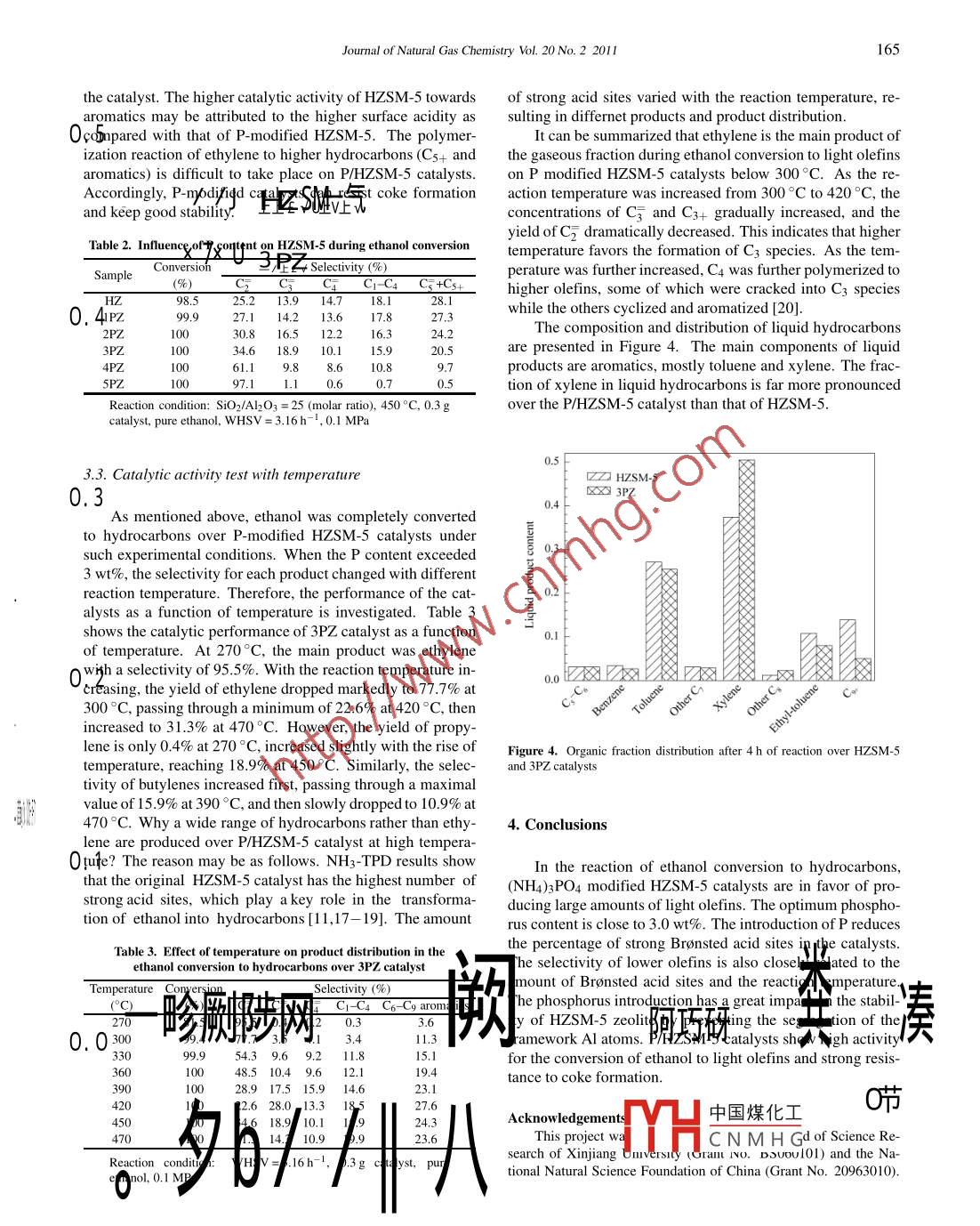 Availableonlineatwww.sciencedirect.comJoumal ofScience DirectNatural GasChemistryELSEVIERJournal of Natural Gas Chemistry 20(2011)162-166Effects of P content in a p/hzsm-5 catalyst on theconversion of ethanol to hydrocarbonsLirsity, Urumgi 830046, Xinjiang, ChineAbstractA series of P/HZSM-5 catalysts prepared by impregnation method were used for ethanol conversion to lower olefins. The catalysts werecharacterized by X-ray diffraction(XRD), NH3-temperature-programmed desorption(NH3-TPD)and N2 adsorption-desorption measurementsIt was found that the P/HZSM-5 catalysts showed high activity and selectivity toward light olefins. The selectivities of propylene and butylenecan be improved with the introduction of phosphorus P). When the content of reached 3.0 wt%, more thanropylene in the gaseousproducts was obtained over the P/HZSM-5 catalyst 4t 450.Ctroductid of P modified the strong Bronsted acid sites of the originalHZSM-5 catalysts and P/HZSM-5 catalysts could resist coke forgood stabilityKey wordsethanol; P/HZSM-5; hydrocarbons; modific1. Introductionofifork al atoftment [8]. Several studies reported that P-modifiedLight olefins, such as ethylene, propylene and bulylene HZSM-5 catalysts were active for ethanol conversion to ethyare important raw materials in the petrochemical industrylene 19-11]. Tynjala et al. [9] found that ethylene was theTraditional crude oil (mainly naphtha)cracking can not meet final product over P-modified HZSM-5 catalysts containingthe great demand due to oil supply crisis. It has driven much 2.2 wt% and 2.7 wt% P, and no higher hydrocarbons wereeffort to seek alternative and renewable sources. Ethanol observed at high reaction temperature(643 K). Zhang et alis particularly attractive since it is a renewable agricultural supported in their work that no higher hydrocarbons werresource and it can be obtained easily by fermentation of formed during ethanol dehydration, but not all the P-modifiddnAHZSM-5 catalysts favored dehydration of ethanol to ethylIt has been reported that as solid acid catalysts, HZSM-5 at high reaction temperature [10]. Ramesh et al. [11] investizeolites are widely used for conversion of ethanol to light gated the influence of H PO4 loading on the catalytic perforolefins [1-7. These studies revealed that the distribution mance of modified HZSM-5 catalysts, and found that higherof various products depends on the concentration of Bronsted hydrocarbons were produced to a significant extent duringacid sites on the catalyst. The acidity of HzsM-5 with lowerethanol conversion However no further studies were carriedSiO2/Al2O3 ratio suppressed the formation of C2, C3 and C4, out on ethanol conversion to C2-C4 olefins over P/HZSM-5but favored more C6+ aromatics as well as Cl-5 paraffins. catalysts. In this paper, we investigated the effects of Pcon-The selectivities of propylene and ethylene were improved tent on the selectivity of light olefins derived from ethanolprominently over metal-exchanged HZSM-5over P/HZSM-5 catalysts prepared by impregnation methodhe introduction of phosphorus on H-MFI zeoliFurthermore, the correlation between the production of C2-4stabilize the mfi zeolite structure by preventing theolefins and the acidity of the catalysts was also studiedCorrespondingauthor.Tel:+86-991-8581012-808:E-mail:yinglu@xju.edu.cnFor This project was supported by the Doctor Fund of Science Research of Xinjiang University(Gr中國煤化工 lal Natural Scienceundation of China( Grant No. 20963010)CNMHGCopyright(2011, Dalian Institute of Chemical Physics, Chinese Academy of Sciences. All rights reservedoi:10.1016/S1003-9953(1060163-6Journal of Natural Gas Chemistry VoL. 20 No. 2 201I2. Experimentalthen cooled down to room temperature. The adsorption ofNH3 was performed at room temperature for 30 min. PhysiCatalyst preparationcally adsorbed NH3 was removed at 120C. NH3-TPD curveswere recorded under helium flow with heating the samplesCommercial HZSM-5 zeolite (ratio of Sio2/Al2 O3=25from 120C to 900C at the rate of 10C/minNankai University, China) was used. (NH4)3 PO4 modifiedHZSM-5 catalysts were prepared by impregnation method: 2.3. Catalyst activity testthe HZSM-5 zeolite was impregnated in the aqueous solutioncontaining(NH4)3 PO4. The amounts of P were 0, 1.0 wt%Ethanol conversion was performed in a continuous flow2.0 wt%, 3.0 wt%, 4.0 wt% and 5.0 wt%, respectively. Ater fixed bed quartz tubular reactor with an inner diameter ofImpregnation, the wet catalysts were dried at 120'C for 4 h, 6 mm. About 0.3 g catalyst was put into the reactor. Previ-followed by a calcination at 550C in air flow for 5 h. The ous activation in situ was done in nitrogen flow(40 mL/min)P-modified samples were marked as HZ, IPZ, 2PZ, 3PZ, 4Pz for 30 min at 470 C with a heating rate of 2C/min. Pureand 5PZ based on the corresponding P concentrations. The ethanol (>99.7%), preheated to 120C by heating taps beforecoked catalyst was marked as UZ. Finally, the calcined cat- entering the reactor, was charged by a metering pump(Agialyst was pelletized, crushed and sieved, and the grains with lent P200lI series) into a nitrogen stream. The total pressure0.5-1.0 mm size were takenwas kept at O I MPa. The catalyst bed was heated electricallyA thermocouple, which reached the catalyst bed, was used2.2. Catalyst characterizationto measure the temperature during the reaction. The gaseousproducts were analyzed on-line using a gas chromatographThe phase identification of the original and modified cat-(Agilent 3420)equipped with a PEG-20M capillary columnalysts were carried out by an X-ray diffractometer( Mac Sci- and FID detector; and the atomic products were analyzed usence Ml8XHF22-SRA) withradiation operated at ing a HPI capillary column35 kV and 25 mA. XRD patterns were collected over 20 val-ues in the range of3°-70° at the rate of2%min3. Results and discussionAfter alkali fusion, the Si content of the samples was measured by gravimetric method, and then the contents of P andAl were test