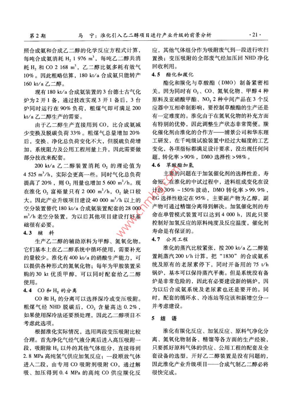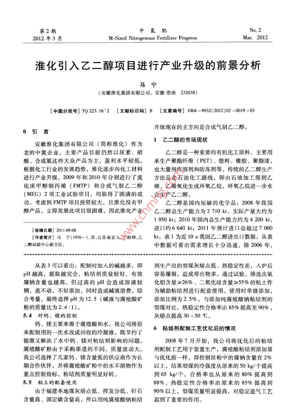 第2期中氮肥2012年3月M-Sized Nitrogenous Fertilizer ProgressMar.2012淮化引入乙二醇項(xiàng)目進(jìn)行產(chǎn)業(yè)升級(jí)的前景分析馬寧(安徽淮化集團(tuán)有限公司,安徽淮南232038)[中圖分類號(hào)]TQ23.162[文獻(xiàn)標(biāo)識(shí)碼]B[文章編號(hào)]1004-9932(2012)02-0019-030引言升級(jí)現(xiàn)在的主方向是合成氣制乙二醇。安徽淮化集團(tuán)有限公司(簡稱淮化)作為1乙二醇的市場現(xiàn)狀老的中氮企業(yè),主要產(chǎn)品目前仍然以尿素、硝乙二醇是一種重要的有機(jī)化工原料,主要用酸、合成氨這些大眾產(chǎn)品為主,盈利水平較低。來生產(chǎn)聚酯纖維(PET)、塑料、橡膠、聚酯漆,根據(jù)化工行業(yè)的發(fā)展趨勢,淮化逐步向化工材料也大量用作溶劑和防凍劑等。傳統(tǒng)的乙二醇生產(chǎn)進(jìn)行產(chǎn)業(yè)升級(jí),2009年和2010年分別進(jìn)行了流方法是走石油化工路線,即由石油加工得到乙化床甲醇制丙烯(FMTP)和合成氣制乙二醇烯,乙烯氧化生成環(huán)氧乙烷,環(huán)氧乙烷進(jìn)一步水(MEG)2項(xiàng)工業(yè)試驗(yàn)項(xiàng)目,均取得了圓滿的成合生產(chǎn)乙二醇。功??紤]到FMTP項(xiàng)目投資較大,且淮化沒有甲乙二醇是國內(nèi)短缺的化學(xué)品:2008年我國醇產(chǎn)品,立即發(fā)展此項(xiàng)目很困難,因此淮化產(chǎn)業(yè)乙二醇總生產(chǎn)能力為2710kt,實(shí)際產(chǎn)量大約為1950kt;2010年國內(nèi)總生產(chǎn)能力約為4200kt[收稿日期]201140908進(jìn)口約6640kt;2011年預(yù)計(jì)進(jìn)口會(huì)超過7000作者簡介]馬寧(1976—),男,江蘇南京人,工程師,乙kt。表1為近10a我國乙二醇進(jìn)出口數(shù)據(jù)。從表二醇試驗(yàn)中心副主任。中數(shù)據(jù)可看出需求增長十分迅速,除2006年,從表3可以看出:配制時(shí)加入的堿越多,即劑生產(chǎn)出的型煤灰熔點(diǎn)低、熱穩(wěn)定性差,入爐后pH越高,提取越完全,粘結(jié)劑質(zhì)量較好,有效容易爆裂,造成帶出物多。通過試驗(yàn),篩選出氧腐鈉含量也越高。但過高的pH會(huì)造成溶液較化鋁含量≥26%、二氧化硅含量≥55%的粘土作稠,流不動(dòng),不好添加,同時(shí)造成堿液浪費(fèi)。綜為輔助粘結(jié)劑進(jìn)行配套使用,使用時(shí)單獨(dú)添加,合考量,最終選擇pH為12.5(堿液與腐殖酸礦添加比例為2.5%。與添加純腐殖酸鈉粘結(jié)劑的粉的質(zhì)量比為24:1)。型煤對(duì)比,熱穩(wěn)定性合格率由85%提高至9%5.4對(duì)鈣、鎂的控制灰熔點(diǎn)提高30~50℃鈣、鎂主要來源于腐殖酸和水,我公司將原6粘結(jié)劑配制工藝優(yōu)化后的情況來配制用的一次水改成回收的冷凝液,既節(jié)約了能源又解決了水中鈣、鎂對(duì)粘結(jié)劑影響的問題。2008年7月開始,我公司將優(yōu)化后的粘結(jié)腐殖酸礦粉由于采購渠道的不同,質(zhì)量波動(dòng)大。劑配制工藝用于裝置生產(chǎn),腐殖酸粘結(jié)劑添加量我公司選擇了幾家鈣、鎂含量低的供應(yīng)商作為長與優(yōu)化前一樣,即控制漚粉中的腐鈉含量在2%期合作伙伴,并將腐殖酸礦粉中的水不溶物作為以上,結(jié)果型煤的冷強(qiáng)度從原來的50kg/個(gè)提高重點(diǎn)控制指標(biāo),粘結(jié)劑質(zhì)量明顯好轉(zhuǎn)。到65kg/個(gè),合格率也從原來的80%提高到5.5粘土的配套使用88%,熱穩(wěn)定性合格率由原來的85%提髙到由于福建本地煤灰熔點(diǎn)低、揮發(fā)分低、矸石90%以上,型煤質(zhì)量明顯提高,對(duì)穩(wěn)定造氣工藝含量高、固定碳含量高,所以用純腐殖酸鈉粘結(jié)起到了重要的作用。20中氮第2期其他年份進(jìn)口增長均超過10%。的檢測。表1近10a國內(nèi)乙二醇進(jìn)出口數(shù)據(jù)kt(2)淮化現(xiàn)有裝置能力為合成氨480kU/a、年份進(jìn)口量出口量硝酸400ka、空分76000m3/h,可以提供充2001597足的H2、CO、O2、NO供乙二醇生產(chǎn)。由于焦32化、老合成等裝置已停產(chǎn)拆除,有足夠的場地建20032519設(shè)新項(xiàng)目,可減少規(guī)劃、征地程序的辦理時(shí)間,3391同時(shí)巳有公用工程也基本能滿足需要。(3)淮化淘汰部分氮肥產(chǎn)能,升級(jí)成乙二醇產(chǎn)品,利用的是現(xiàn)有熱電、空分、氣化、變換、凈化等裝置,可以較新建乙二醇裝置的企業(yè)5216減少2/3的投資,建設(shè)周期也可縮短一半,先發(fā)0106646優(yōu)勢更明顯。(4)采用合成氣制乙二醇工藝流程,淮化從2010年至今,乙二醇的市場價(jià)格一直在現(xiàn)有的合成氨、甲胺、DMF裝置流程與其非常6000~10000元/t波動(dòng)。傳統(tǒng)生產(chǎn)工藝由于原相似,有大量實(shí)踐經(jīng)驗(yàn),管理及操作人員開展工料成本和能耗較高,實(shí)際盈利能力并不強(qiáng)。而準(zhǔn)作有業(yè)務(wù)基礎(chǔ),這在千噸級(jí)試驗(yàn)裝置上已證明了化煤制乙二醇工業(yè)試驗(yàn)項(xiàng)目的實(shí)際原料成本低于這一點(diǎn)。4000元/t,與傳統(tǒng)工藝相比有明顯優(yōu)勢。4工藝流程設(shè)想2淮化發(fā)展乙二醇項(xiàng)目的必要性利用淮化已有的180k/a合成氨裝置的德土(1)淮化現(xiàn)有的產(chǎn)品硝酸、尿素等盈利能古氣化、變換、NHD凈化系統(tǒng),新增制氧、變力低,同時(shí)由于高能耗、高污染的老合成氨及焦壓吸附分離CO和H2、亞酯合成、羰化合成、化等大系統(tǒng)退出生產(chǎn)序列,有必要建設(shè)高效益的草酸酯精制、加氫合成、乙二醇精