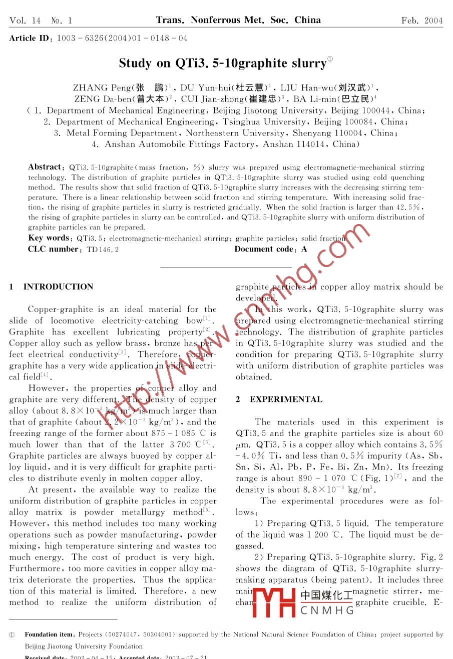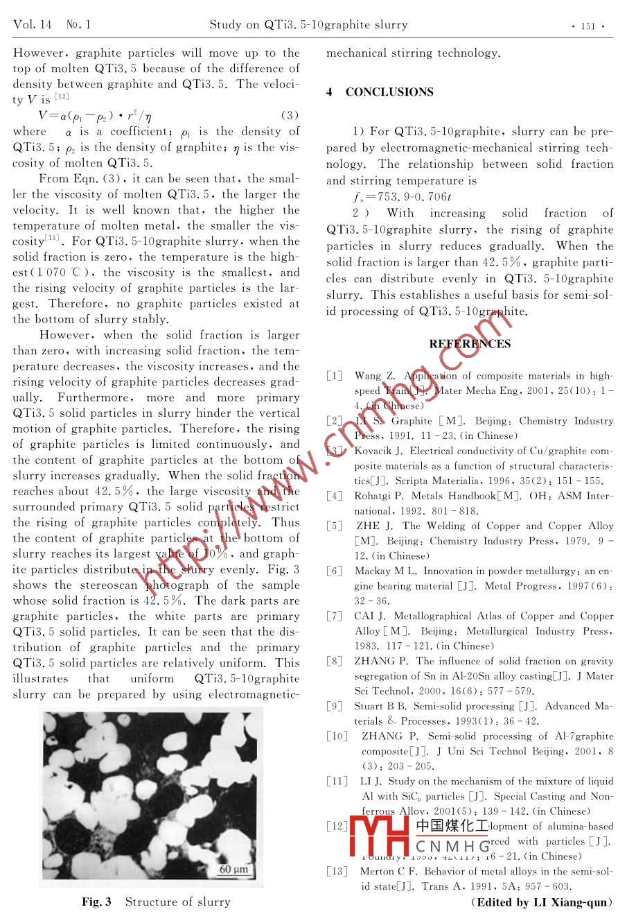Vol. 14 No. 1Trans. Nonferrous Met. Soc. ChinaFeb. 2004Article ID: 1003 - 6326(2004)01 -0148 -04.Study on QTi3. 5-10graphite slurry' DZHANG Peng(張鵬)',DU Yun-hui(杜云慧)', LIU Han- wu(劉漢武)',ZENG Da-ben( 曾大本)”,CUI Jian-zhong( 崔建忠), BA Li-min(巴立民)*( 1. Department of Mechanical Engineering, Beijing Jiaotong University, Beijing 100044, China;2. Department of Mechanical Engineering, Tsinghua University, Beijing 100084, China;3. Metal Forming Department, Northeastern University, Shenyang 110004, China;4. Anshan Automobile Fittings Factory, Anshan 114014, China)Abstract: QTi3. 5-10graphite( mass fraction, %) slurry was prepared using electromagnetic -mechanical stirringtechnology. The distribution of graphite particles in QTi3. 5-10graphite slurry was studied using cold quenchingmethod. The results show that solid fraction of QTi3. 5- l0graphite slurry increases with the decreasing stirring tem-perature. There is a linear relationship between solid fraction and stirring temperature. With increasing solid frac-tion, the rising of graphite particles in slurry is restricted gradually. When the solid fraction is larger than 42.5%,the rising of graphite particles in slurry can be controlled, and QTi3.5-10graphite slurry with uniform distribution ofgraphite particles can be prepared.Key words: QTi3. 5; electromagnetic mechanical stirring; graphite particles; solid fractionCLC number: TD146.2Document code: A1 INTRODUCTIONgraphite particles in copper alloy matrix should bedeveloped.Copper- graphite is an ideal material for theIn this work,QTi3. 5-10graphite slurry wasslide of locomotive electricity-catching bowl1prepared using electromagnetic mechanical stirringGraphite hasexcellent lubricating property-2] .technology. The distribution of graphite particlesCopper alloy such as yellow brass, bronze has per-in QTi3. 5-10graphite slurry was studied and thefect electrical conductivity-3]. Therefore, copper-condition for preparing QTi3. 5- 10graphite slurrygraphite has a very wide application in slide- electri-with uniform distribution of graphite particles wascal field41.obtained.However, the properties of copper alloy andgraphite are very different. The density of copper2 EXPERIMENTALalloy (about 8.8X10-3 kg/m3) is much larger thanthat of graphite (about 2. 2X10-3 kg/m2), and theThe materials used in this experiment isfreezing range of the former about 875-1 085 C isQTi3.5 and the graphite particles size is about 60much lower than that of the latter 3 700 'C[5].μm. QTi3.5 is a copper alloy which contains 3. 5%Graphite particles are always buoyed by copper al--4.0% Ti, and less than 0. 5% impurity (As,Sb,loy liquid, and it is very difficult for graphite parti-Sn, Si, Al, Pb, P, Fe, Bi, Zn, Mn). Its freezing .cles to distribute evenly in molten copper alloy.range is about 890 - 1 070 C(Fig. 1)47,and theAt present, the available way to realize thedensity is about 8. 8X10 -3 kg/m3uniform distribution of graphite particles in copperThe experimental procedures were as fol-alloy matrix is powder metallurgy method-61lows:However, this method includes too many working1) Preparing QTi3. 5 liquid. The temperatureoperations such as powder manufacturing,powderof the liquid was 1 200 C. The liquid must be demixing,high temperature sintering and wastes toogassed.much energy. The cost of product is very high.2) Preparing QTi3.5-10graphite slurry. Fig. 2F urthermore, too more cavities in copper alloy ma-shows the diagram of QTi3. 5- 10graphite slurry-trix deteriorate the properties. Thus the applica-making apparatus ( being patent). It includes threetion of this material is limited. Therefore, a newmail中國煤化工-magnetic stirrer, mmethod to realize the uniform distribution ofchanYHCNMHG.. graphite crucible. E-①Foundation item: Projects (50274047. 50304001) supported by the National Natural Science Foundation of China; project supported byBeijing Jiaotong University FoundationReceived date: 2003 -04 - 15; Accepted date: 2003 -07 - 21Correpondenee.ZHANG Peng, Professor, PhD; Tel: + 86-10-51682226; E mail: zhangp9@ 263. netVol. 14 No. 1Study on QTi3. 5-10graphite slurry ..149●1 200N pole↓Graphite crucibleSlury1 1001 084.5 CS pole ,L+CuTi10001.+2920 C1.+Cu3Ti2O2 900-。855 C875 C 27> 32.5k /4.4|L+CugTf800700x+Cu;Ti|CuzT2+Cu3Ti| CuTi+MaskCugTi2600Cu02030CoolerHeater(aFig. 1 Cu-Ti binary equilibrium diagramA-AUpper cover |Thermocouplelectromagnetic stirrer is made up of three couplesAr gas pipeof electric poles which distribute around the cruci-ble evenly. Its main role is to break up the dendrit-ic crystal in the process of solidification by circular .motion of slurry. Its power is 10 kW. Mechanicaluniform device is a fluid director designed special-ly. It can move up and down by using an assistantelectric device. Its main role is to enlarge the stir-ring intensity and to accelerate the deconcentrationof graphite particles in the whole crucible. Graph-ite crucible is a temperature- adjusting container.Uniform deviceSpigotThere are holes in its wall evenly. These holes(b)contain heaters and coolers so as to adjust the tem-perature of slurry. There is a hole at the bottom ofthe crucible. Its role is to let out the slurry. Be-Fig.2 Diagram of QTi3. 5-10graphitecause the solidus liquidus interval of QTi3.5 is 180slurry- making apparatusC,the solid fraction ( volume fraction)of slurry ismainly controlled by stirring temperature. Theprocess of making QTi3.5-10graphite slurry was asserved directly after cold quenching.4) Conduct SEM experiment to determine thefollows: first, the crucible was preheated up to 1solid fraction of slurry and the distribution of000 "C by using the heaters. After the QTi3. 5 liq-uid (1 200 C) and 60 μm graphite particles weregraphite particles in slurry.put into the crucible,the upper cover was overlaidand Ar gas was inlet through the gas pipe in order3 RESULTS AND DISCUSSIONto prevent the liquid and graphite particles fromoxidizing.' Then, the electromagnetic s