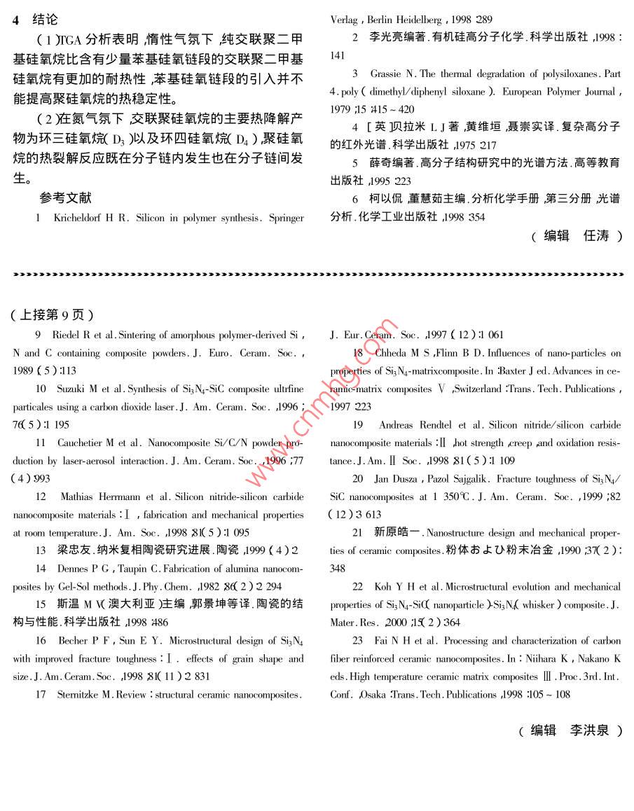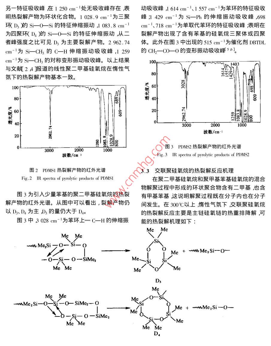 交聯(lián)聚硅氧烷的熱降解行為鐘發(fā)春1傅依備1趙小東1張占文2李波2(1中國(guó)工程物理研究院化工材料研究所綿陽(yáng)621900)2中國(guó)工程物理研究院激光聚變研究中心綿陽(yáng)6219000文摘運(yùn)用TGA-R研究了交聯(lián)聚二甲基硅氧烷以及含10%、16%苯基硅氧烷鏈段的聚二甲基硅氧烷旳熱降解行為并用FR分析了聚硅氧烷的熱分解產(chǎn)物。結(jié)果表明在300℃以上交聯(lián)聚硅氧烷熱降解的主要產(chǎn)物為環(huán)三硅氧烷和環(huán)四硅氧烷裂解反應(yīng)既在分子鏈內(nèi)發(fā)生也在分子鏈間發(fā)生。在惰性氣氛下苯基硅氧鏈段的引入未能提高聚二甲基硅氧烷的熱穩(wěn)定性。關(guān)鍵詞聚二甲基硅氧烷熱降解環(huán)三硅氧烷環(huán)四硅氧烷The Pyrolysis Behavior of Cross-linked PolysiloxanesZhong Fachun Fu Yibei Zhao Xiaodong Zhang Zhanwen Li Bo2(1 Institute of Chemical Materials The Chinese Academy of Engineering Physics Mianyang 621900)(2 Center of Laser Fusion, The Chinese Academy of Engineer621900Abstract The pyrolytic behavior and pyrolytic products of cross- linked polysiloxanes including polydimethylsi-loxane and polydimethylsiloxane blocked with 10% and 16% polydiphenylsiloxane segments are studied by TGA-IR tech-nique. Experimental results show that the main pyrolytic products of polysiloxane above 300C in nitrogen atmosphere ishexamethyleyclotrisiloxane( D3)and octamethylcyclotetrasiloxane( D4 ) The pyrolysis reaction occurs bothhains and intramolecular chains. Thermal stability of polysiloxane in inert gas atmosphere can not be improvedby introduction of diphenylsilane segmentsKey words polysiloxane, Pyrolysis Hexamethylcyclotrisiloxane, Octamethylcyclotetrasiloxane前言的量較小更大的環(huán)硅氧烷的解聚量不明顯而且取聚硅氧烷產(chǎn)品具有優(yōu)異的耐高低溫、耐老化、疏決于反應(yīng)條件。在硅原子上引入苯基可改善熱穩(wěn)定水、電絕緣、低表面張力等性能在太陽(yáng)能、原子能電性和輻射穩(wěn)定性并能提高阻尼性能和與其他聚合站、煤的液化等領(lǐng)域中廣泛用作傳熱、密封、阻燃等物如環(huán)氧樹脂和聚氨酯等的相容性。為了研究含少材料。在空間高技術(shù)領(lǐng)域由于聚硅氧烷突岀的高量苯基的交聯(lián)聚二甲基硅氧烷旳熱降解行為和熱裂低溫性能和耐輻照特性可用作航天器密封材料和解產(chǎn)物本文采用 Nicolet800紅外光譜儀與TGA-阻尼材料12050熱重分析儀聯(lián)用技術(shù)研究了聚硅氧烷的熱穩(wěn)線性聚二甲基硅氧烷熱降解主要形成以$—-o定性和熱分解產(chǎn)物探討了聚硅氧烷的熱分解杋理。鍵為主的環(huán)狀化合物21主要的解聚產(chǎn)物為六甲基2實(shí)驗(yàn)環(huán)三硅氧烷簡(jiǎn)稱D)八甲基環(huán)四硅氧烷簡(jiǎn)稱D)2.1原料及處理方法收稿日期2002-08-26南服氣服儒需帳融召原料及處理方法見(jiàn)表1。表1原料及處理方法Tab. 1 Raw materials and treat methods原料簡(jiǎn)稱規(guī)格(分子量)處理方式羥基聚二甲基硅氧烷PDMS成都有機(jī)硅研究中心真空脫水a(chǎn)a二羥基一聚二甲基硅PDMS2440(16%苯基)成都有機(jī)硅研究中心真空脫水氧烷一b聚二苯基硅氧烷PDMS3780(10%苯基)成都有機(jī)硅研究中心真空脫水二月桂酸二丁基錫DBTDI上?;瘜W(xué)試劑采購(gòu)供應(yīng)站正硅酸乙酯TEOS分析純上海化學(xué)試劑一廠CaCl2干燥2.2聚硅氧烷的合成的鍵能較高分別為451kJ/mol和326kJ/mol因而,將αμ-端羥基聚硅氧烷和正硅酸乙釀TΣOs)具有卓越的耐熱性在200℃·隔絕氧氣及無(wú)催化劑按2:(摩爾比)合均勺加入2%質(zhì)量分?jǐn)?shù))的存在的情況下解聚非常緩慢(一般在20h后才略DBTDL減壓脫氣澆入潔凈模具中室溫放置η2h,有分解)圖Ka)為PDMS1的TGA曲線圖(氮?dú)鈿馊缓竺撃R迫敫稍锲髦蟹胖?d后備測(cè)試。氛升溫速率為20℃/min)從圖中可以看出, PDMSI2.3性能測(cè)試具有良好的耐熱特性在330℃以上才略有分解失采用美國(guó)TA公司TGA-2050熱重分析儀進(jìn)行重1%的溫度為340℃。少量苯基(10%~16%)的聚硅氧烷的熱重分析:升溫速率20℃/min溫度范加入使分解溫度有所下阻圖b)(c)],PDMS2和圍50℃~800℃C用 Nicolet800紅外光譜儀與TGA聯(lián)PDMs3失重1%的溫度分別為270℃和210℃這是用檢測(cè)熱裂解產(chǎn)物。由于在無(wú)空氣存在的情況下體系內(nèi)殘余的OH基3結(jié)果與討論團(tuán)與苯基容易脫苯而產(chǎn)生交聯(lián)在高溫時(shí)還會(huì)發(fā)生3.1聚硅氧烷耐熱性研究在苯基之間脫氬、脫苯等反應(yīng)因而苯基的加入未必組成聚硅氧烷主鏈結(jié)構(gòu)的Si-0鍵和S-C鍵能提高熱穩(wěn)定性3。475%/℃0.4so}354.52℃(1)1.0g330.0394.7℃2%-2060606023206060860422460805溫度/℃(a)PDMsl(c) PDMS3圖1不同材料在氮?dú)鈿夥障碌腡GA曲線Fig. I TGA curves of PDMS series in nitrogen atmosphere32聚硅氧烷熱裂解產(chǎn)物分析的特征吸收峰800cm處為一SCH3)的伸縮振圖2是在不同溫度和時(shí)間采集的交聯(lián) PDMSI動(dòng)吸收峰,表明在熱裂解產(chǎn)物的S上僅有2個(gè)甲熱裂解產(chǎn)物的紅外光譜。圖中609cm-1為si-(H2其。-1頭碼五狀化物的“cu另一特征吸收峰在1250cm-處無(wú)吸收峰存在表動(dòng)吸收峰614cm、1557cm-為苯環(huán)的特征吸收明熱裂解產(chǎn)物為環(huán)狀化合物。1028.9cm-為三聚峰;429cm-1為Si—Ph的伸縮振動(dòng)吸收峰,698玳D3舶的S—0—-Si的特征伸縮振動(dòng),083.8cm-1cm-、7l8cm-1為單取代苯環(huán)的特征吸收峰表明在為四聚環(huán)(D4)舶Si-O-Si的特征伸