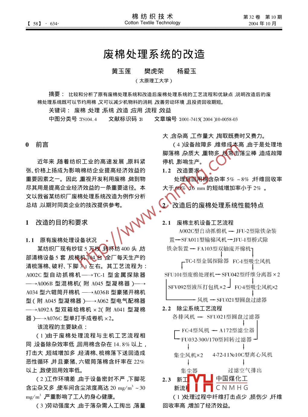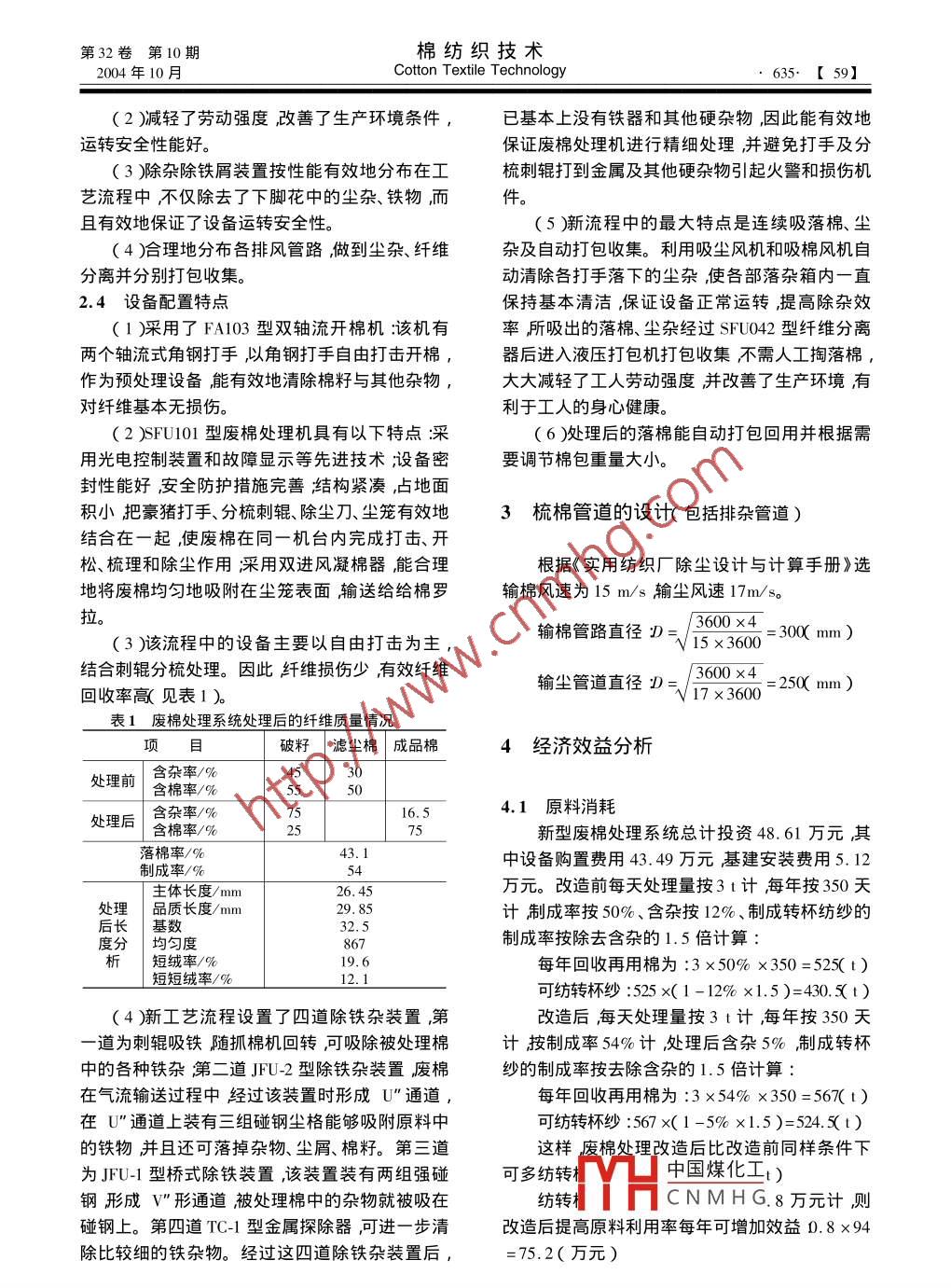 棉紡織技術(shù)第32卷第10期58】·634Cotton Textile Technology2004年10月廢棉處理系統(tǒng)的改造黃玉蓮樊虎榮楊愛玉(太原理工大學(xué))摘要:比較和分析了原有廢棉處理系統(tǒng)和改造后廢棉處理系統(tǒng)的工藝流程和優(yōu)缺點(diǎn)說明改造后的廢棉處理系統(tǒng)既可以節(jié)約用棉又可以減少杋物料的消耗改善勞動環(huán)境且投資回收期短。關(guān)鍵詞:廢棉灲理系統(tǒng)改造應(yīng)用流程敚益中圖分類號:s104.4文獻(xiàn)標(biāo)識碼3文章編號:001-7415(2004)10-005803大含雜高工作量大掏取既費(fèi)時(shí)又費(fèi)力0前言(4)設(shè)備故障多維修成本高由于是處理地腳落棉雜質(zhì)大重物多經(jīng)常擊落塵棒造成故障近年來隨著紡織工業(yè)的高速發(fā)展原料緊停機(jī)影響生產(chǎn)張、價(jià)格上揚(yáng)成為影響棉紡企業(yè)提高經(jīng)濟(jì)效益的1.2改造要求重要因素之一。因此重視開發(fā)利用廢棉做到物處理后回用棉含雜率5%~8%纖維回收率盡其用是提高企業(yè)經(jīng)濟(jì)效益的一條重要途徑。本大于60%;6mm的短絨增加率小于2%文以我省某紡織廠廢棉處理系統(tǒng)改造為例作分析總結(jié)以期對同類企業(yè)的技改提供參考。2改造后的廢棉處理系統(tǒng)性能特點(diǎn)改造的目的和要求2.1廢棉主機(jī)設(shè)備工藝流程1002C型自動抓棉機(jī)一JFU-2型除鐵雜裝1.1原有廢棉處理設(shè)備狀況置一SFAO11型輸棉風(fēng)機(jī)一JFU-1型橋式除某紡織廠現(xiàn)有紗錠5萬枚轉(zhuǎn)杯紡400頭紡鐵雜裝置一FA103型雙軸流開棉機(jī)部清棉設(shè)備5套梳棉機(jī)104臺全廠每天生產(chǎn)的TC-1型金屬探除器FC1型吸塵風(fēng)機(jī)凊梳落棉、破籽、下腳3t左右。其工藝流程為A002C型自動抓棉機(jī)—→TC-1型金屬探除器SFU10型廢棉處理機(jī)一SFU042型纖維分離器×2A006B型混棉機(jī)(附A045型凝棉器)一一→SFV092型液壓打包機(jī)×2FC4型吸塵風(fēng)機(jī)x2A034型六輥筒開棉機(jī)—→A036B型豪豬開棉機(jī)型(附A045型凝棉器)→A062型電氣配棉器風(fēng)機(jī)一SFUO21型圓盤過濾器→→A02A型雙箱給棉機(jī)×2(附A041型凝棉2.2除塵系統(tǒng)工藝流程器)→A076C型單打手成卷機(jī)×2各排風(fēng)機(jī)一SFU021型圓盤過濾器該流程的主要缺點(diǎn)FC4型風(fēng)機(jī)一A172型濾塵器(1)由于廢棉處理流程與主機(jī)工藝流程相同沒設(shè)備除雜效率低回用棉含雜在14.8%以上,FU032300/170型回轉(zhuǎn)過濾器打擊大短絨增加多經(jīng)清棉、梳棉落下送回造成集塵風(fēng)機(jī)×2472-11N10C型離心風(fēng)機(jī)惡性循環(huán)并且豪豬、六輥筒落棉含纖率在22%以上致使回用效率低集塵器過濾空氣排出2厘作環(huán)境差由于設(shè)備密封不嚴(yán)下腳花2.3新工V含塵雜又多使車間含塵濃度高達(dá)20mg/m3~30新流H中國煤化工CNMHGmg/m3嚴(yán)重影響了工人的身心健康。(1)處理過程中纖維打擊點(diǎn)少損傷少纖維3)動強(qiáng)度大由于落雜需人工掏出落量回收率高增加了經(jīng)濟(jì)效益第32卷第10期棉紡織技術(shù)2004年10月Cotton Textile Technology635·【59】(2減輕了勞動強(qiáng)度改善了生產(chǎn)環(huán)境條件已基本上沒有鐵器和其他硬雜物,因此能有效地運(yùn)轉(zhuǎn)安全性能好保證廢棉處理機(jī)進(jìn)行精細(xì)處理并避免打手及分3脎除雜除鐵屑裝置按性能有效地分布在工梳刺輥打到金屬及其他硬雜物引起火警和損傷機(jī)藝流程中不僅除去了下腳花中的塵雜、鐵物而件且有效地保證了設(shè)備運(yùn)轉(zhuǎn)安全性?!?〕新流程中的最大特點(diǎn)是連續(xù)吸落棉、塵4)合理地分布各排風(fēng)管路做到塵雜、纖維雜及自動打包收集。利用吸塵風(fēng)機(jī)和吸棉風(fēng)機(jī)自分離并分別打包收集動清除各打手落下的塵雜使各部落雜箱內(nèi)一直2.4設(shè)備配置特點(diǎn)保持基本清潔保證設(shè)備正常運(yùn)轉(zhuǎn)提高除雜效1)屎采用了FA103型雙軸流開棉機(jī):該機(jī)有率所吸出的落棉、塵雜經(jīng)過SFU042型纖維分離兩個(gè)軸流式角鋼打手以角鋼打手自由打擊開棉器后進(jìn)入液壓打包機(jī)打包收集不需人工掏落棉作為預(yù)處理設(shè)備能有效地清除棉籽與其他雜物大大減輕了工人勞動強(qiáng)度并改善了生產(chǎn)環(huán)境有對纖維基本無損傷。利于工人的身心健康(2)sFU101型廢棉處理機(jī)具有以下特點(diǎn):采6)處理后的落棉能自動打包回用并根據(jù)需用光電控制裝置和故障顯示等先進(jìn)技術(shù)設(shè)備密要調(diào)節(jié)棉包重量大小封性能好安全防護(hù)措施完善構(gòu)緊湊,占地面積小把豪豬打手、分梳刺輥、除塵刀、塵籠有效地3梳棉管道的設(shè)計(jì)包括排雜管道)結(jié)合在一起使廢棉在同一機(jī)臺內(nèi)完成打擊、開松、梳理和除塵作用:采用雙進(jìn)風(fēng)凝棉器能合理根據(jù)《實(shí)用紡織廠除塵設(shè)計(jì)與計(jì)算手冊》選地將廢棉均勻地吸附在塵籠表面輸送給給棉羅輸棉風(fēng)速為15ms輸塵風(fēng)速17m/s。3)該流程中的設(shè)備主要以自由打擊為主輸棉管路直徑力=/3600×430(m)15×3600結(jié)合刺輥分梳處理。因此纖維損傷少有效纖維回收率高見表1)。輸塵管道直徑=17×3600X mm表1廢棉處理系統(tǒng)處理后的纖維質(zhì)量情況項(xiàng)目破籽濾塵棉成品棉4經(jīng)濟(jì)效益分析處理前|貪雜率/%含棉率處理后雜率16.