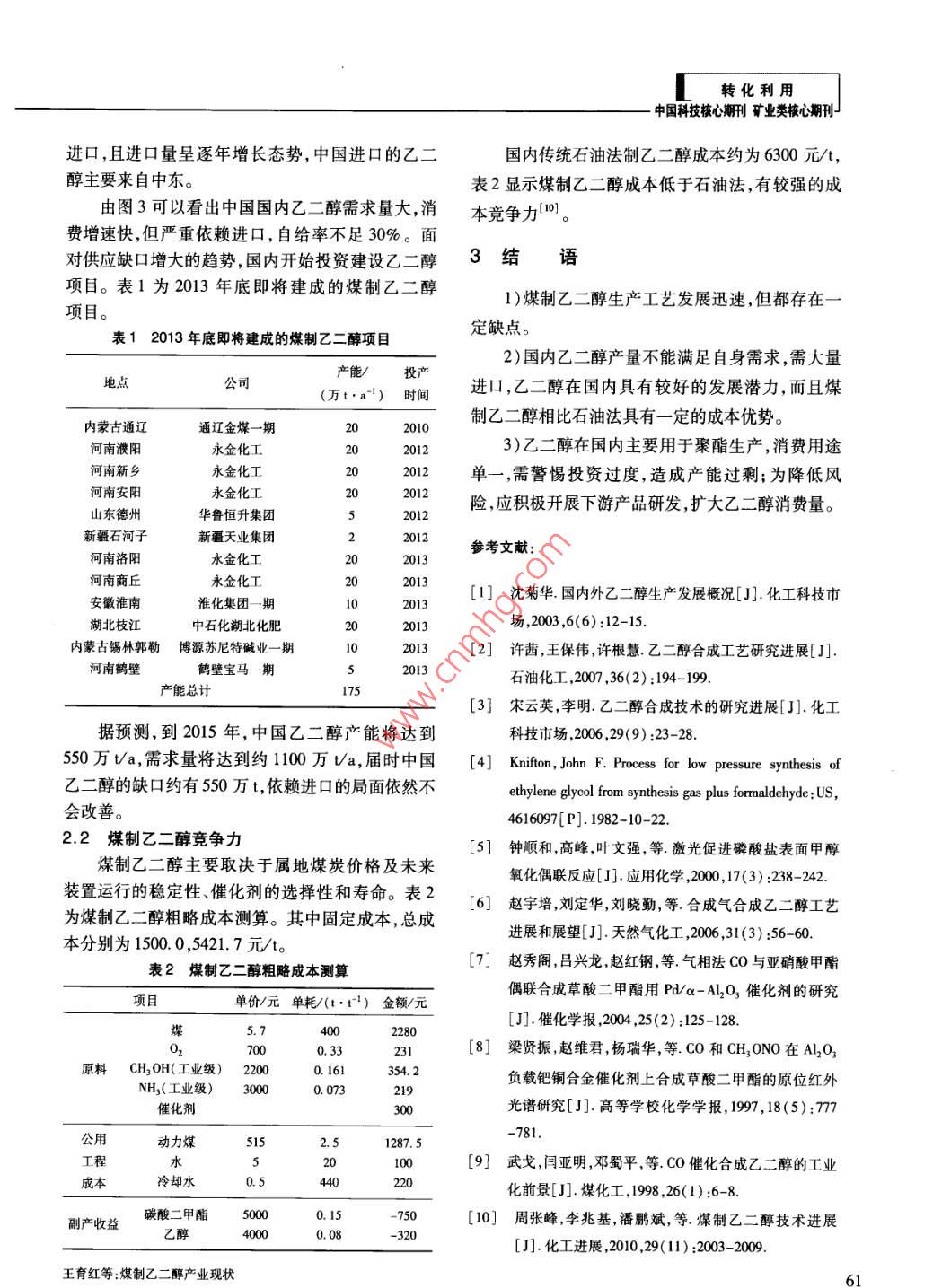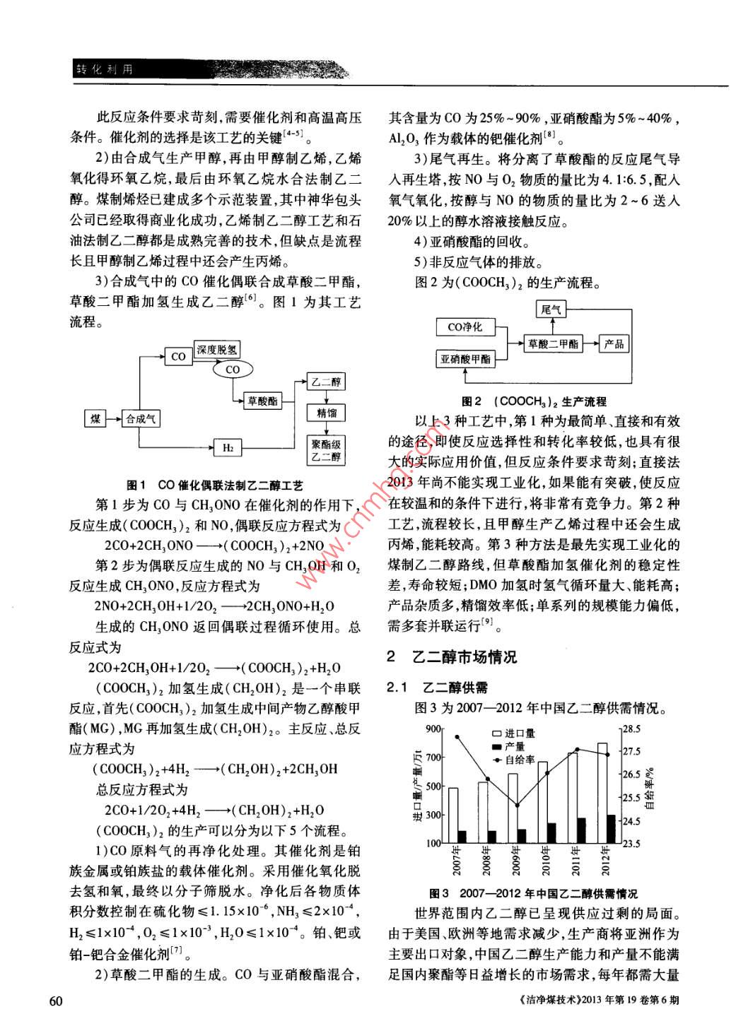 轉(zhuǎn)化利用國科技核心期刊礦業(yè)類核心期刊媒制乙二醇產(chǎn)業(yè)現(xiàn)狀王育紅,谷小虎(中國平煤神馬能源化工研究院,河南平頂山467000)摘要:乙二醇是一種重要的有機(jī)化工原料,主要以石油為原料進(jìn)行生產(chǎn)。中國特殊的能源結(jié)構(gòu)使煤制乙二醇研究熱度日益高漲。闡述了3種煤制乙二醇工藝路線及優(yōu)缺點(diǎn),詳細(xì)介紹了CO催化偶聯(lián)法制乙二醇生產(chǎn)技術(shù)。通過分析國內(nèi)乙二醇的供需形勢、投資建設(shè)情況,認(rèn)為煤制乙二醇擁有成本優(yōu)勢,具有一定的競爭力,但不可盲目開發(fā)投資,謹(jǐn)防產(chǎn)能過剩,且仍需開拓下游產(chǎn)品,拓寬利用途徑,抵抗市場風(fēng)險(xiǎn)。關(guān)鍵詞:煤;乙二醇;工藝技術(shù);產(chǎn)業(yè)化中圖分類號:TQ223;TD849文獻(xiàn)標(biāo)識碼:A文章編號:1006-6772(2013)06-0059-03Status and development of synthesis of ethylene glycol from coalWANG Yuhong, GU XiaohuChina Pingmei Shenma Group Research Institute of Energy and Chemical, Pingdingshan 467000, China)Abstract: Ethylene glycol is an important organic raw material for chemistry industry. It's mainly developed fromtroleum. Limited by the energy structure in China, the research of coal to ethylene glycol become urgent. Introduceseveral main coal to ethylene glycol processes and their merits and demerits. Detail CO catalytic coupling methodas well as domestic ethylene glycol supply and demand situation, investment status. The results show that, coalto ethylene glycol industry has cost advantage To prevent overcapacity, the investment should be intelligent. Thedevelopment of downstream products is also important, which helps to resist riskKey words: coal; ethylene glycol; technology; industrialization0引言2009—2013年掀起了建設(shè)高潮。本文介紹了煤制乙二醇生產(chǎn)工藝及優(yōu)缺點(diǎn),認(rèn)為開展煤制乙二醇技乙二醇(EG)是一種重要的石油化工基礎(chǔ)有機(jī)原術(shù)研究十分必要,但在技術(shù)完全成熟前需控制生產(chǎn)料,又名甘醇、亞乙基二醇,分子式為HOCH2CH2OH,規(guī)模。是無色透明、稍帶甜味的黏稠液體。乙二醇是最簡1煤制乙二醇工藝單和最重要的脂肪族二元醇,主要用于生產(chǎn)聚酯和各類抗凍劑,前者用于制造纖維、薄膜和聚對苯二以煤為原料制取乙二醇,主要有3種工藝,3種甲酸乙二醇酯(PET)樹脂;其它用途則包括解凍液、工藝最初的步驟均為采用煤氣化技術(shù)制取合成氣表面涂層、照像顯影液、水力制動用液體以及油墨(CO+H2)。等行業(yè)。高純乙二醇可用做過硼酸銨的溶劑和介1)由合成氣一步直接合成乙二醇。其化學(xué)反質(zhì),還可用于生產(chǎn)特種溶劑乙二醇醚3。應(yīng)方程式為面對乙二醇對外需求度過高的現(xiàn)狀,國內(nèi)在2CO+3H2一→HOCH2CH2OH收稿日期:2013-07-08責(zé)任編輯:宮在芹基金項(xiàng)目:河南省重大科技專項(xiàng)(00310作者簡介:王育紅(1968-),女河南平頂山人,高級工程師,畢業(yè)于安徽工業(yè)大學(xué)主要從事煤化工方面的研究。Emil: xiaohua@163com。引用格式:王育紅,谷小虎煤制乙二醇產(chǎn)業(yè)現(xiàn)狀[門潔凈媒技術(shù),2013,19(6):59-61王育紅等:煤制乙二醇產(chǎn)業(yè)現(xiàn)狀59轉(zhuǎn)化利用此反應(yīng)條件要求苛刻需要催化劑和高溫高壓其含量為CO為25%-90%,亞硝酸酯為5%~40%條件。催化劑的選擇是該工藝的關(guān)鍵43。Al2O3作為載體的鈀催化劑。2)由合成氣生產(chǎn)甲醇,再由甲醇制乙烯,乙烯3)尾氣再生。將分離了草酸酯的反應(yīng)尾氣導(dǎo)氧化得環(huán)氧乙烷,最后由環(huán)氧乙烷水合法制乙二入再生塔按NO與O2物質(zhì)的量比為416.5,配入醇。煤制烯烴已建成多個(gè)示范裝置,其中神華包頭氧氣氧化,按醇與NO的物質(zhì)的量比為2~6送入公司已經(jīng)取得商業(yè)化成功,乙烯制乙二醇工藝和石20%以上的醇水溶液接觸反應(yīng)。油法制乙二醇都是成熟完善的技術(shù),但缺點(diǎn)是流程4)亞硝酸酯的回收長且甲醇制乙烯過程中還會產(chǎn)生丙烯。5)非反應(yīng)氣體的排放。3)合成氣中的CO催化偶聯(lián)合成草酸二甲酯圖2為( COOCH3)2的生產(chǎn)流程。草酸二甲酯加氫生成乙二醇°。圖1為其工藝流程。CO凈化CO深度脫氫草酸二甲酯產(chǎn)品亞硝酸甲酯CO乙二醇草酸酯圖2( COOCH3)2生產(chǎn)流程煤上十合成氣精餾以上3種工藝中,第1種為最簡單、直接和有效聚酯級的途徑,即使反應(yīng)選擇性和轉(zhuǎn)化率較低,也具有很大的實(shí)際應(yīng)用價(jià)值,但反應(yīng)條件要求苛刻;直接法圖1co催化偶聯(lián)法制乙二醇工藝2013年尚不能實(shí)現(xiàn)工業(yè)化,如果能有突破,使反應(yīng)第1步為CO與CH1ONO在催化劑的作用下,在較溫和的條件下進(jìn)行,將非常有競爭力。第2種反應(yīng)生成( COOCH3)2和NO,偶聯(lián)反應(yīng)方程式為工藝,流程較長,且甲醇生產(chǎn)乙烯過程中還會生成2C0+2CH2ONO—→( COOCH3)2+2NO丙烯,能耗較高。第3種方法是最先實(shí)現(xiàn)工業(yè)化的第2步為偶聯(lián)反應(yīng)生成的NO與CH3OH和O2煤制乙二醇路線,但草酸酯加氫催化劑的穩(wěn)定性反應(yīng)生成CH2ONO,反應(yīng)方程式為差,壽命較短;DMO加氫時(shí)氫氣循環(huán)量大、能耗高;2NO+2CH3OH+1/202CH ONO+HO產(chǎn)品雜質(zhì)多,精餾效率低;單系列的規(guī)模能力偏低生成的CH3ONO返回偶聯(lián)過程循環(huán)使用。總需多套并聯(lián)運(yùn)行。反應(yīng)式為2