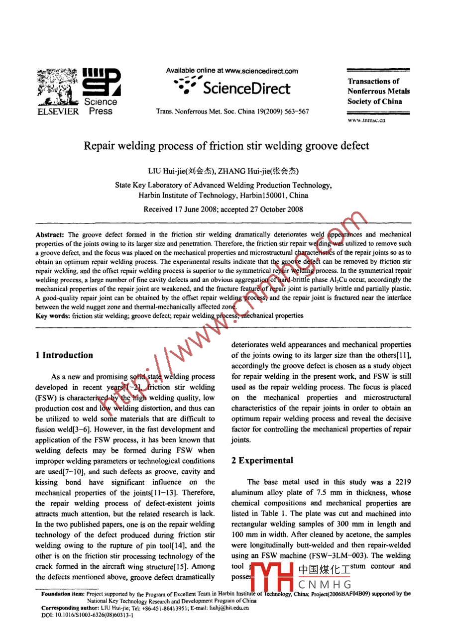 Available online at www. sciencedirect.comTransactions ofP“ScienceDirectNonferrous MetalsSociety of ChinaELSEVIER PressTrans. Nonferrous Met. Soc. China 19(2009) 563-567www .nmsc.cnRepair welding process of friction stir welding groove defectLIU Hui-jie(劉會杰), ZHANG Hri-je(張會杰)State Key Laboratory of Advanced Welding Production Technology,Harbin Institute of Technology, Harbin150001, ChinaReceived 17 June 2008; accepted 27 October 2008Abstract: The groove defect formed in the friction stir welding dramatically deteriorates weld appearances and mechanicalproperties of the joints owing 10 its larger size and penetration. Therefore, the friction stir repair welding was utilized to remove sucha groove defect, and the focus was placed on the mechanical properties and microstructural charaterstics of the repair joints so as toobtain an optimum repair welding process. The experimental results indicate that the groove defect can be removed by friction stirrepair welding, and the offset repair welding process is superior to the symmetrical repair welding process. In the symmetrical repairwelding process, a large number of fine cavity defects and an obvious aggregation of hard-britle phase Al2Cu occur, accordingly themechanical properties of the repair joint are weakened, and the fracture feature of repair joint is partially britle and partially plastic.A good-quality repair joint can be obtained by the offset repair welding process, and the repair joint is fractured near the interfacebetween the weld nugget zone and thermal-mechanically affected zone.Key words: friction stir welding; groove defect; repair welding process; mechanical propertiesdeteriorates weld appearances and mechanical properties1 Introductionof the joints owing to its larger size than the others[11],accordingly the groove defect is chosen as a study objectAs a new and promising solid state welding processfor repair welding in the present work, and FSW is stilldeveloped in recent years[1-2], friction stir weldingused as the repair welding process. The focus is placed(FSW) is characterized by the high welding quality, lowon the mechanical properties and microstructuralproduction cost and low welding distortion, and thus cancharacteristics of the repair joints in order to obtain anbe utilized to weld some materials that are difficult tooptimum repair welding process and reveal the decisivefusion weld[3- -6]. However, in the fast development andfactor for controlling the mechanical properties of repairapplication of the FSW process, it has been known thatjoints.welding defects may be formed during FSW whenimproper welding parameters or technological conditions2 Experimentalare used[7- 10], and such defects as groove, cavity andkissing bond have significant influence on theThe base metal used in this study was a 2219mechanical properties of the joints[11-13]. Therefore,aluminum alloy plate of 7.5 mm in thickness, whosethe repair welding process of defect-existent jointschemical compositions and mechanical properties areattracts much attention, but the related research is lack.listed in Table 1. The plate was cut and machined intoIn the two published papers, one is on the repair weldingrectangular welding samples of 300 mm in length andtechnology of the defect produced during friction stir100 mm in width. After cleaned by acetone, the sampleswelding owing to the rupture of pin tool[14], and thewere longitudinally butt-welded and then repair-weldedother is on the friction stir processing technology of theusing an FSW machine (FSW- 3LM- -003). The weldingcrack formned in the aircraft wing structure[15]. Amongtool中國煤化工- stum contour andthe defects mentioned above, groove defect dramaticallypossesYHCNMHGFoundation item: Project suppored by the Program of Excellent Team in Harbin Instiute of Technology, China; Project(2006BAF04B09) supported by theNational Key Technology Research and Development Program of ChinaCorreponding author; LIU Hui-jie, Tel: +86- 451-86413951; E-mail: liuhj@hit.edu.cnDOI: 10.1016/51003-6326(08)60313-1564LIU Hui-jie, et al/Trans. Nonferrous Met. Soc. China 19(2009) 563-567Table 1 Chemical compositions and mechanical properties of 2219 aluminum alloyChemical composition (mass fraction)%Mechanical propertiesYieldElongation/AICuMnFeVZnZstrength/MPa strength/MPaB6.480.32 0.230.060.08 0.040.40.2043231511For the convenience, we define that the joint or(Instron-1 186), and the tensile properties of each jointweld directly formed from the base metal is initial jointwere evaluated using three tensile specimens cut fromor initial weld, while the joint or weld formed after repairthe same joint. After tensile test, the fracture features ofwelding of the initial joint or initial weld is repair joint orthe joints were analyzed by OM and SEM mentionedrepair weld. With regard to repair welding, there wereabove.two repair processes. One was symmetrical repairwelding process in which the centerine of the repair3 Results and analysesweld was consistent with that of the initial weld withgroove defect; the other was offset repair welding3.1 Tensile properties of jointsprocess in which the centerline of the repair weld wasFig.1 shows the tensile test results of the initiallocated in the groove position. In order to decrease thjoints and corresponding repair joints. It can be seen thatdifference of microstructures and mechanical propertiesthe initial joint with groove defect has considerably lowon the advancing side (AS) and retreating side (RS) ofmechanical properties, namely, the tensile strength ofthe repair weld, the direction of repair welding was152 MPa and the clongation of 1.6%. This implies thatconsidered to be opposite to that of the initial welding.the groove defect has resulted in an enormousBased on the previous experimental results, the initialdeterioration of the mechanical properties of the joints.joints with groove defect and the good-quality repairjoints can be produced by using the technologicala