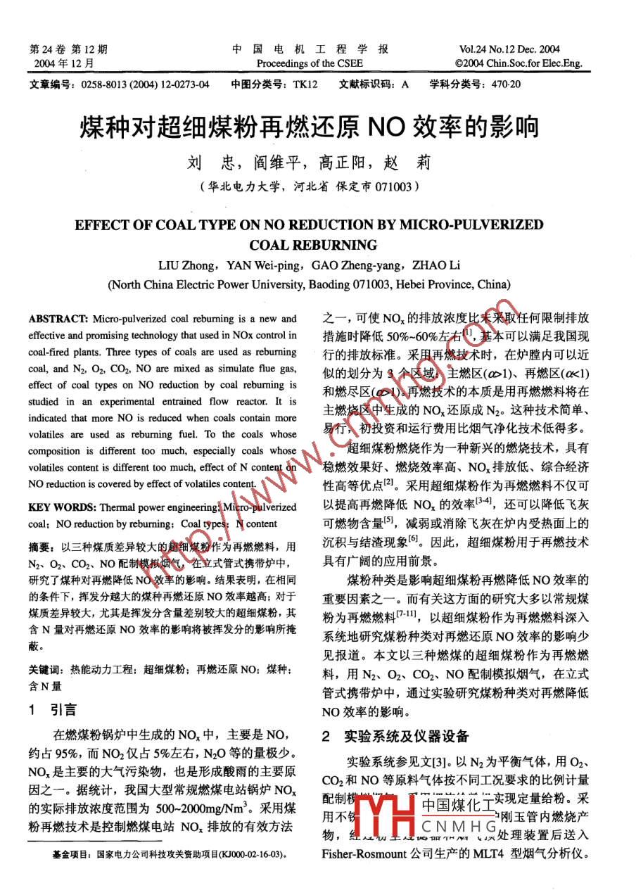 第24卷第12期中國電機工程學(xué)報Vol.24 No.12 Dec.20042004年12 月Proceedings of the CSEE⑥2004 Chin.Soc.for Elec.Eng.文章編號: 0258-8013 (2004) 12-0273-04中圖分類號: TK12文獻標識碼: A學(xué)科分類號: 470-20煤種對超細煤粉再燃還原NO效率的影響劉忠,閻維平,高正陽,趙莉(華北電力大學(xué),河北省保定市071003 )EFFECT OF COAL TYPE ON NO REDUCTION BY MICRO-PULVERIZEDCOAL REBURNINGLIU Zhong, YAN Wei-ping, GAO Zheng-yang, ZHAO Li(North China Elctric Power University, Baoding 071003, Hebei Province, China)ABSTRACT: Micro-pulverized coal reburming is a new and之一,可使NO,的排放濃度比未采取任何限制排放effective and promising technology that used in NOx control in措施時降低50%~60%左右”,基本可以滿足我國現(xiàn)coal-fired plants. Three types of coals are used as rebuming行的排放標準。采用再燃技術(shù)時,在爐膛內(nèi)可以近coal, and N2, O2, CO2, NO are mixed as simulate flue gas似的劃分為3個區(qū)域:主燃區(qū)(∞1)、 再燃區(qū)(a<1)effect of coal types on NO reduction by coal rebuming is和燃盡區(qū)(0>1)。再燃技術(shù)的本質(zhì)是用再燃燃料將在studied in an experimental entrained flow reactor. It is主燃燒區(qū)中生成的NO還原成N2。這種技術(shù)簡單、indicated that more NO is reduced when coals contain morevolatiles are used as rebumning fuel. To the coals whose易行,初投資和運行費用比煙氣凈化技術(shù)低得多。composition is different too much, especially coals whose超細煤粉燃燒作為- -種新興的燃燒技術(shù),具有volatiles content is different too much, efect of N content on穩(wěn)燃效果好、燃燒效率高、NOx排放低、綜合經(jīng)濟NO reduction is covered by effect of volatiles content.性高等優(yōu)點(2。采用超細煤粉作為再燃燃料不僅可KEY WORDS: Thermal power engineering; Micro pulverized以提高再燃降低NOx 的效率[34,還可以降低飛灰coal; NO reduction by rebuming; Coal types; N content可燃物含量5),減弱或消除飛灰在爐內(nèi)受熱面.上的摘要:以三種煤質(zhì)差異較大的超細煤粉作為再燃燃料,用沉積與結(jié)渣現(xiàn)象6。因此,超細煤粉用于再燃技術(shù)N2、02、CO2、 NO配制模擬煙氣,在立式管式攜帶爐中,具有廣闊的應(yīng)用前景。研究了煤種對再燃降低NO效率的影響。結(jié)果表明,在相同煤粉種類是影響超細煤粉再燃降低NO效率的的條件下,揮發(fā)分越大的煤種再燃還原NO效率越高;對于重要因素之一。而有關(guān)這方面的研究大多以常規(guī)煤煤質(zhì)差異較大,尤其是揮發(fā)分含量差別較大的超細煤粉,其粉為再燃燃料7-),以超細煤粉作為再燃燃料深入含N量對再燃還原NO效率的影響將被揮發(fā)分的影響所掩系統(tǒng)地研究煤粉種類對再燃還原NO效率的影響少蔽。見報道。本文以三種燃煤的超細煤粉作為再燃燃關(guān)鍵詞:熱能動力工程;超細煤粉;再燃還原NO;煤種:料,用N2、02、CO2、NO配制模擬煙氣,在立式含N量管式攜帶爐中,通過實驗研究煤粉種類對再燃降低1引言NO效率的影響。在燃煤粉鍋爐中生成的NO,中,主要是NO,2實驗系統(tǒng)及儀器設(shè)備約占95%,而NO2僅占5%左右,N2O等的量極少。實驗系統(tǒng)參見文[3]。以N2為平衡氣體,用02、NOx是主要的大氣污染物,也是形成酸雨的主要原CO2和NO等原料氣體按不同工況要求的比例計量因之一。據(jù)統(tǒng)計,我國大型常規(guī)燃煤電站鍋爐NOx配制中國煤化工實現(xiàn)定量給粉。 采的實際排放濃度范圍為500~2000mg/Nm'.采用煤粉再燃技術(shù)是控制燃煤電站NO,排放的有效方法用不銹TH剛玉管內(nèi)燃燒產(chǎn)物,經(jīng)C.NM HC處理裝置后送入基金項目:國家電力公司科技攻關(guān)資助項0(00002- 16-03)●Fisher-Rosmount公司生產(chǎn)的MLT4型煙氣分析儀。274中國電機工程學(xué)報第24卷.取樣槍的位置根據(jù)停留時間變化。煙氣分析儀在使VarioelI型元素分析儀等設(shè)備測試了這三種超細用前采用標準氣體標定,所用測試儀器可以滿足實煤粉的煤質(zhì)分析數(shù)據(jù)。煤質(zhì)分析結(jié)果見表1。驗的精度要求。爐入口: CO2濃度為15%左右,NO為100ppm左右,02濃度分別為4%左右,以N2為平衡氣。給.3實驗工況粉量分別為1.457 g/min 和1.093 g/min, 對應(yīng)的再實驗用3種原料煤粉取自電廠煤粉倉。將原煤燃燃料比分別為25%和20%。實驗溫度為1300C粉在實驗室的振篩機上進行篩分,篩取45μm篩下和1200C,對應(yīng)的實驗氣體控制流量為1.83m/hn煤粉裝瓶備用。采用德國元素分析系統(tǒng)公司生產(chǎn)的和1.95m2/n。表1煤質(zhì)分析結(jié)果Tab.1 The results of the coal-quality analysis元素分析1%工業(yè)分析1% _煤種_CaHsOnd_SasdAdWaVaa60.793.78716.280.6630.55113.04.9527.8大同煙煤56.773.5000.6801.99425.00.6423.3邢臺貧煤59.213.0548.001.0130.85326.81.0613.84實驗結(jié)果及分析煤粉再燃還原NOx過程包括揮發(fā)分的同相還4.1超細煤粉種類的影響原反應(yīng)和煤焦的異相還原反應(yīng)。當(dāng)停留時間較短實驗選用混煤(神華煙煤與準格爾褐煤,比例約時,以揮發(fā)分還原NO的同相反應(yīng)為主。在再燃區(qū)1: 1)、 大同煙煤和邢臺貧煤等三個煤質(zhì)差別較大的內(nèi),煤粉顆粒首先發(fā)生熱解,釋放出揮發(fā)分。揮發(fā)煤種。分中的CH和HCN、NH;通過以下同相還原反應(yīng)還圖1為45μm篩下三種超細煤粉在溫度1300C原N0Of12):和1200C,再燃燃料比25%和20%,氧濃度為4% .CH +NO +HCN+... .(1)條件下的再燃還原NO的實驗結(jié)果。從圖1可以看HCN+O,0H +N+...出,在相同的條