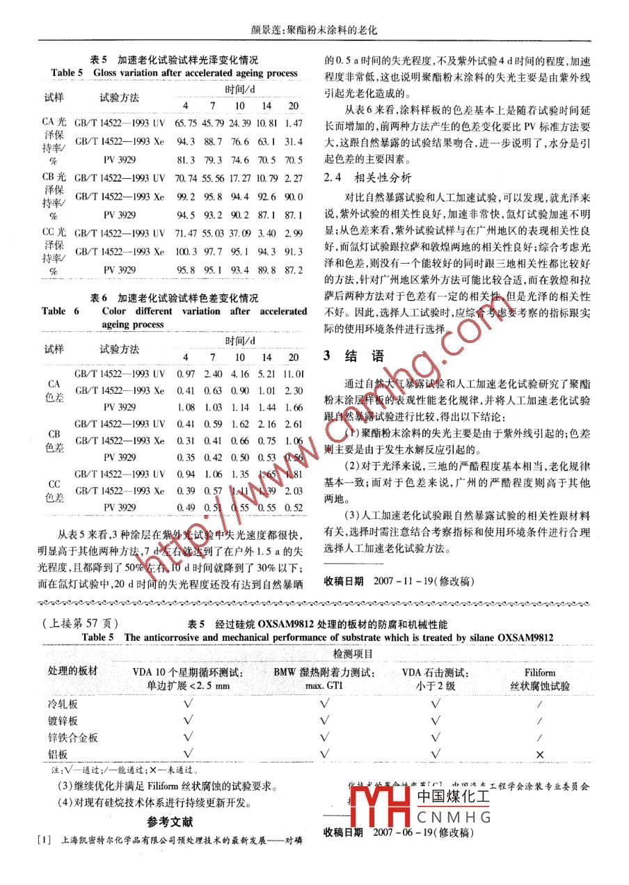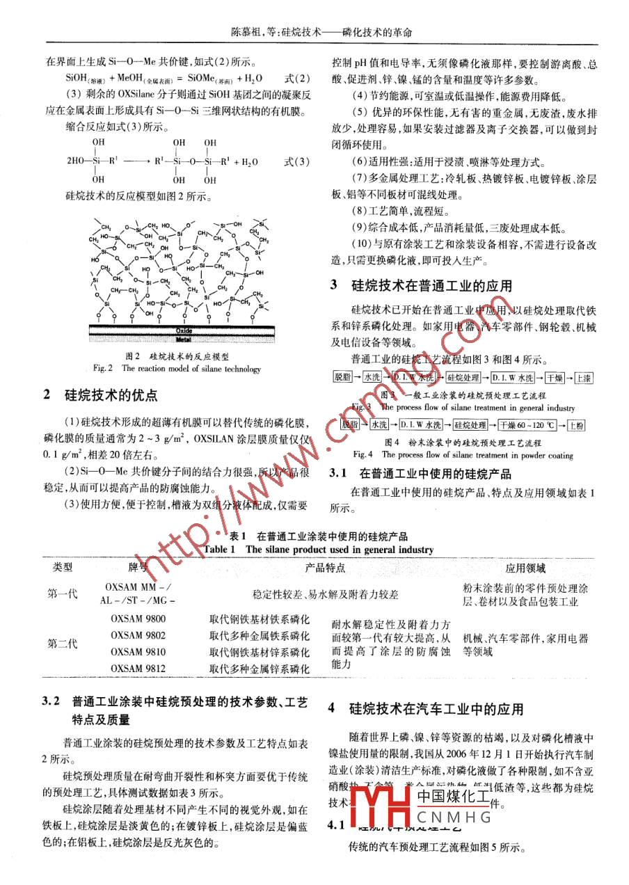 第38卷第2期涂料工業(yè)VoL.38 No.22008 年2月PAINT & COATINCS INDUSTRYFeb. 2008 .硅烷技術一磷化技術的革命陳慕祖,周杰(上海大眾汽車有限公司,上海201805 )摘要:硅烷技 術可以替代磷化技術,給表面預處理技術帶來革命性的變革。本文介紹了硅烷技術的原理、技術特點以及應用現(xiàn)狀和前景。關鍵詞:硅烷技術;磷化技術;預處理中圖分類號:TQ 639. 1文獻標識碼:A文章編號:0253 - 4312(2008 )02 -0055 -04Silane Technology- -the Revolutionary Transform of Phosphating ProcessChen Muzu, Zhou Jie(SHANGHAI VOLKSWAGEN Shanghai 201805 , China)Abstract : The silane technology, which subtitutes for phosphating, will bring revolutionary transformfor substrate pretreatment. This paper introduces the principle ,technical characteristic , current applicationand prospect of silane technology.Key Words :silane technology ;phosphating process ; pretreatment0引言低鎳和無鎳低溫磷化技術技術的應用封閉圈技術在各種金屬預處理方法中,磷化處理是最為廣泛采用的的應用.方法。在家用電器、自行車、摩托車和汽車等行業(yè)中,為了保無磷無氦脫脂技術。頂處理環(huán)保無鉻鈍化技術證涂層優(yōu)良的耐久性和防腐蝕性能,都采用磷化處理作為涂的應用,活性劑J技術的應用. 的應用裝的前處理。生物可降解11超濾和納米技術自1906年美國伯明翰的Thomas Watts Coslet首創(chuàng)磷化技低渣磷化技術無亞硝酸鹽促進術以來,磷化技術已有百年歷史。百年來,磷化技術經(jīng)久不的應用劑技術的應用衰,不斷發(fā)展,從20世紀30年代的鋅系磷化技術和鐵系磷化圖1 近年來預處理環(huán)保技術的應用狀況技術到60~70年代的改良鋅系磷化技術,隨后到90年代初期Fig.1 Thhe recent application of environment protection technology inpretreatment的無鎳磷化技術,最終到2002年氧化鐵系磷化技術。隨著磷了一層超薄的類似磷化晶體的三維網(wǎng)狀結構的有機涂層,同化技術的不斷發(fā)展創(chuàng)新,其應用領域越來越廣。為了貫徹清潔生產(chǎn)的標準,開發(fā)更加環(huán)保的技術和產(chǎn)品,時在界面形成的Si- -0- -Me 共價鍵(其中:Me=金屬),分子近年來有一些新的磷化技術得到開發(fā)及應用,具體應用狀況間力很強,將與金屬表面和隨后的涂層形成良好的附著力。硅烷技術的成功應用給磷化技術帶來革命性的變革。如圖1所示。.盡管人們做了很大的努力,依然無法從根本上改變磷化1 硅烷技術原理過程。傳統(tǒng)預處理I藝具有高能耗、重金屬離子含量高含致癌物、廢水廢渣排放多等缺陷。隨著環(huán)保和節(jié)能呼聲的日漸(1)在使用過程中,水解后的OXSilane分子[一-Si( 0R), ]增高,預處理技術正朝著保護環(huán)境、降低成本.提高質量和操中的SiOH基團與金屬表面的MeOH基團形成氫鍵,快速吸附作簡便等方向發(fā)展。于金屬表面。硅烷技術是預處理技術的最新發(fā)展方向,它具有環(huán)保、節(jié)水解反應如式(1)所示。能操作簡便成本低等磷化技術無可替代的優(yōu)點。目前硅烷R)H技術在普通工業(yè)中已開始逐步取代鐵系和鋅系磷化,在汽車中國煤化工R! +3ROH式(1)工業(yè)中正在開發(fā)試驗過程中。硅烷技術是采用OXSILAN超YHCNMHG薄有機涂層替代傳統(tǒng)的結晶型磷化保護層,在金屬表面吸附(2)在干燥過程中,Si0H基團和MeOH基團進- - 步凝聚,作者簡介:陳慕祖(1943-),原上海大眾汽車有限公司研究員級高級工程師,發(fā)表論文30佘篇。55陳慕祖,等:硅烷技術一磷化技 術的革命在界面上生成S-0--Me共價鍵,如式(2)所示。控制pH值和電導率,無須像磷化液那樣,要控制游離酸總SiOH<格液) + MeOH(金屬藺) = SiOMe(n瀾) +H20式(2)酸促進劑、鋅、鎳、錳的含量和溫度等許多參數(shù)。(3)剩余的OXSilane分子則通過SiOH基團之間的凝聚反(4)節(jié)約能源,可室溫或低溫操作,能源費用降低。應在金屬表面上形成具有Si- 0- -Si 三維網(wǎng)狀結構的有機膜。(5)優(yōu)異的環(huán)保性能,無有害的重金屬,無廢渣,廢水排縮合反應如式(3)所示。放少,處理容易,如果安裝過濾器及離子交換器,可以做到封H閉循環(huán)使用。2H0-Si- -R'RSi---Si--R'+H20 式(3)(6)適用性強:適用于浸漬噴淋等處理方式。)HH OH(7)多金屬處理工藝:冷軋板、熱鍍鋅板、電鍍鋅板、涂層硅烷技術的反應模型如圖2所示。板、鋁等不同板材可混線處理。(8)工藝簡單,流程短。(9)綜合成本低,產(chǎn)品消耗量低,三廢處理成本低。(10)與原有涂裝工藝和涂裝設備相容,不需進行設備改造,只需更換磷化液,即可投入生產(chǎn)。CH-CH3硅烷技術在普通工業(yè)的應用硅烷技術已開始在普通工業(yè)中應用,以硅烷處理取代鐵系和鋅系磷化處理。如家用電器汽車零部件、鋼輪轂、機械及電信設備等領域。圖2硅烷技術的反應模型普通工業(yè)的硅烷工藝流程如圖3和圖4所示。Fig.2 The reaction model of silane tchnology脫脂→選-D.W水洗一硅烷處理-D.L. w水洗一千燥-上乘2硅烷技 術的優(yōu)點圖3一般工 業(yè)涂裝的硅烷預處理工藝流程Fig.3 The process flow of silane treatment in general industry(1)硅烷技術形成的超薄有機膜可以替代傳統(tǒng)的磷化膜,脫脂-尿洗]- .D.1.W水洗一硅烷處理. +千燥60-120]-E圈磷化膜的質量通常為2 ~3 g/m2 , OXSILAN涂層膜質量僅僅圍4粉末涂裝中的硅烷預處理工藝流程0.1 g/m2 ,相差20倍左右。Fig.4 The poces flow of silane treatment in powder coating(2)Si- -0- -Me 共價鍵分子間的結合力很強,所以產(chǎn)品很3.1 在普通 工業(yè)中使