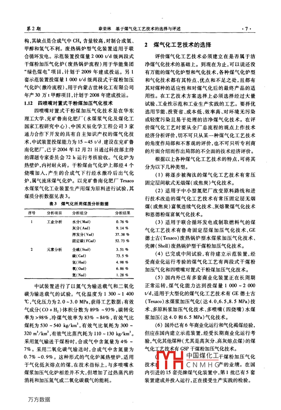 第46卷第2期化肥設(shè)計(jì)Apr. 20082008年4月Chemical Fertilizer Design.3.專題綜論基于煤氣化工藝技術(shù)的選擇與評(píng)述章榮林(中國(guó)天辰化學(xué)工程公司,天津300400)摘要:針對(duì)煤化工、煤制油煤制烯烴等工程項(xiàng)目如何選擇煤氣化技術(shù)方案和原料煤種的問題,闡述了當(dāng)今世界范圍內(nèi)各種煤氣化工藝的技術(shù)特性和優(yōu)缺點(diǎn);根據(jù)各類煤氣化技術(shù)的應(yīng)用效果對(duì)氣化爐適用范圍進(jìn)行了分類;提出了原料煤種選擇時(shí)應(yīng)考慮的問題。關(guān)鍵詞:煤氣化工藝技術(shù);煤化工;煤制油;煤制烯烴;選擇中圍分類號(hào): TQ541文獻(xiàn)標(biāo)識(shí)碼: A文章編 號(hào):104 - 8901(2008)02 -0003 -06Selection and Comment Based on Coal Gasification Process TechnologyZHANC Rong-lin( China Tian Chen Chemical Engineering Corporation, Tianjin 300400 China)Abstract: In alusion to the poblems how to select the technical scheme for coal gaifcaion and raw coal kinds used for the projects of coal chemicalengineering, oil making by coal and olefin hydroearbon making by coal and s0 on, author has described the technical characleristics and their ndvantagesand shortages for the various coal gasfication proceses within the whole world at presenl; cassification was made for the suitable scope of the gasifiersbased on the application ffeet of various coul gasification teehnologies; author has also presented the problems to be considered during selecting the kindsof aw coals.Key words; coal gaification proces tcnology; coal chermical enginering; oil making by coal; olein hydroearbon making by coal; selection我國(guó)缺油、少氣,煤炭資源相對(duì)比較豐富。在中試裝置考驗(yàn)的、從國(guó)外引進(jìn)技術(shù)的、屬于國(guó)內(nèi)具油價(jià)上漲、天然氣供不應(yīng)求的形勢(shì)下,如何利用我有自主知識(shí)產(chǎn)權(quán)的煤氣化裝置和煤氣化工藝技術(shù)國(guó)煤炭資源相對(duì)豐富的優(yōu)勢(shì)發(fā)展煤化工、煤制油和可謂是種類繁多,各種氣化工藝技術(shù)都有其特點(diǎn)、煤炭綜合利用,已成為大家關(guān)心的問題。優(yōu)缺點(diǎn)和相應(yīng)的適應(yīng)范圍,以下分別介紹。氮肥行業(yè)是我園煤炭資源消費(fèi)大戶,以煤焦為1.1 常壓固定層間歇式無煙煤(或焦炭)氣化技術(shù)原料的氮肥產(chǎn)量占氮肥總產(chǎn)量的65% ~66%。在這是目前我國(guó)生產(chǎn)氮肥的主力軍之一,其特點(diǎn)大型氮肥廠中,以天然氣為原料的占大型氮肥廠~總是采用常壓固定層空氣、蒸汽間歇制氣,要求原料生產(chǎn)能力的52%,渣油為原料的占24%,石腦油為為25 ~75 mm的塊狀無煙煤或焦炭。該氣化技術(shù)原料的占17% ,煤炭為原料的占7%。在中型氮肥存在原料利用率低、單耗高、操作繁雜、單爐發(fā)氣量廠中,以天然氣為原料的占總生產(chǎn)能力的18% ,渣低吹風(fēng)放空氣對(duì)大氣污染嚴(yán)重等缺點(diǎn),從長(zhǎng)遠(yuǎn)發(fā)油為原料的占20% ,煤炭為原料的占62%。在小型展看,屬于將逐步被淘汰的工藝。氮肥廠中,以天然氣為原料的占總生產(chǎn)能力的12 常壓固定層無煙煤(或焦炭)富氧連續(xù)氣化技術(shù)10% ,煤炭為原料的占90%。我國(guó)中小型氮肥廠大該技術(shù)由間歇式氣化技術(shù)發(fā)展而來,以富氧作都采用山西晉城無煙煤為原料,由于用戶分散,運(yùn)為氣化劑,原料可采用粒度為8~ 10 mm的無煙煤輸閑難,無煙煤運(yùn)輸途耗大,故煤炭利用率較低?;蚪固?從而提高了進(jìn)廠原料利用率。其特點(diǎn)是對(duì)目前這些中小型氨肥廠和以油為原料的氮肥廠均大氣無污染、設(shè)備維修工作量小、維修費(fèi)用低,適合不可避免地面臨著原料煤種選擇和煤炭氣化工藝于有無煙煤的地方,是對(duì)已有的常壓固定層間歇式技術(shù)方案選擇的問題。筆者針對(duì)這些亟待解決的氣中國(guó)煤化工問題進(jìn)行評(píng)述。作者簡(jiǎn)YHC N M H G人,1951年畢業(yè)于上海1各種煤氣化工藝的優(yōu)缺點(diǎn)大同大學(xué)化學(xué)工程系,教授級(jí)高級(jí)工程師.中國(guó)工程設(shè)計(jì)大師.中國(guó)天辰化學(xué)工程公司原副總工程師,從事化肥、煤化工的工程設(shè)計(jì)和我國(guó)已經(jīng)工業(yè)化的、已建立示范裝置或已通過研究工作?;试O(shè)計(jì)2008年第46卷13 魯奇固定層煤加壓氣化技術(shù)氣化要簡(jiǎn)單得多,安全可靠且投資省。單爐生產(chǎn)能該技術(shù)主要用于氣化褐煤和不黏結(jié)或弱黏結(jié)力大,目前國(guó)際上最大的氣化爐投煤量為2 000性的煤,要求原料煤熱穩(wěn)定性高、化學(xué)活性好、灰熔Vd,國(guó)內(nèi)已投產(chǎn)的氣化爐能力最大為1000 Vd。該點(diǎn)高、機(jī)械強(qiáng)度高,適用于生產(chǎn)城市煤氣和燃料氣。氣化技 術(shù)對(duì)原料煤適應(yīng)性較廣,可氣化褐煤、煙煤、由于產(chǎn)生的煤氣中含有焦油、1%的高碳?xì)浠衔?、次煙煤無煙煤高硫煤以及低灰熔點(diǎn)的劣質(zhì)煤、石10%的甲烷,且焦油的分離以及含酚污水處理程序油焦等均能用作氣化原料;但對(duì)原料煤的要求是含較為復(fù)雜,故不推薦用以生產(chǎn)合成氣?;伊康?在還原性氣氛下的灰熔點(diǎn)低于1300 C,且1.4灰熔聚流 化床粉煤氣化技術(shù).灰渣黏溫特性要好。氣化壓力從2.5、4.0、6.5 MPa中國(guó)科學(xué)院山西煤炭化學(xué)研究所在20世紀(jì)80到8.5MPa皆有工業(yè)性生產(
