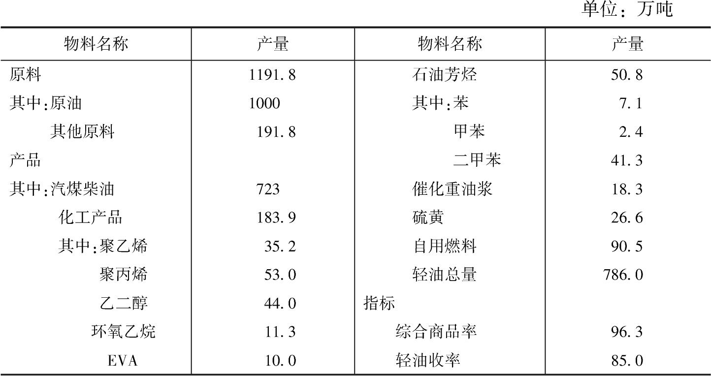 表3 煉化一體化1000萬(wàn)噸/年投入產(chǎn)出情況