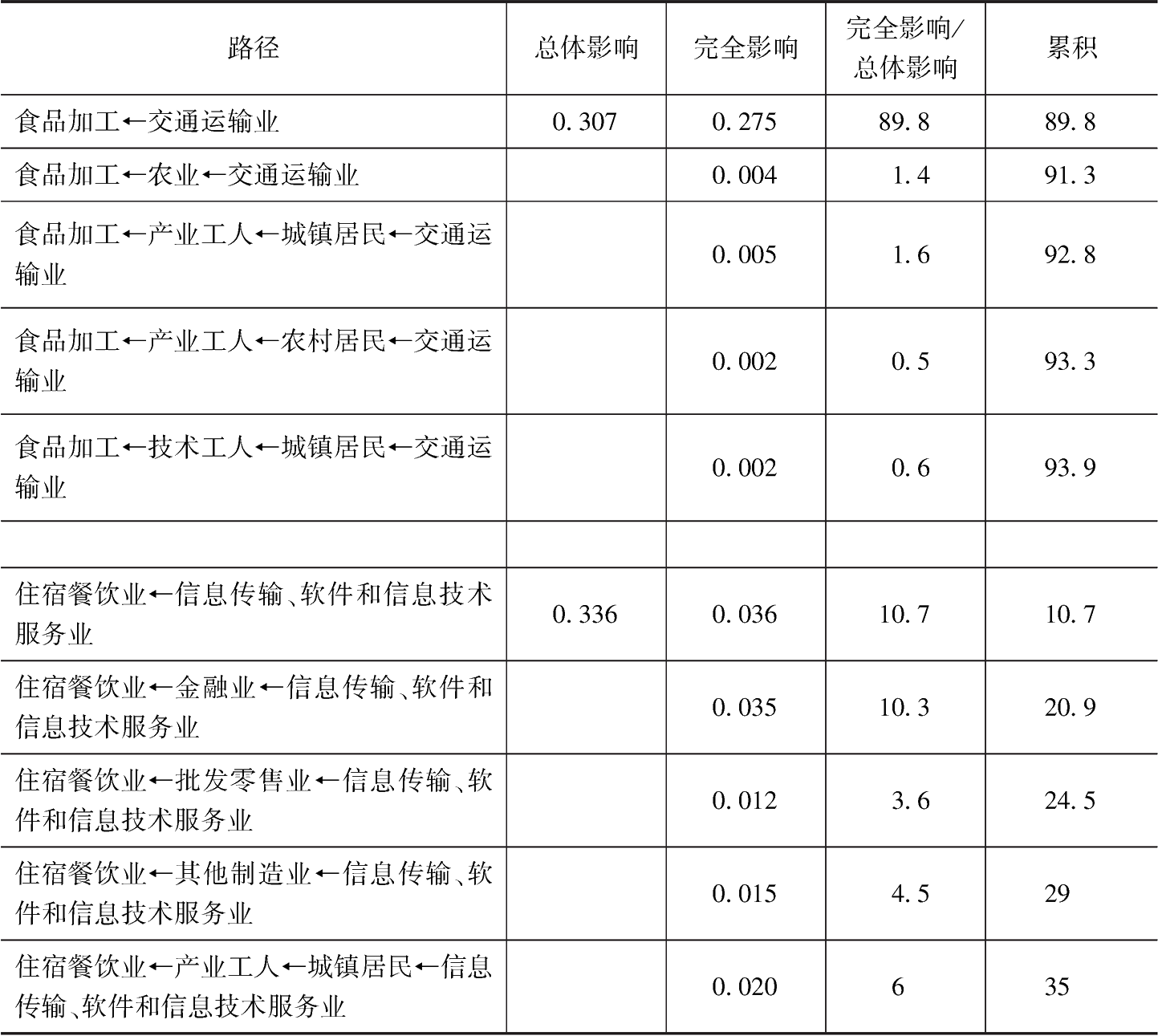 部分部門之間的相互影響主要是通過間接路徑發(fā)揮作用的。從信息傳輸、軟件和信息技術(shù)服務(wù)業(yè)對(duì)住宿餐飲業(yè)的價(jià)格傳導(dǎo)效應(yīng)看,通過兩部門之間這種最短路徑所產(chǎn)生的效應(yīng)僅占總體效應(yīng)的10.7%,其他25%的效應(yīng)是通過信息傳輸、軟件和信息技術(shù)服務(wù)業(yè)對(duì)金融業(yè)、批發(fā)零售業(yè)、其他制造業(yè)以及城市居民進(jìn)一步影響到住宿餐飲業(yè)的,而且這五條最主要路徑所包含的傳導(dǎo)效果僅占總體效果的35%。因此,信息傳輸、軟件和信息技術(shù)服務(wù)業(yè)對(duì)住宿餐飲業(yè)之間的傳導(dǎo)路徑是非常多、非常復(fù)雜的。