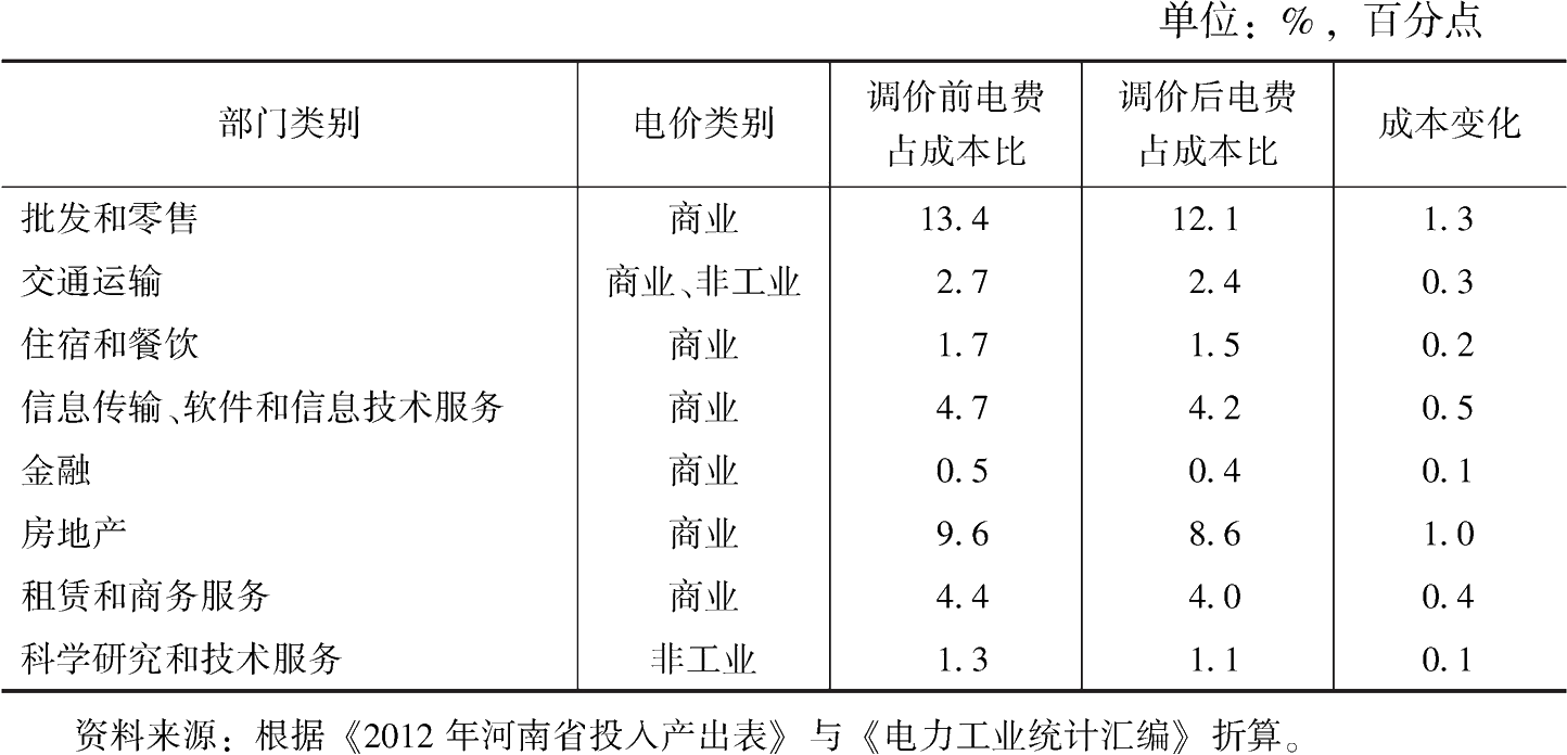 表4 河南省執(zhí)行一般工商業(yè)電價(jià)的主要部門調(diào)價(jià)前后電費(fèi)占成本支出比例