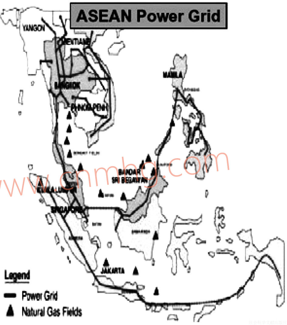 2007年8月,東盟成員國(guó)簽署了《東盟電網(wǎng)諒解備忘錄》(Memorandum of Understanding on the ASEAN Power Grid),計(jì)劃形成連接整個(gè)東盟的電力網(wǎng)絡(luò)。在《東盟遠(yuǎn)景2020》(ASEAN Vision 2020)中,東盟提出要通過(guò)東盟電網(wǎng)、泛東盟天然氣管道和自來(lái)水管道來(lái)密切內(nèi)部的能源聯(lián)系[35]。從圖4-1可以看出,東盟的電力網(wǎng)在中南半島國(guó)家內(nèi)比較密集。