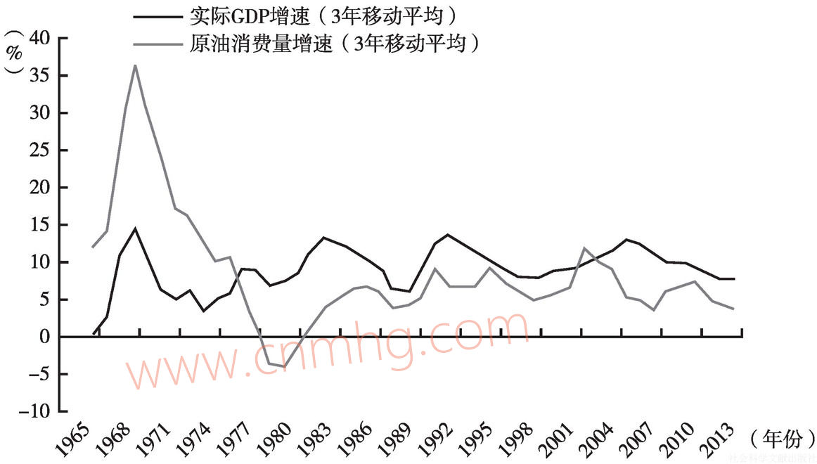 圖3.11 中國(guó)實(shí)際GDP增速與原油消費(fèi)增速