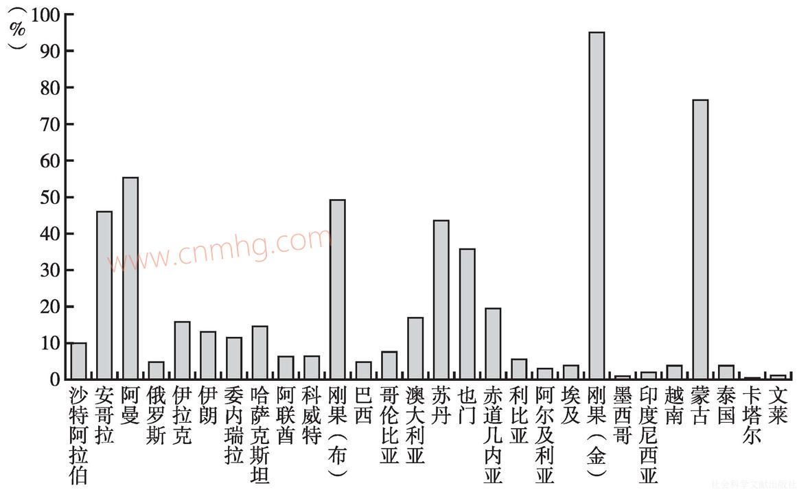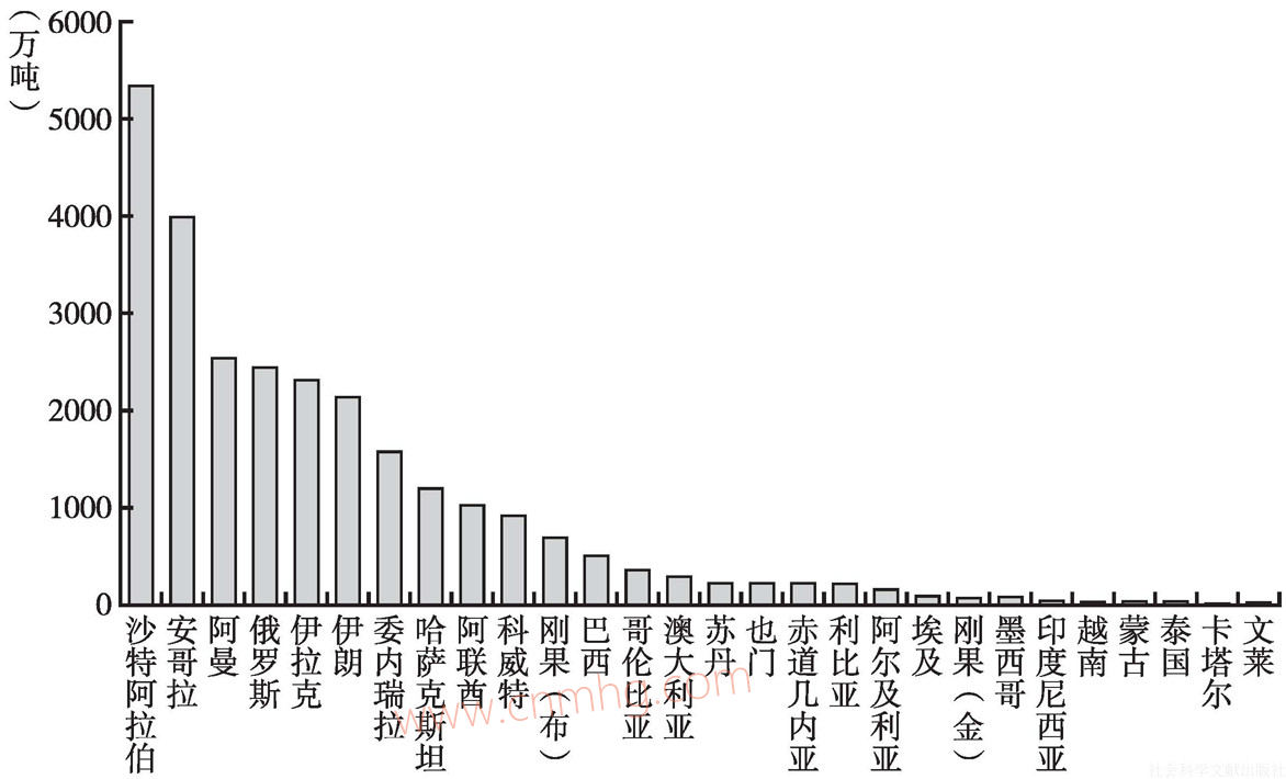 換一個(gè)角度從產(chǎn)油國(guó)的立場(chǎng)來看,有些石油出口國(guó)對(duì)中國(guó)市場(chǎng)的依賴度非常高。例如,剛果(金)和蒙古兩國(guó)產(chǎn)出的石油中70%出口至中國(guó)市場(chǎng)。另外,安哥拉、阿曼、剛果(布)、蘇丹、也門等石油產(chǎn)出國(guó)對(duì)中國(guó)市場(chǎng)的依賴度也比較高(見圖3.8)。即便是沙特阿拉伯和俄羅斯這樣的石油生產(chǎn)巨頭,其對(duì)中國(guó)市場(chǎng)的依賴度也不低——沙特阿拉伯約1/10的石油總產(chǎn)量出口至中國(guó),俄羅斯約1/5的石油總產(chǎn)量出口至中國(guó)。
