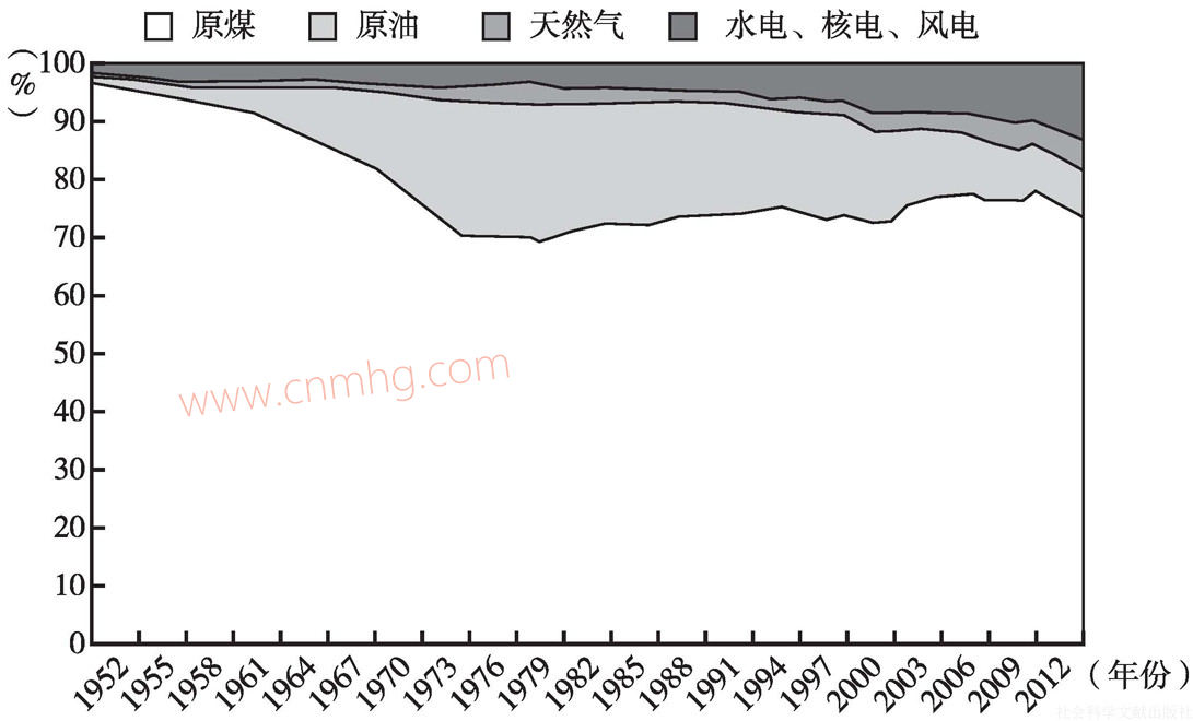 圖3.1 中國(guó)一次能源消費(fèi)結(jié)構(gòu)(1957~2014年)