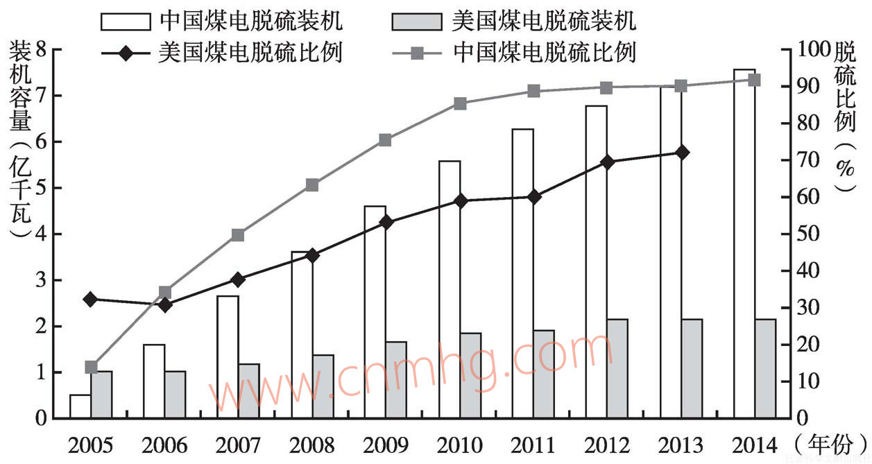 2005年以來的10年間,電站鍋爐脫硫裝機(jī)比例快速達(dá)到近100%,其中,煙氣脫硫裝機(jī)比例由2005年的14%快速提高至2013年的91.4%(比2013年的美國高20個百分點)。從脫硫機(jī)組技術(shù)采用方式看,截至2014年年底,石灰石-石膏濕法占92.46%(含電石渣法等),海水法占2.67%,煙氣循環(huán)流化床法占1.93%,氨法占1.94%,其他占1.00%。近年來,伴隨標(biāo)準(zhǔn)要求的提高,脫硫技術(shù)水平和脫硫效率快速提高,例如:濕法脫硫采用新型噴嘴、噴淋層優(yōu)化布置、增設(shè)托盤、性能增強(qiáng)環(huán)等方式,脫硫效率可提升至98%以上;針對含硫量較高的煤種或更高的環(huán)保要求,單塔雙循環(huán)技術(shù)、雙塔雙循環(huán)、串級吸收塔等脫硫技術(shù)效率可達(dá)99%以上。隨著技術(shù)水平的提高,每千瓦時二氧化硫排放量由2005年的6.4克降至2014年的1.47克,煤電二氧化硫排放績效已經(jīng)優(yōu)于澳大利亞、加拿大、英國、美國(美國2013年二氧化硫排放績效為2.28克/千瓦時)等。2005~2014年中美煙氣脫硫機(jī)組投運情況見圖6。