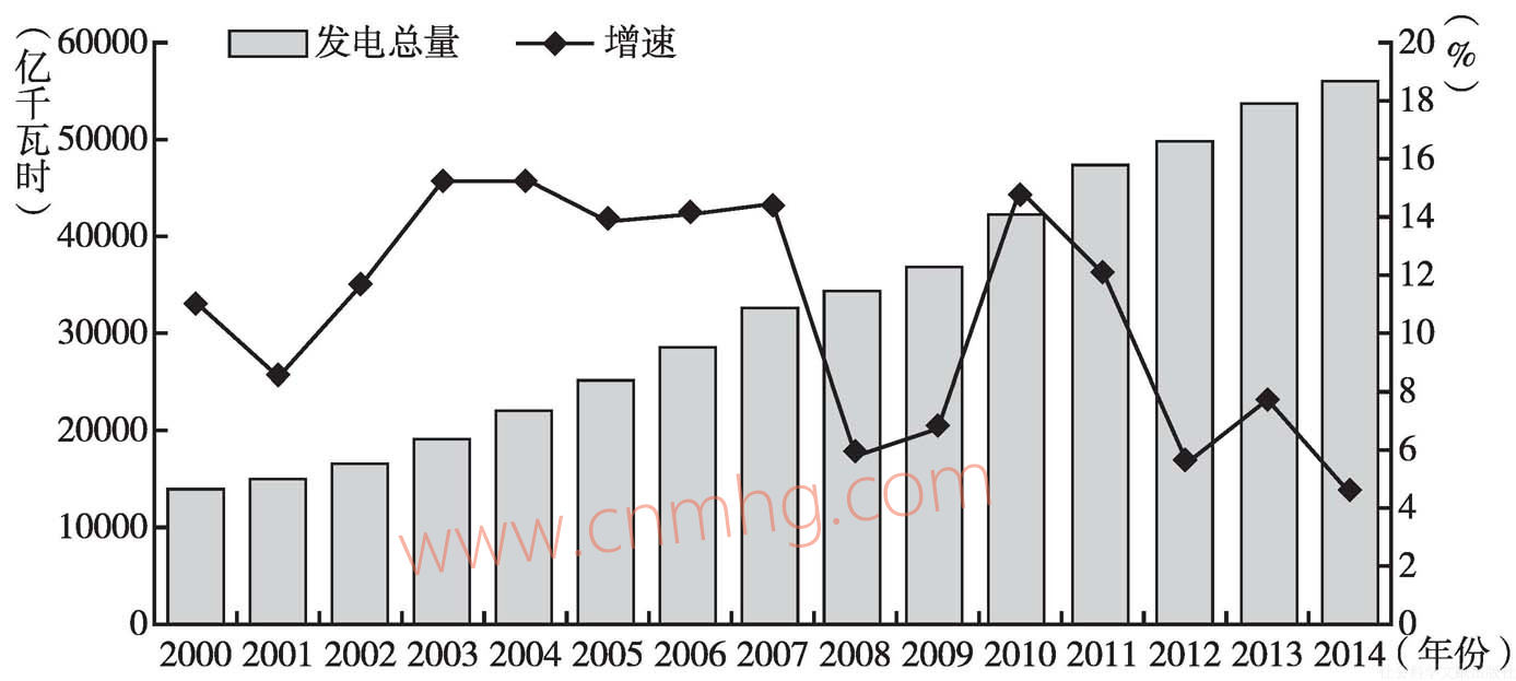 圖2 2000~2014年中國發(fā)電總量及增速變化