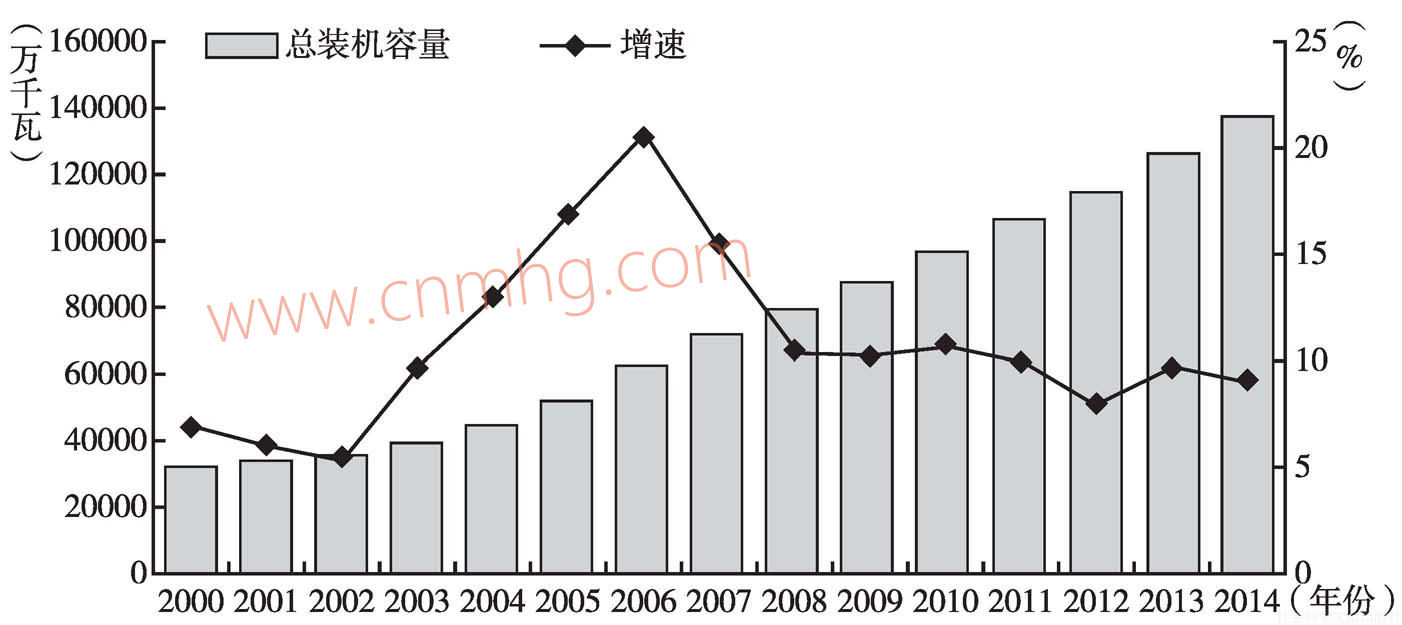 截至2014年年底,中國全口徑發(fā)電裝機(jī)容量13.7億千瓦,比2010年增長41.78%。其中,水電3.05億千瓦,比2010年增長41.1%;火電9.24億千瓦,比2010年增長30.15%;核電2008萬千瓦,比2010年增長92.90%;風(fēng)電9657萬千瓦,比2010年增長226.52%;太陽能發(fā)電2486萬千瓦,比2010年增長95倍。中國6000千瓦及以上電廠發(fā)電設(shè)備容量結(jié)構(gòu)中,煤電裝機(jī)8.31億千瓦,占中國裝機(jī)(13.33億千瓦)的62.34%,占火電裝機(jī)(9.19億千瓦)的90.42%。2000~2014年中國發(fā)電總裝機(jī)容量及其增速變化見圖1。