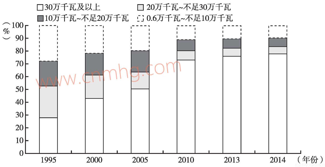 目前,中國新建煤電機(jī)組幾乎全部采用30萬供熱、60萬千瓦及以上超超臨界參數(shù)的大機(jī)組。截至2014年年底,中國單機(jī)容量100萬千瓦的超超臨界機(jī)組已經(jīng)達(dá)到69臺,是世界數(shù)量最多的國家。通過“以大代小”,2005~2014年,電力行業(yè)關(guān)停小火電機(jī)組容量超過9500萬千瓦,關(guān)停容量超過了德國、英國、意大利、韓國等國家的火電裝機(jī)容量。30萬千瓦及以上火電機(jī)組比例由1995年的27.8%提高至2014年的77.3%。在大容量、高參數(shù)機(jī)組不斷提高的同時,熱電聯(lián)產(chǎn)機(jī)組比重由2000年的13.3%增長至2014年的30.8%。汽輪機(jī)組容量等級變化情況見圖4。