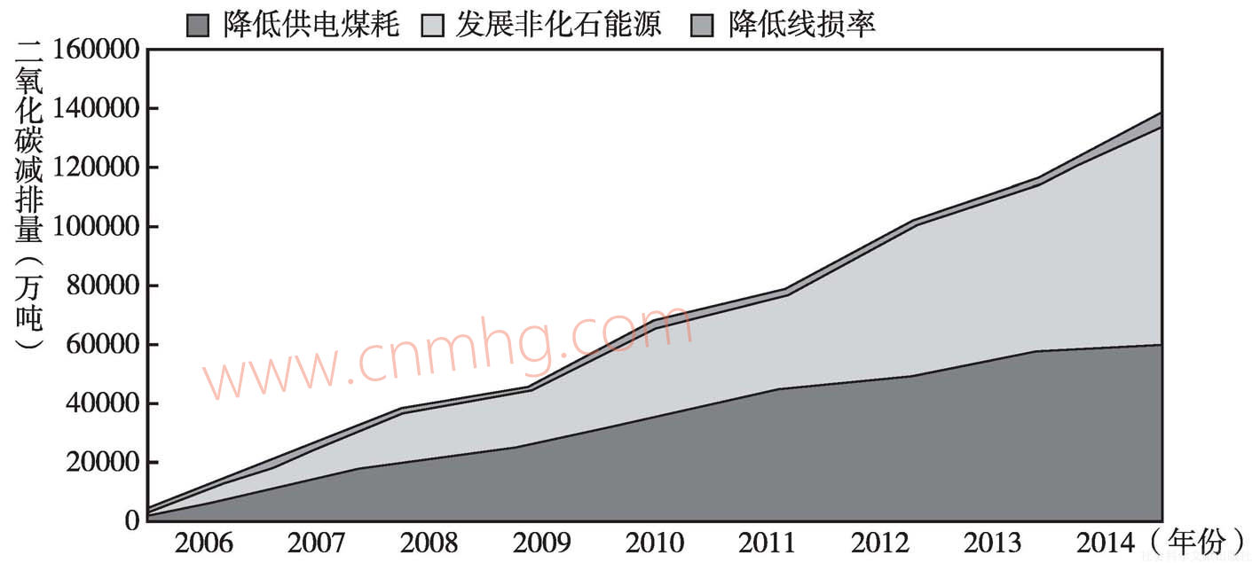 “十一五”以來,伴隨發(fā)電結(jié)構(gòu)及火電機(jī)構(gòu)的優(yōu)化,電力行業(yè)碳排放強(qiáng)度持續(xù)下降。2014年,單位火電發(fā)電量二氧化碳排放約855克/千瓦時,比2005年降低18.4%;單位發(fā)電量二氧化碳排放約645克/千瓦時,比2005年降低24.8%。以2005年為基準(zhǔn)年,到2014年,電力行業(yè)通過發(fā)展非化石能源、降低供電煤耗和降低線損率等措施累計減少二氧化碳排放約60億噸,有效減小了電力二氧化碳排放總量的增長率。以2005年為基準(zhǔn)年,各年減少二氧化碳排放情況見圖9。