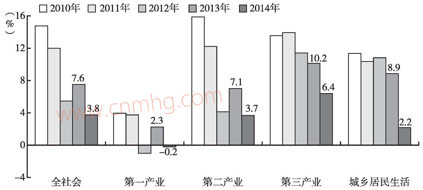 圖3 2010~2014年全社會及各產(chǎn)業(yè)用電量增長情況