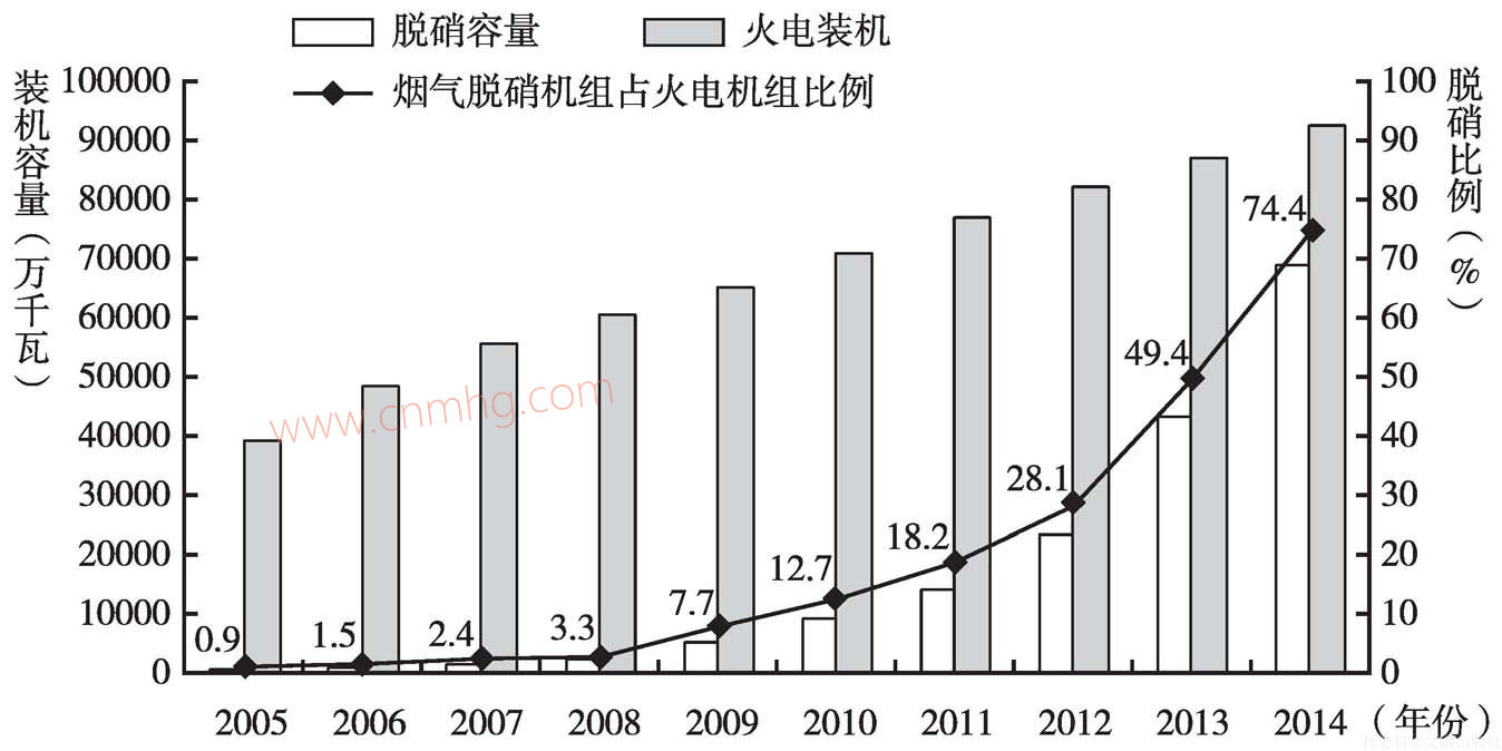 中國從2010年以來大規(guī)模采用低氮燃燒技術(shù)和選擇性催化還原法(SCR)技術(shù)降低氮氧化物排放。截至2014年年底,已投運火電廠煙氣脫硝機(jī)組容量約6.87億千瓦,占中國煤電機(jī)組容量的82.7%(比美國高20個百分點)。由于煤電氮氧化物控制力度不斷加強(qiáng),每千瓦時氮氧化物的排放量由2005年的3.6克降至2014年的1.49克。2005~2014年中國火電廠煙氣脫硝機(jī)組投運情況見圖7。