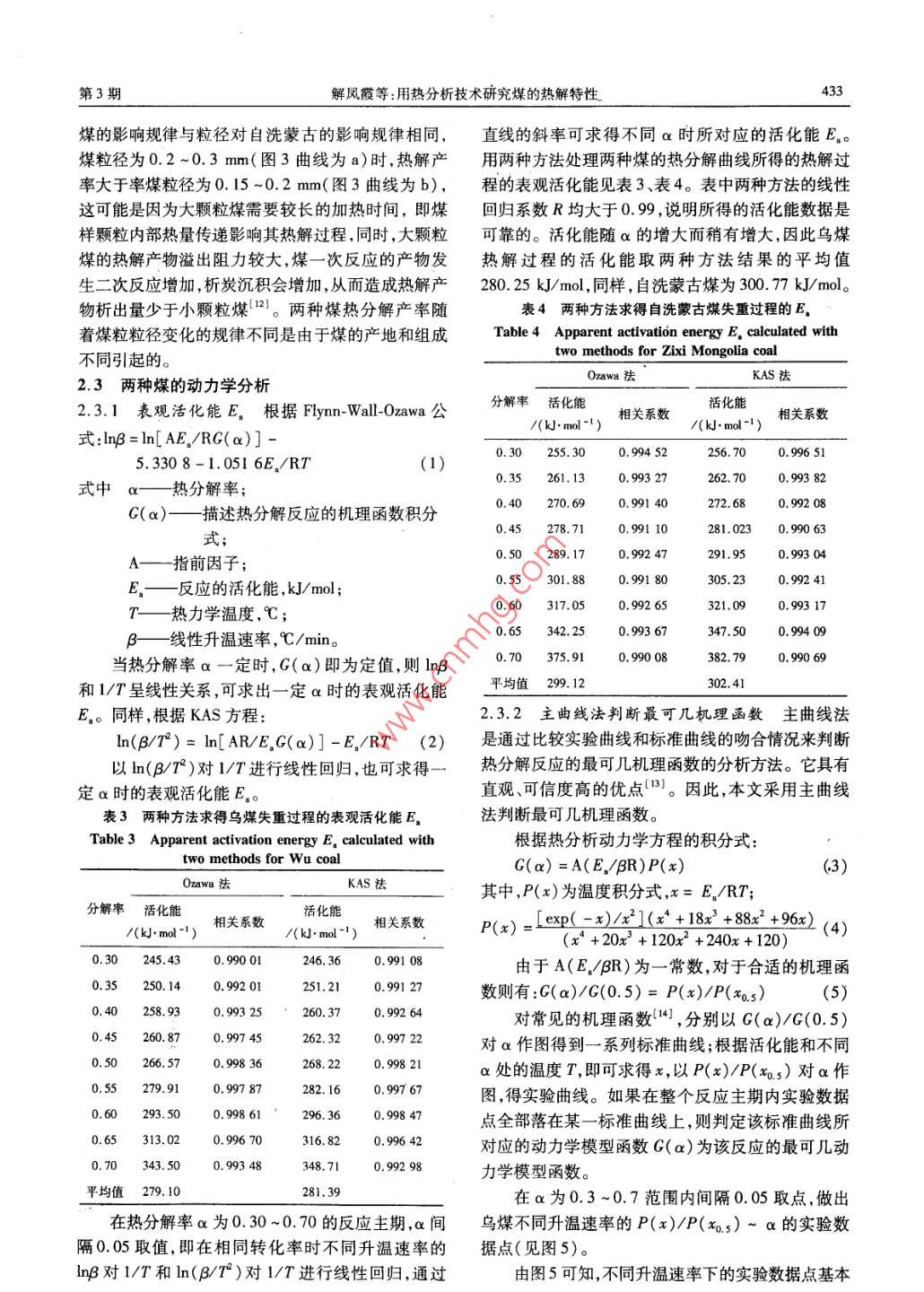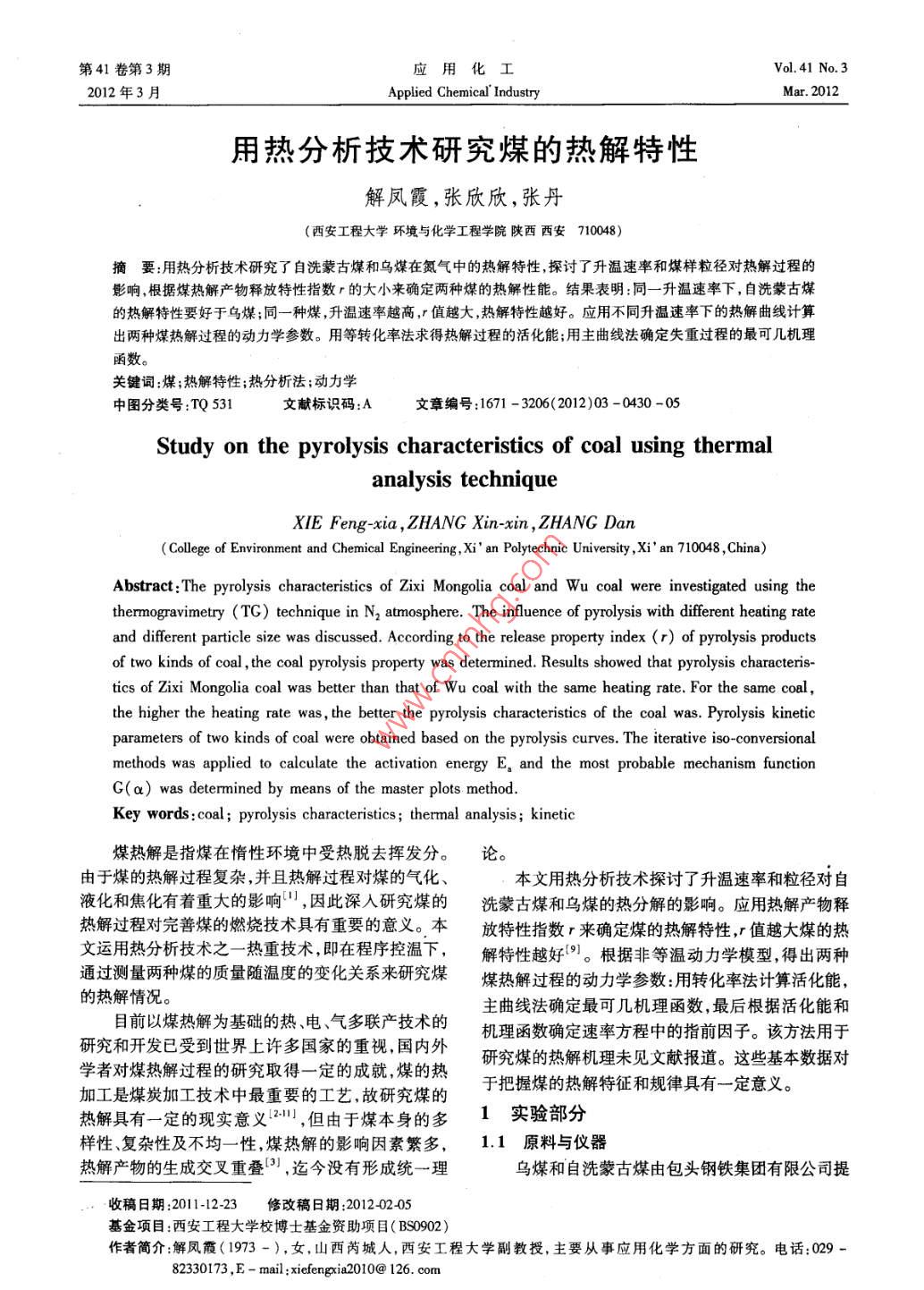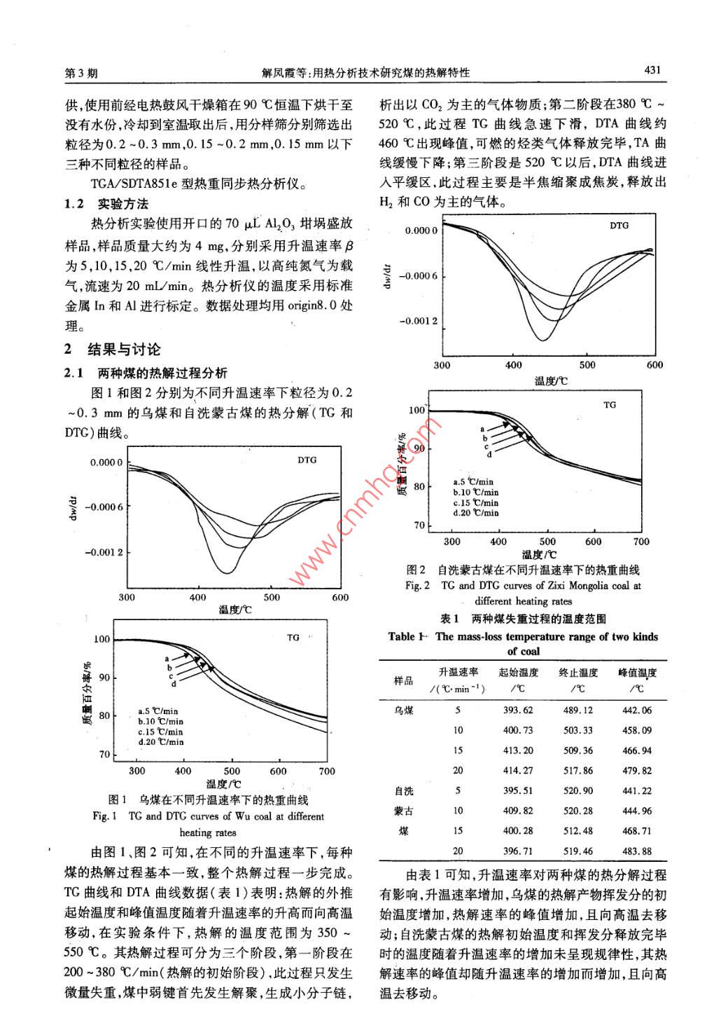 第41卷第3期應用化工Vol.41 No. 32012年3月Applied Chemical IndustryMar. 2012用熱分析技術研究煤的熱解特性解鳳霞,張欣欣,張丹(西安工程大學環(huán)境與化學工程學院陜西西安710048)摘要:用熱分析技術研究了自洗蒙古煤和烏煤在氮氣中的熱解特性,探討了升溫速率和煤樣粒徑對熱解過程的影響,根據(jù)煤熱解產(chǎn)物釋放特性指數(shù)r的大小來確定兩種煤的熱解性能。結果表明:同-升溫速率下,自洗蒙古煤的熱解特性要好于烏煤;同一種煤,升溫速率越高,r值越大,熱解特性越好。應用不同升溫速率下的熱解曲線計算出兩種煤熱解過程的動力學參數(shù)。用等轉(zhuǎn)化率法求得熱解過程的活化能;用主曲線法確定失重過程的最可幾機理函數(shù)。關鍵詞:煤;熱解特性;熱分析法;動力學中圖分類號:TQ 531文獻標識碼:A文章編號:1671 - 3206(2012)03 -0430 -05Study on the pyrolysis characteristics of coal using thermalanalysis techniqueXIE Feng-xia , ZHANG Xin-xin , ZHANG Dan(College of Environment and Chemical Engineeing, Xi' an Polytechnic University ,Xi' an 710048 , China)Abstract :The pyrolysis characteristics of Zixi Mongolia coal and Wu coal were investigated using thethermogravimetry (TC) technique in N2 atmosphere. The influence of pyrolysis with different heating rateand different particle size was discussed. According to the release property index (r) of pyrolysis productsof two kinds of coal , the coal pyrolysis property was determined. Results showed that pyrolysis characteris-tics of Zixi Mongolia coal was better than that of Wu coal with the same heating rate. For the same coal,the higher the heating rate was ,the better the pyrolysis characteristics of the coal was. Pyrolysis kineticparameters of two kinds of coal were obtained based on the pyrolysis curves. The iterative iso-conversionalmethods was applied to calculate the activation energy E。and the most probable mechanism functionG(a) was determined by means of the master plots method.Key words:coal; pyrolysis characteristics ; thermal analysis ; kinetic煤熱解是指煤在惰性環(huán)境中受熱脫去揮發(fā)分。論。由于煤的熱解過程復雜,并且熱解過程對煤的氣化、本文用熱分析技術探討了升溫速率和粒徑對自液化和焦化有著重大的影響",因此深人研究煤的洗蒙古煤和烏煤的熱分解的影響。應用熱解產(chǎn)物釋熱解過程對完善煤的燃燒技術具有重要的意義。本放特性指數(shù)r來確定煤的熱解特性,r值越大煤的熱文運用熱分析技術之一熱重 技術,即在程序控溫下,解特性越好9。根據(jù)非等溫動力學模型,得出兩種通過測量兩種煤的質(zhì)量隨溫度的變化關系來研究煤煤熱解過程的動力學參數(shù):用轉(zhuǎn)化率法計算活化能,的熱解情況。目前以煤熱解為基礎的熱、電、氣多聯(lián)產(chǎn)技術的主曲線法確定最可幾機理函數(shù),最后根據(jù)活化能和研究和開發(fā)已受到世界上許多國家的重視,國內(nèi)外機理函數(shù)確定速率方程中的指前因子。該方法用于學者對煤熱解過程的研究取得-定的成就,煤的熱研究煤的熱解機理未見文獻報道。這些基本數(shù)據(jù)對加工是煤炭加工技術中最重要的工藝,故研究煤的于把握煤的熱解特征和規(guī)律具有一定意義。熱解具有一-定的現(xiàn)實意義2,但由于煤本身的多1實驗部分樣性、復雜性及不均一性,煤熱解的影響因素繁多,1.1原料與儀器熱解產(chǎn)物的生成交叉重疊(3),迄今沒有形成統(tǒng)-理烏煤和自洗蒙古煤由包頭鋼鐵集團有限公司提收稿日期:2011-12-23修改稿日期:2012-02-05基金項目:西安工程大學校博士基金資助項目( BS0902)作者簡介:解鳳霞(1973 -),女,山西芮城人,西安工程大學副教授,主要從事應用化學方面的研究。電話:029 -82330173 ,E - mail:xiefengxia2010@ 126. com第3期解鳳霞等:用熱分析技術研究煤的熱解特性431供,使用前經(jīng)電熱鼓風干燥箱在90 C恒溫下烘干至析出以CO2為主的氣體物質(zhì);第二階段在380 C ~沒有水份,冷卻到室溫取出后,用分樣篩分別篩選出520 C,此過程TG曲線急速下滑,DTA曲線約粒徑為0.2~0.3 mm,0. 15~0.2 mm,0. 15 mm以下460 C出現(xiàn)峰值,可燃的烴類氣體釋放完畢,TA曲三種不同粒徑的樣品。線緩慢下降;第三階段是520 C以后,DTA曲線進TGA/SDTA851e型熱重同步熱分析儀。人平緩區(qū),此過程主要是半焦縮聚成焦炭,釋放出1.2實驗方法H2和CO為主的氣體。熱分析實驗使用開口的70 μL AL2O,坩堝盛放DTG0.000 0樣品,樣品質(zhì)量大約為4 mg, 分別采用升溫速率β為5,10,15,20 C/min線性升溫,以高純氮氣為載-0.0006氣,流速為20mL/min。熱分析儀的溫度采用標準金屬In和Al進行標定。數(shù)據(jù)處理均用origin8. 0處理。-0.001 22結果與討論300506002.1 兩種煤的熱解過程分析溫度/C圖1和圖2分別為不同升溫速率下粒徑為0. 2TG~0.3 mm的烏煤和自洗蒙古煤的熱分解(TG和100DTG)曲線。是子900.0000.。15C/min三-0.0006d.20 C/min70400500圖2自洗蒙古煤在不同升溫速率下的熱重曲線Fig.2 TG and DTG curves of Zixi Mongolia coal atdifferent heating rates表1兩種煤失重過程的溫 度范圍00 tTable 1- The mass-loss temperature range of two kindsof coal。90樣品升溫速率起始溫度 終 止溫度峰值溫度/( C min -1)/CC/980a.5 C/min烏煤393.62489.12442. 06b.10 C/minc.15 C/min400. 73503.33458.09413.20509. 36007002(414.27517. 86479.82自洗395. 51520.90441.22圖1 烏煤在不同升溫速率下的熱重曲線蒙古10409. 8520.28444.96Fig.1 TG and DTG curves of Wu coal at differentheating rates煤400.28512. 48468.71由圖1、圖2可知,在不同的升溫速率下,每種2396.7519. 46483. 8