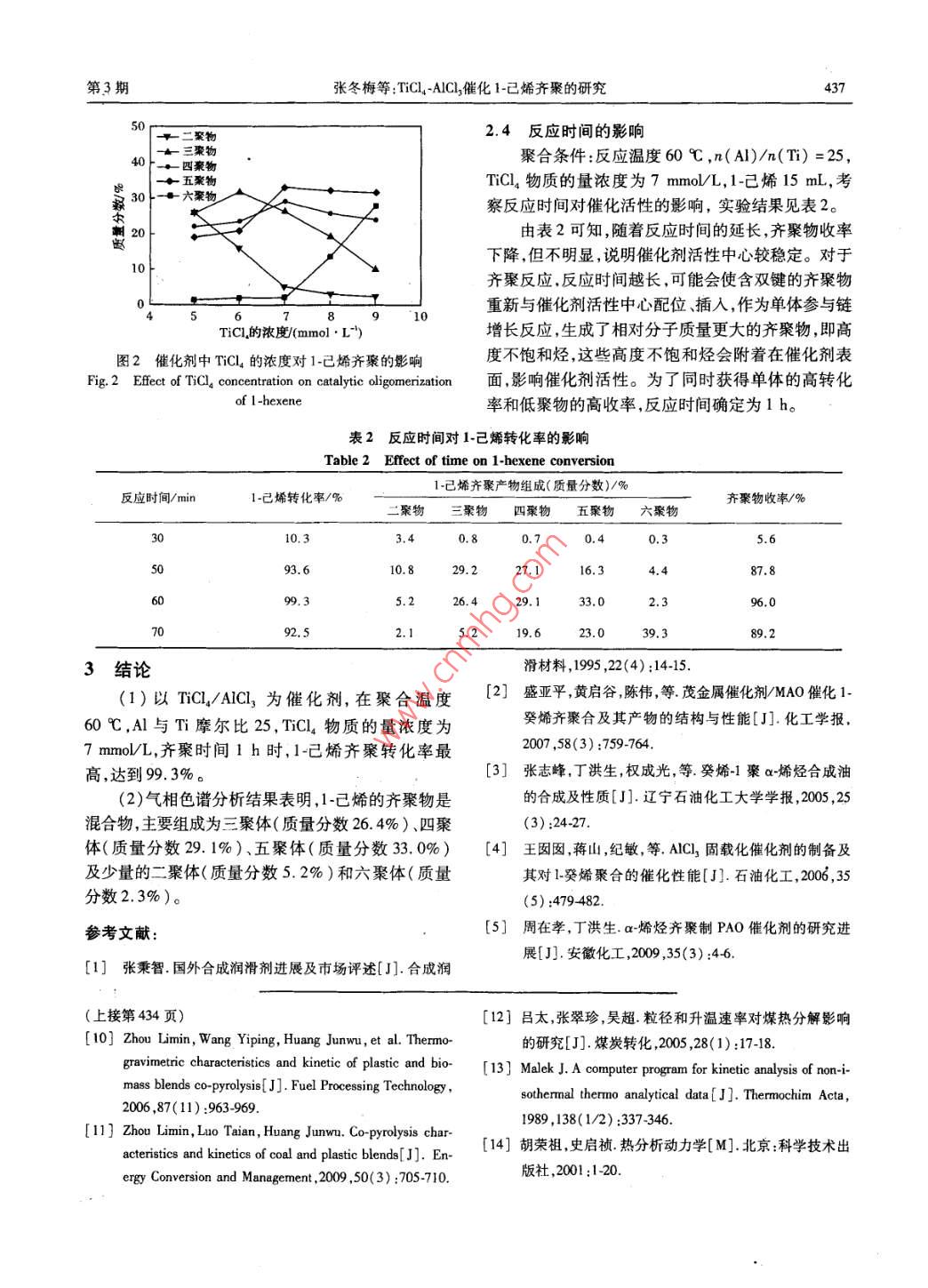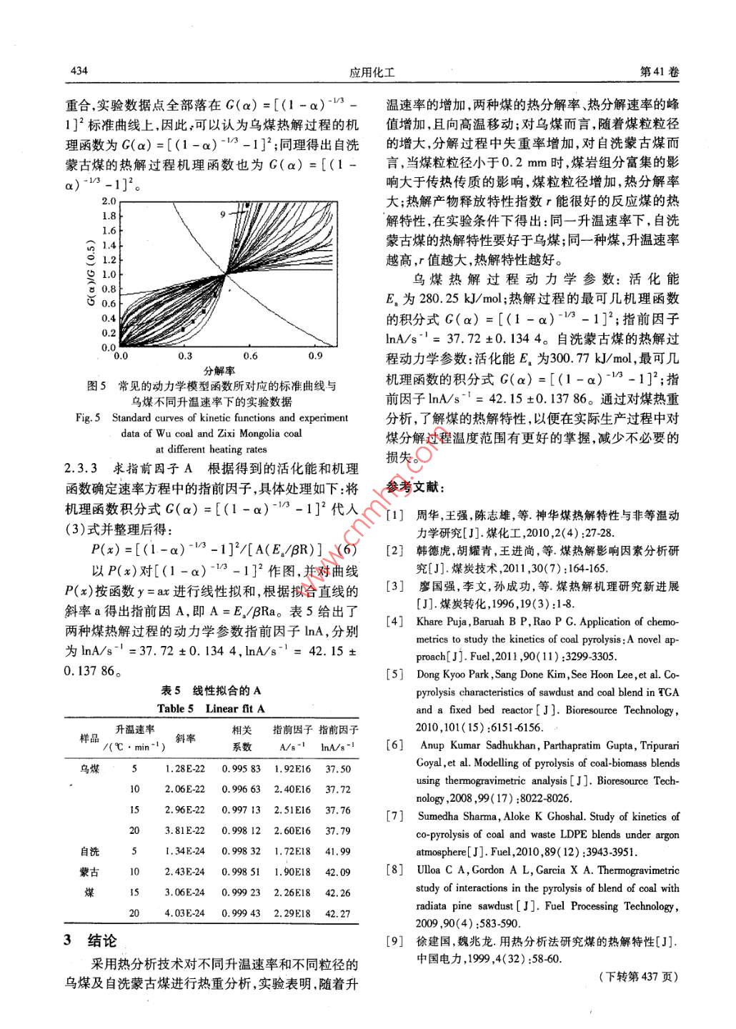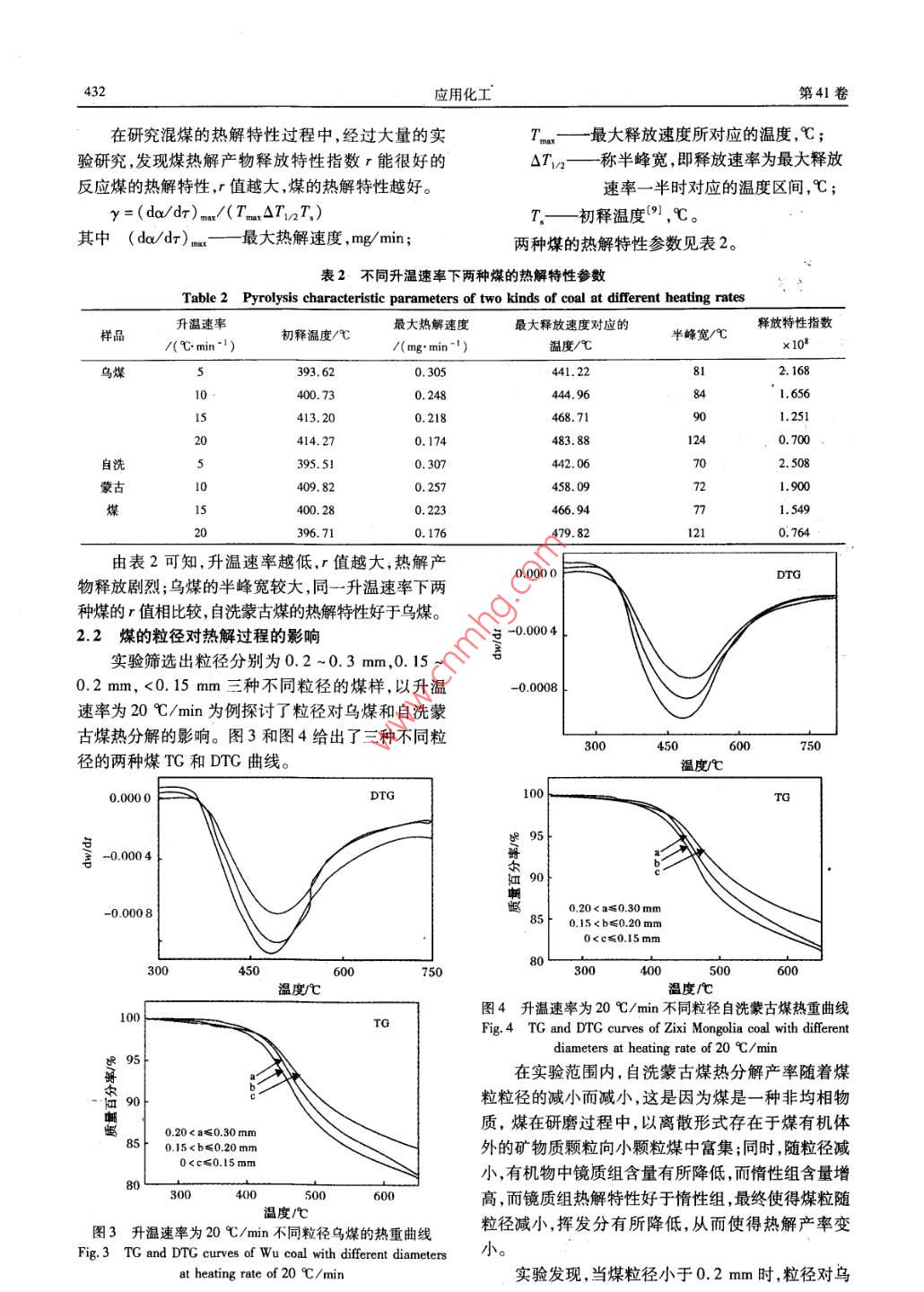 第41卷第3期應用化工Vol.41 No. 32012年3月Applied Chemical IndustryMar. 2012用熱分析技術研究煤的熱解特性解鳳霞,張欣欣,張丹(西安工程大學環(huán)境與化學工程學院陜西西安710048)摘要:用熱分析技術研究了自洗蒙古煤和烏煤在氮氣中的熱解特性,探討了升溫速率和煤樣粒徑對熱解過程的影響,根據(jù)煤熱解產(chǎn)物釋放特性指數(shù)r的大小來確定兩種煤的熱解性能。結果表明:同-升溫速率下,自洗蒙古煤的熱解特性要好于烏煤;同一種煤,升溫速率越高,r值越大,熱解特性越好。應用不同升溫速率下的熱解曲線計算出兩種煤熱解過程的動力學參數(shù)。用等轉(zhuǎn)化率法求得熱解過程的活化能;用主曲線法確定失重過程的最可幾機理函數(shù)。關鍵詞:煤;熱解特性;熱分析法;動力學中圖分類號:TQ 531文獻標識碼:A文章編號:1671 - 3206(2012)03 -0430 -05Study on the pyrolysis characteristics of coal using thermalanalysis techniqueXIE Feng-xia , ZHANG Xin-xin , ZHANG Dan(College of Environment and Chemical Engineeing, Xi' an Polytechnic University ,Xi' an 710048 , China)Abstract :The pyrolysis characteristics of Zixi Mongolia coal and Wu coal were investigated using thethermogravimetry (TC) technique in N2 atmosphere. The influence of pyrolysis with different heating rateand different particle size was discussed. According to the release property index (r) of pyrolysis productsof two kinds of coal , the coal pyrolysis property was determined. Results showed that pyrolysis characteris-tics of Zixi Mongolia coal was better than that of Wu coal with the same heating rate. For the same coal,the higher the heating rate was ,the better the pyrolysis characteristics of the coal was. Pyrolysis kineticparameters of two kinds of coal were obtained based on the pyrolysis curves. The iterative iso-conversionalmethods was applied to calculate the activation energy E。and the most probable mechanism functionG(a) was determined by means of the master plots method.Key words:coal; pyrolysis characteristics ; thermal analysis ; kinetic煤熱解是指煤在惰性環(huán)境中受熱脫去揮發(fā)分。論。由于煤的熱解過程復雜,并且熱解過程對煤的氣化、本文用熱分析技術探討了升溫速率和粒徑對自液化和焦化有著重大的影響",因此深人研究煤的洗蒙古煤和烏煤的熱分解的影響。應用熱解產(chǎn)物釋熱解過程對完善煤的燃燒技術具有重要的意義。本放特性指數(shù)r來確定煤的熱解特性,r值越大煤的熱文運用熱分析技術之一熱重 技術,即在程序控溫下,解特性越好9。根據(jù)非等溫動力學模型,得出兩種通過測量兩種煤的質(zhì)量隨溫度的變化關系來研究煤煤熱解過程的動力學參數(shù):用轉(zhuǎn)化率法計算活化能,的熱解情況。目前以煤熱解為基礎的熱、電、氣多聯(lián)產(chǎn)技術的主曲線法確定最可幾機理函數(shù),最后根據(jù)活化能和研究和開發(fā)已受到世界上許多國家的重視,國內(nèi)外機理函數(shù)確定速率方程中的指前因子。該方法用于學者對煤熱解過程的研究取得-定的成就,煤的熱研究煤的熱解機理未見文獻報道。這些基本數(shù)據(jù)對加工是煤炭加工技術中最重要的工藝,故研究煤的于把握煤的熱解特征和規(guī)律具有一定意義。熱解具有一-定的現(xiàn)實意義2,但由于煤本身的多1實驗部分樣性、復雜性及不均一性,煤熱解的影響因素繁多,1.1原料與儀器熱解產(chǎn)物的生成交叉重疊(3),迄今沒有形成統(tǒng)-理烏煤和自洗蒙古煤由包頭鋼鐵集團有限公司提收稿日期:2011-12-23修改稿日期:2012-02-05基金項目:西安工程大學校博士基金資助項目( BS0902)作者簡介:解鳳霞(1973 -),女,山西芮城人,西安工程大學副教授,主要從事應用化學方面的研究。電話:029 -82330173 ,E - mail:xiefengxia2010@ 126. com第3期解鳳霞等:用熱分析技術研究煤的熱解特性431供,使用前經(jīng)電熱鼓風干燥箱在90 C恒溫下烘干至析出以CO2為主的氣體物質(zhì);第二階段在380 C ~沒有水份,冷卻到室溫取出后,用分樣篩分別篩選出520 C,此過程TG曲線急速下滑,DTA曲線約粒徑為0.2~0.3 mm,0. 15~0.2 mm,0. 15 mm以下460 C出現(xiàn)峰值,可燃的烴類氣體釋放完畢,TA曲三種不同粒徑的樣品。線緩慢下降;第三階段是520 C以后,DTA曲線進TGA/SDTA851e型熱重同步熱分析儀。人平緩區(qū),此過程主要是半焦縮聚成焦炭,釋放出1.2實驗方法H2和CO為主的氣體。熱分析實驗使用開口的70 μL AL2O,坩堝盛放DTG0.000 0樣品,樣品質(zhì)量大約為4 mg, 分別采用升溫速率β為5,10,15,20 C/min線性升溫,以高純氮氣為載-0.0006氣,流速為20mL/min。熱分析儀的溫度采用標準金屬In和Al進行標定。數(shù)據(jù)處理均用origin8. 0處理。-0.001 22結果與討論300506002.1 兩種煤的熱解過程分析溫度/C圖1和圖2分別為不同升溫速率下粒徑為0. 2TG~0.3 mm的烏煤和自洗蒙古煤的熱分解(TG和100DTG)曲線。是子900.0000.。15C/min三-0.0006d.20 C/min70400500圖2自洗蒙古煤在不同升溫速率下的熱重曲線Fig.2 TG and DTG curves of Zixi Mongolia coal atdifferent heating rates表1兩種煤失重過程的溫 度范圍00 tTable 1- The mass-loss temperature range of two kindsof coal。90樣品升溫速率起始溫度 終 止溫度峰值溫度/( C min -1)/CC/980a.5 C/min烏煤393.62489.12442. 06b.10 C/minc.15 C/min400. 73503.33458.09413.20509. 36007002(414.27517. 86479.82自洗395. 51520.90441.22圖1 烏煤在不同升溫速率下的熱重曲線蒙古10409. 8520.28444.96Fig.1 TG and DTG curves of Wu coal at differentheating rates煤400.28512. 48468.71由圖1、圖2可知,在不同的升溫速率下,每種2396.7519. 46483. 8